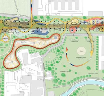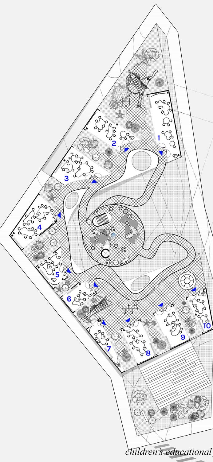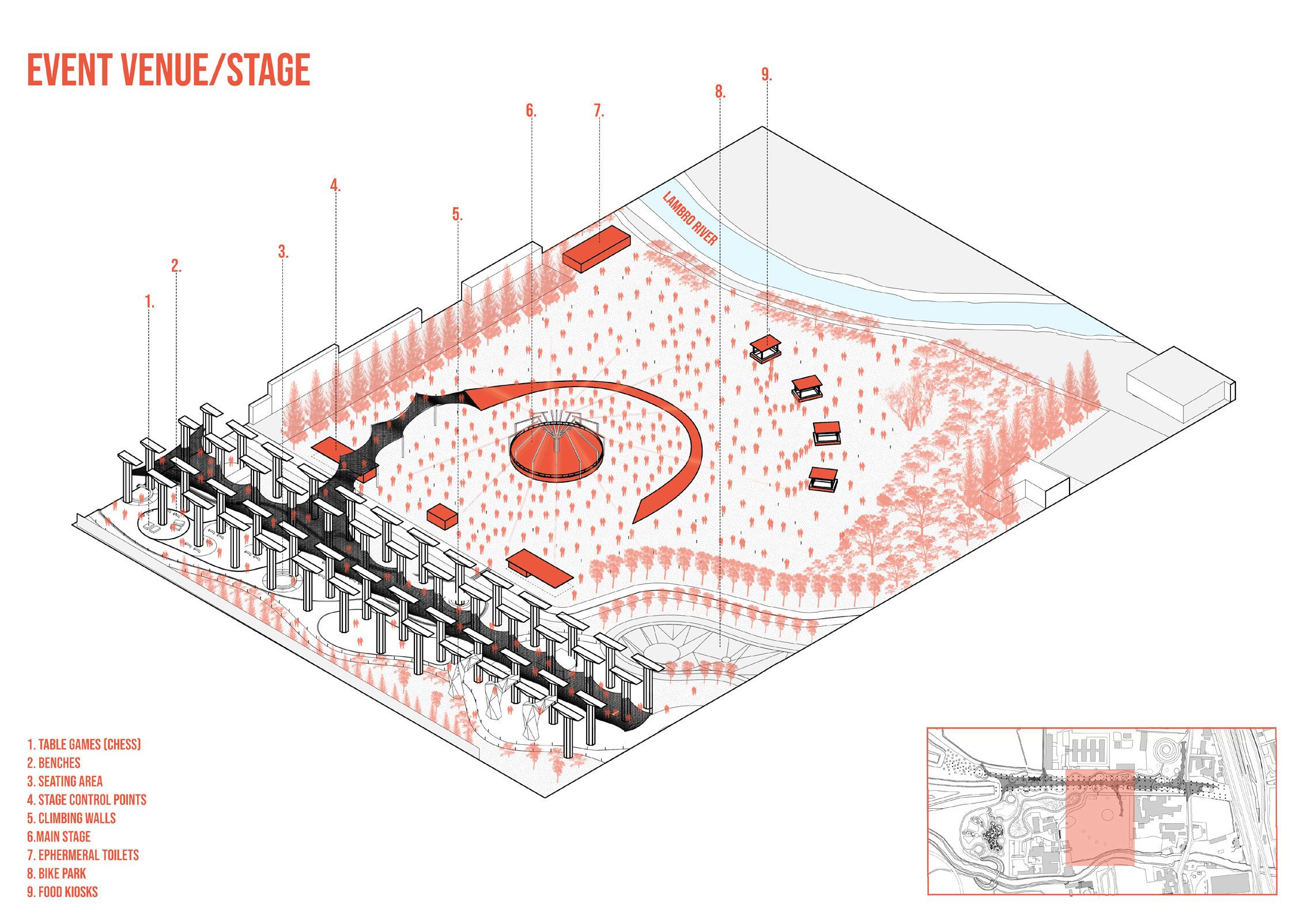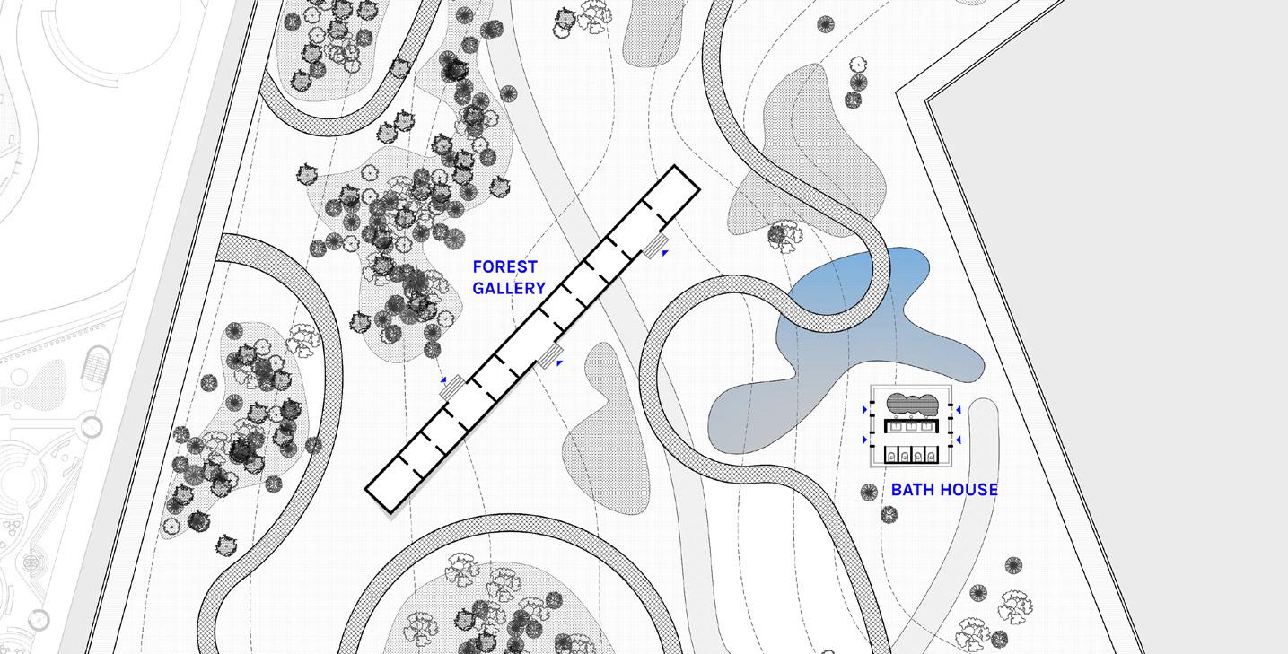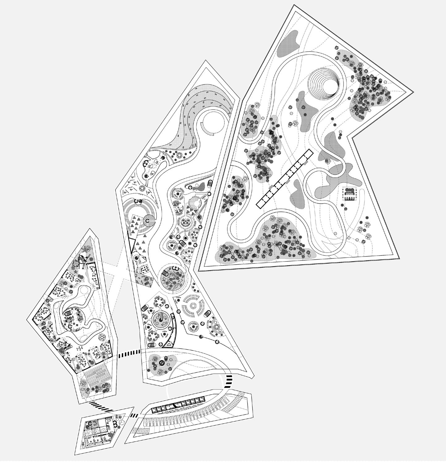 A multi-functional park translated into a scattered-objects architectural approach creating a similar experience to finding lost artifacts in the forest.