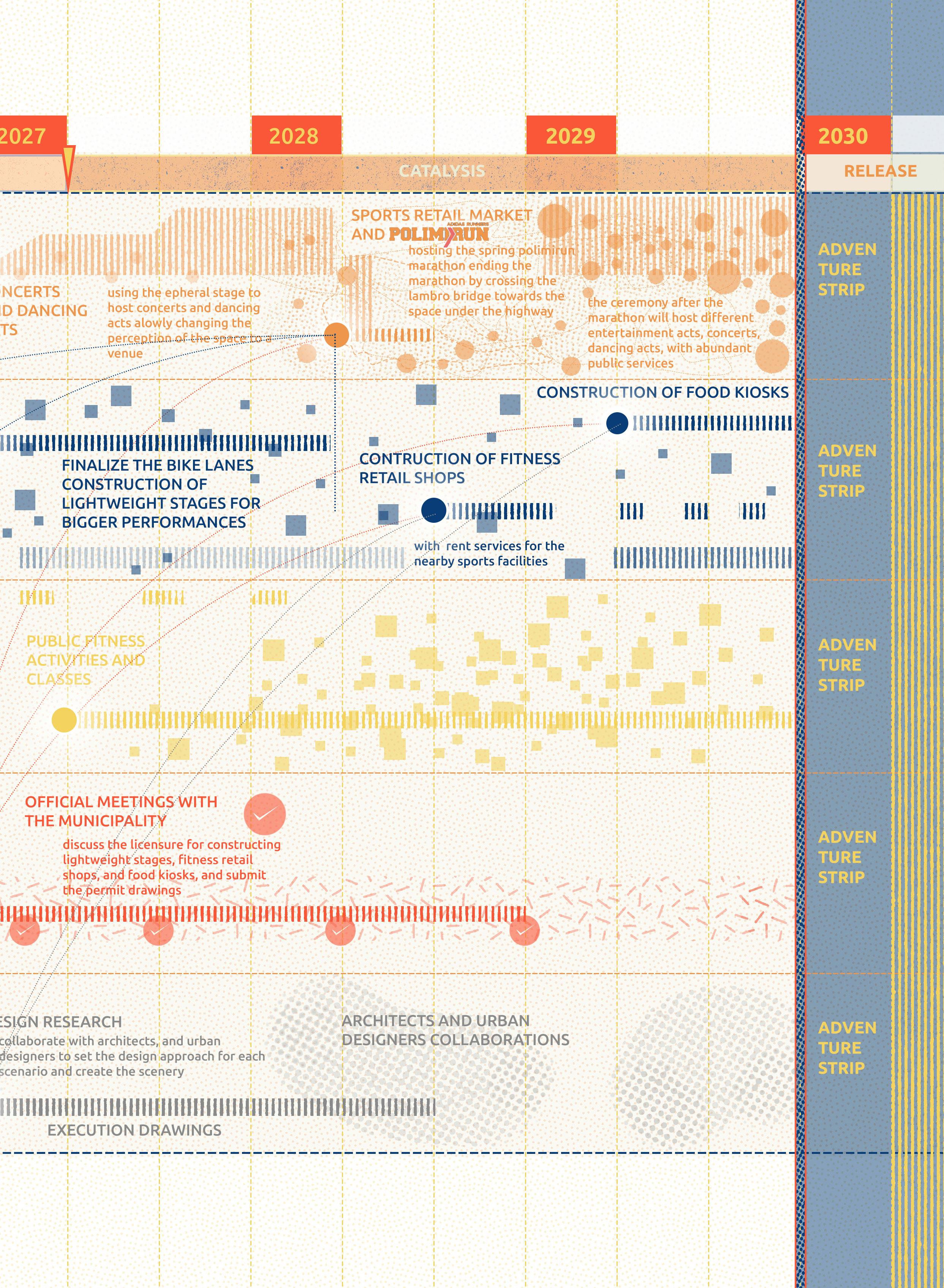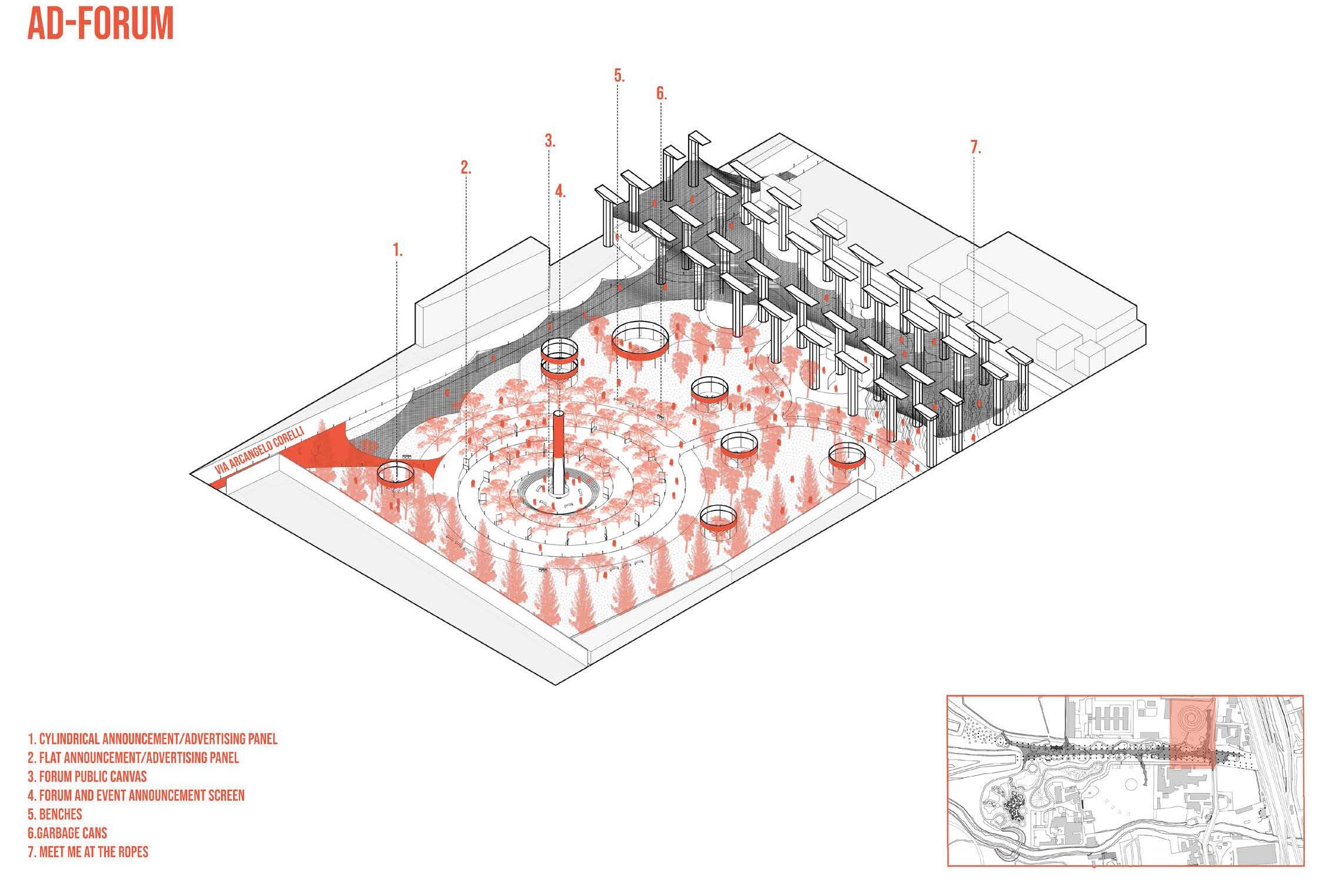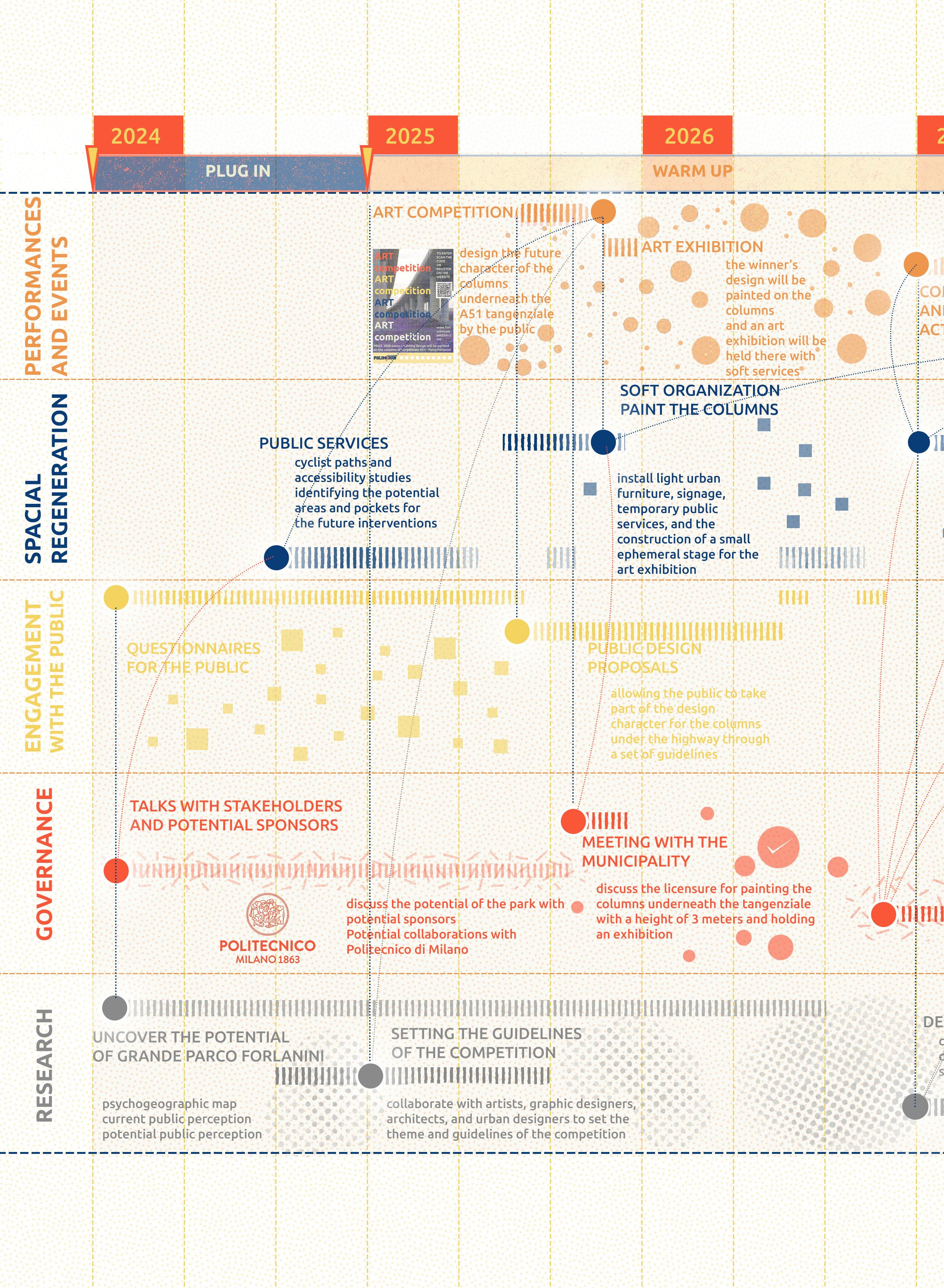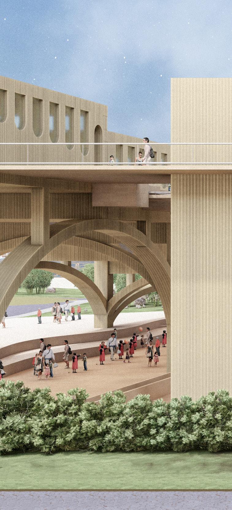 Under the highway, a vibrant oasis blooms. Transforming neglected space beneath Tangenziale East into a vibrant urban hub in Parco Forlanini, bridging East-West sides with sports, culture, and green pathways for enhanced connectivity and community engagement.”