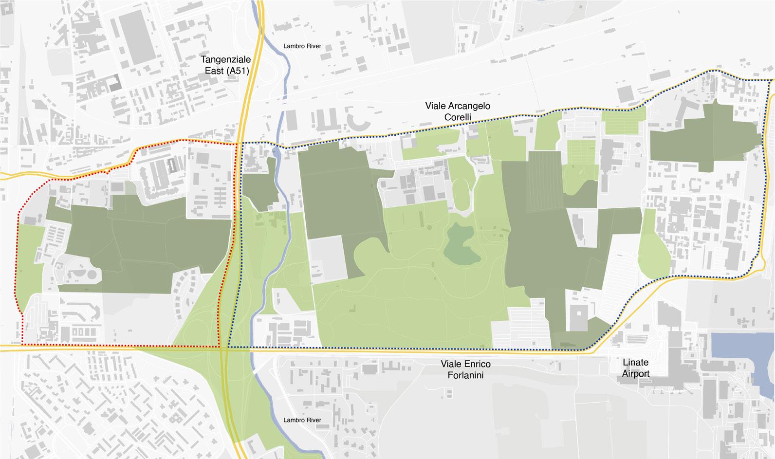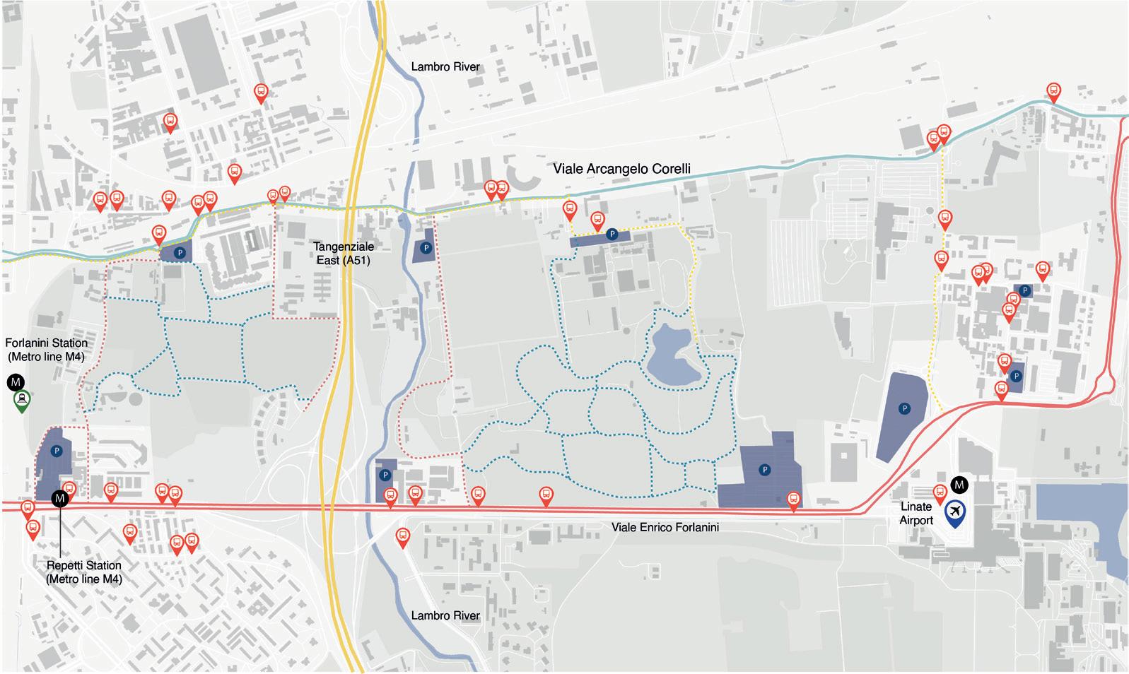 It integrates existing parks and new developments, with Parco Forlanini on the east playing a key role.