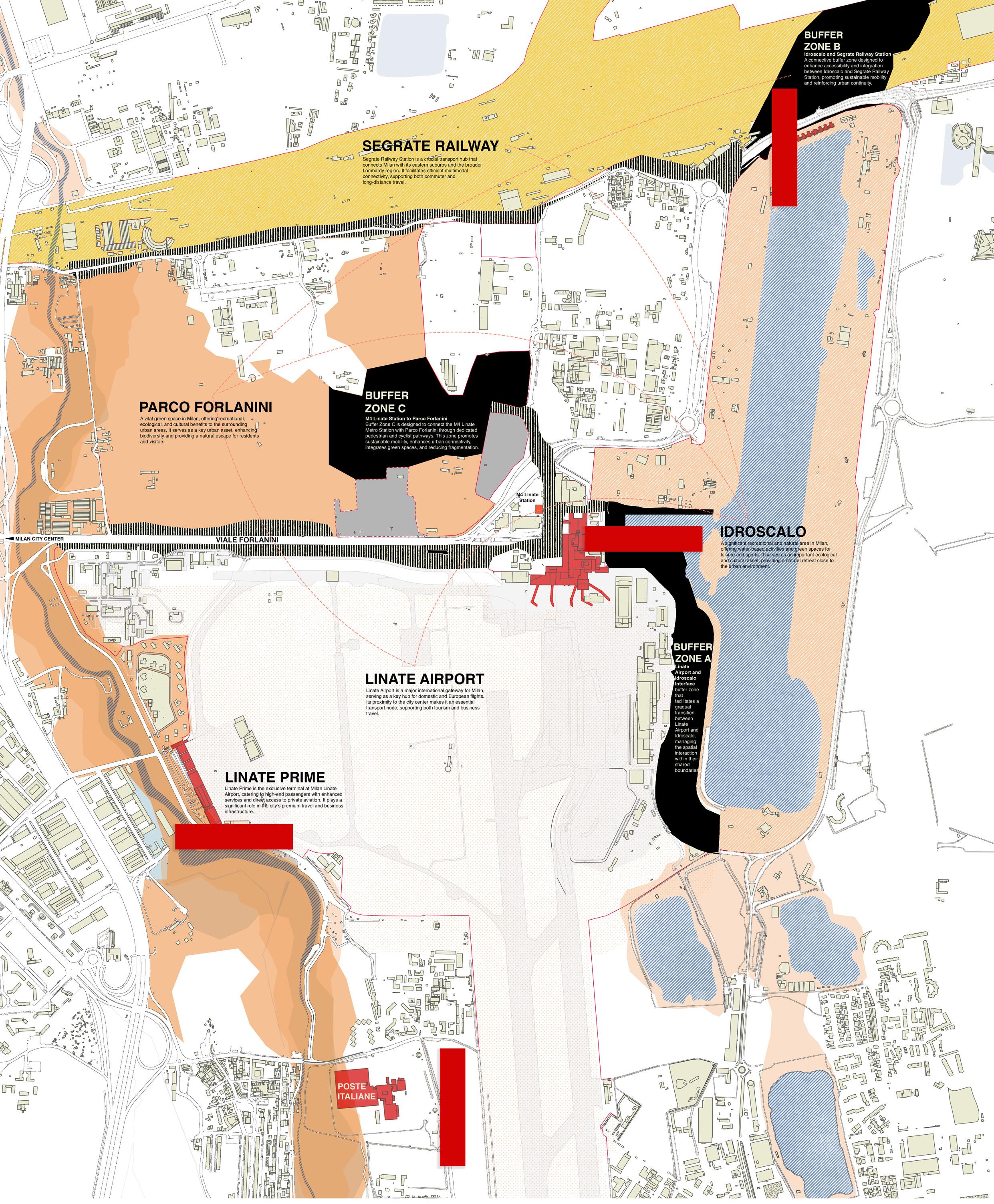 The Milan East Gate Hub, a strategic zone anchored by Linate Airport, Idroscalo Park, and Segrate Railway Station, embodies a paradox of connectivity. While Metro Line 4 links it efficiently to central Milan, the site’s intra-connectivity falters: three large infrastructures coexist as isolated islands, separated by underutilized buffers and rigid borders. Idroscalo’s aquatic leisure space, Linate’s airside logistics, and Segrate’s rail interchange operate in silos, their adjacencies fractured by fences, parking lots, and ecological degradation.