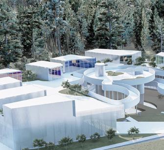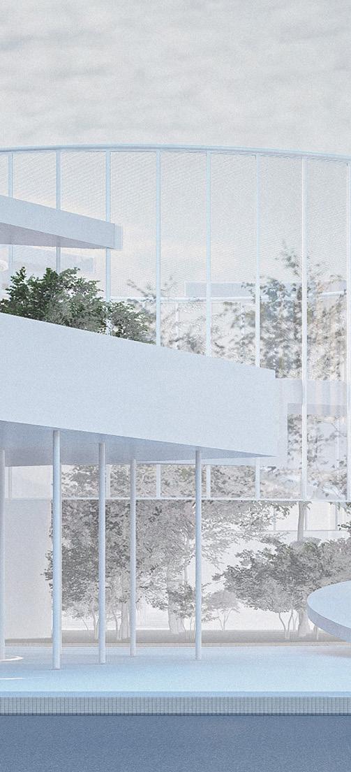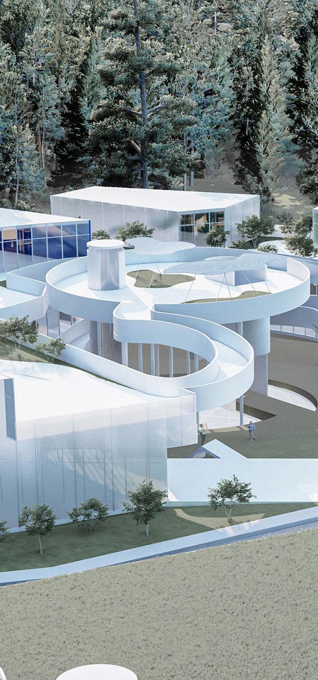 First greeted by the commercial center’s welcoming sculpture and water feature, a path opens towards the rest of the commercial space it twists through restaurants and cafes towards the spa and fitness center at the project’s calmest and most serene and ends in an opening towards the sculptural park. The sculptural park is a journey guided from object to the next including sculptures, an amphitheater, and a bathhouse, above bodies of water and landscapes and through the preserved thicket of trees always in view of the gallery which serves as an exhibition space for all kinds of local art events. The primary school stands from one side as an ethereal monolith, broken in the middle by the colors of joy and the forms that follow it. Its form allows for privacy from one side and an introverted vibrant space from the other. In contrast, the management company is a set of floating boxes inside a threedimensional grid coated with a simple glass façade that creates stimulating spaces while promoting transparency and a collaborative workspace.