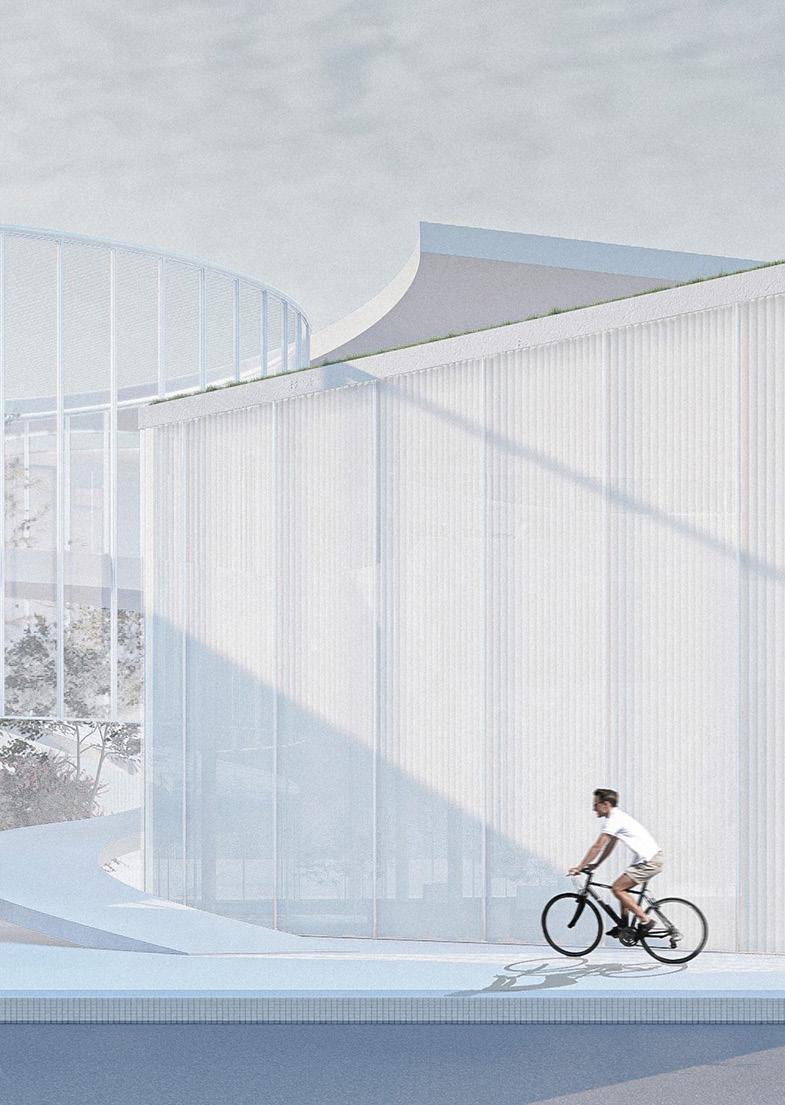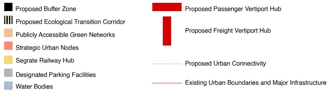 This project redefines the East Gate as a multi-scalar urban threshold, leveraging hybrid mobility and tactical spatial interventions. A key proposal integrates an electric VTOL network connecting Milan’s three airports (Linate, Malpensa, Bergamo), with a vertiport at LinateIdroscalo acting as an anchor. The VTOLs address regional mobility gaps (30% of missed air connections stem from slow ground transfers) while catalysing local synergies. Urbanistically, the vertiport is conceived not as a standalone terminal, but as a porous mediator: a colonnade of vegetated steel pillars softens the airside boundary, directing flows toward Idroscalo’s expanded wetlands, while a razorthin crimson polymer reinforced border compresses the vertiport’s air side, freeing space for public realms.