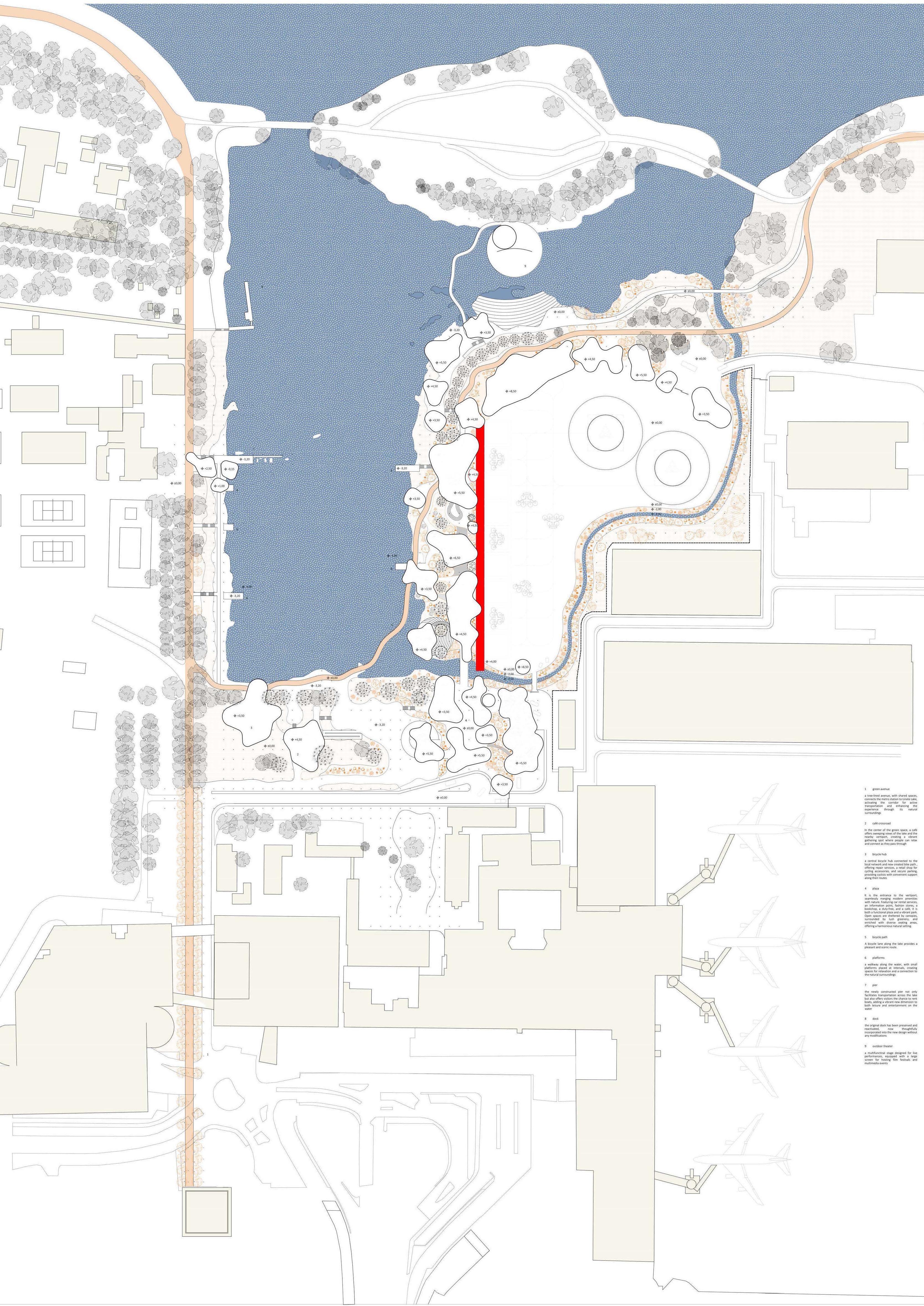 Critically, the design reactivates interstitial buffers through phased phytoremediation and modular boardwalks, stitching Idroscalo, a historic hydroplane basin, to Linate Airport. The project applies principles of mobility justice and programmatic porosity, transforming infrastructural borders into layered exchanges where transit, ecology, and civic life intersect.