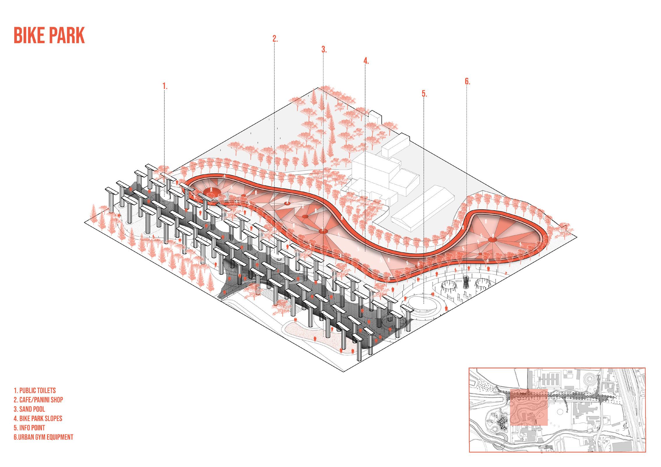 a central bicycle hub connected to the local network and new created bike path, offering repair services, a retail shop for cycling accessories, and secure parking, providing cyclists with convenient support along their routes
