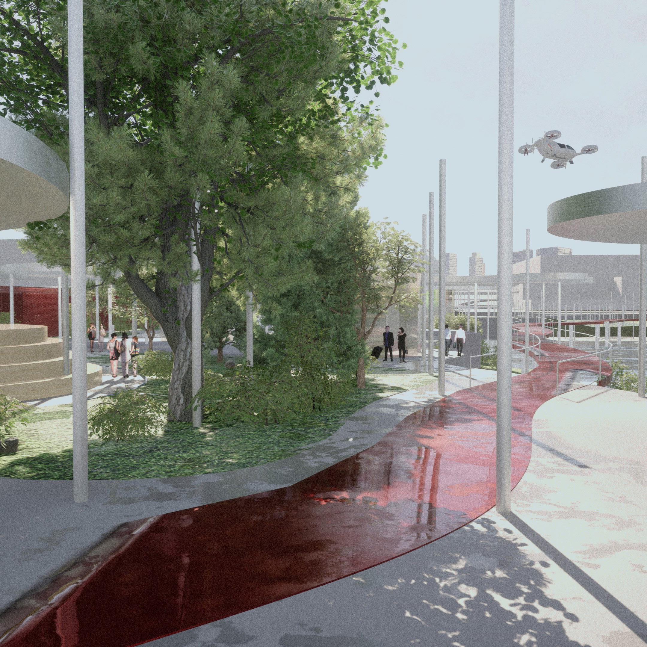 It is the entrance to the vertiport, seamlessly merging modern amenities with nature. Featuring car rental services, Ian information point, fashion stores, a bookshop, a duty-free, and a café, it is both a functional plaza and a vibrant park. Open spaces are sheltered by canopies, surrounded by lush greenery, and enriched with diverse seating areas, offering a harmonious natural setting.