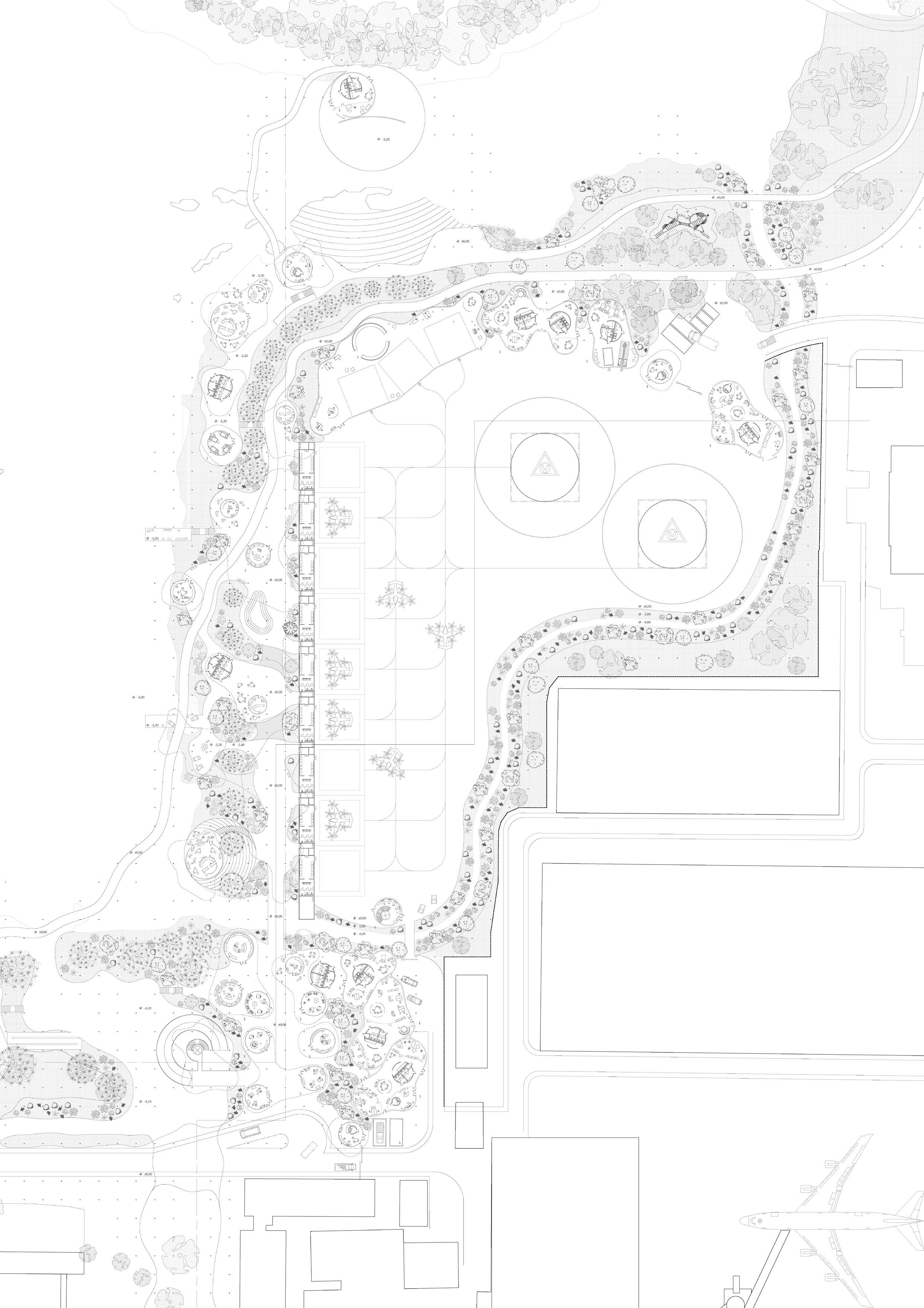 The geometric logic of the land-side composition emerges from the living heritage of Idroscalo’s magnificent trees. Their radii and spatial imprints inform a design strategy that orchestrates built form and public realm in a seamless interplay of infrastructure and ecology. Rather than imposing rigid spatial order, the intervention maneuvers around these arboreal anchors, embedding movement, gathering spaces, and urban interfaces within their organic rhythms.