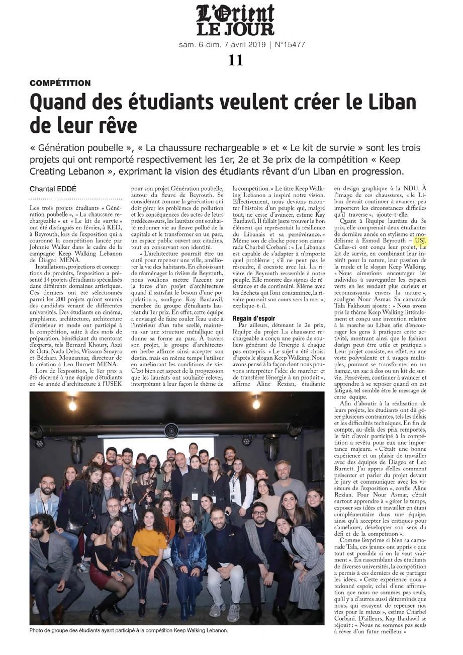 The innovative project recently won the Johnnie Walker “Keep Walking Expo,” selected by judges and expo visitors after competing with other architecture, interior design, film, graphic design, product design and fashion design projects from students across the country. Over 200 projects creatively interpreting the phrase “Keep Walking Lebanon” were initially submitted for the competition but only 14 were selected to be showcased at the expo