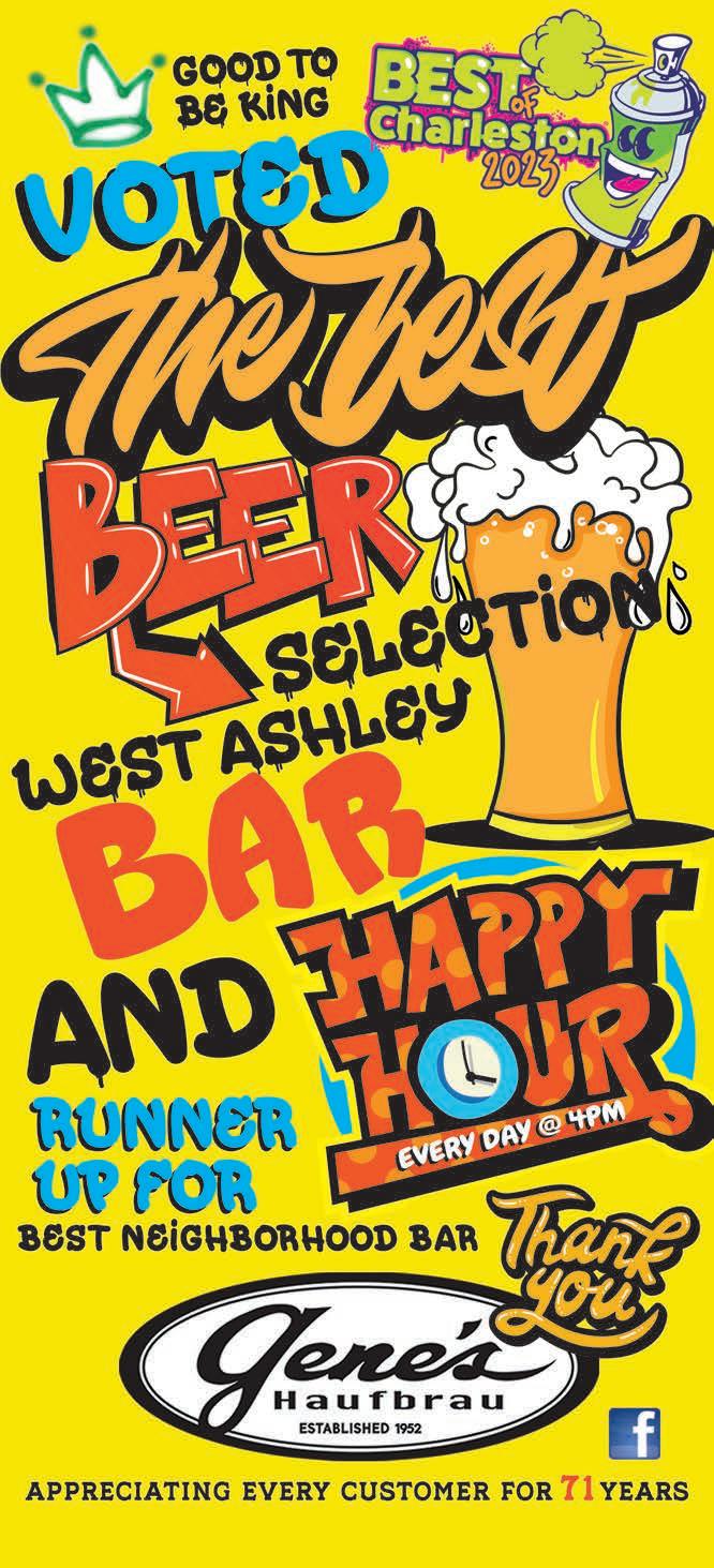 CharlestonCityPaper.com | 123 EVERYONE NEEDS A MUNKLE 1513 Meeting Street Rd, Downtown | MunkleBrewing.com BEST LOCALLY BREWED LAGER THANK YOU FOR VOTING MUNKLE PILS CHARLESTON’S Photo by: Hector J Salazar 504 Meeting Street • TheCommodoreCHS.com Voted Best Dance Club and Best Jazz & Blues Club THANK YOU CHARLESTON!