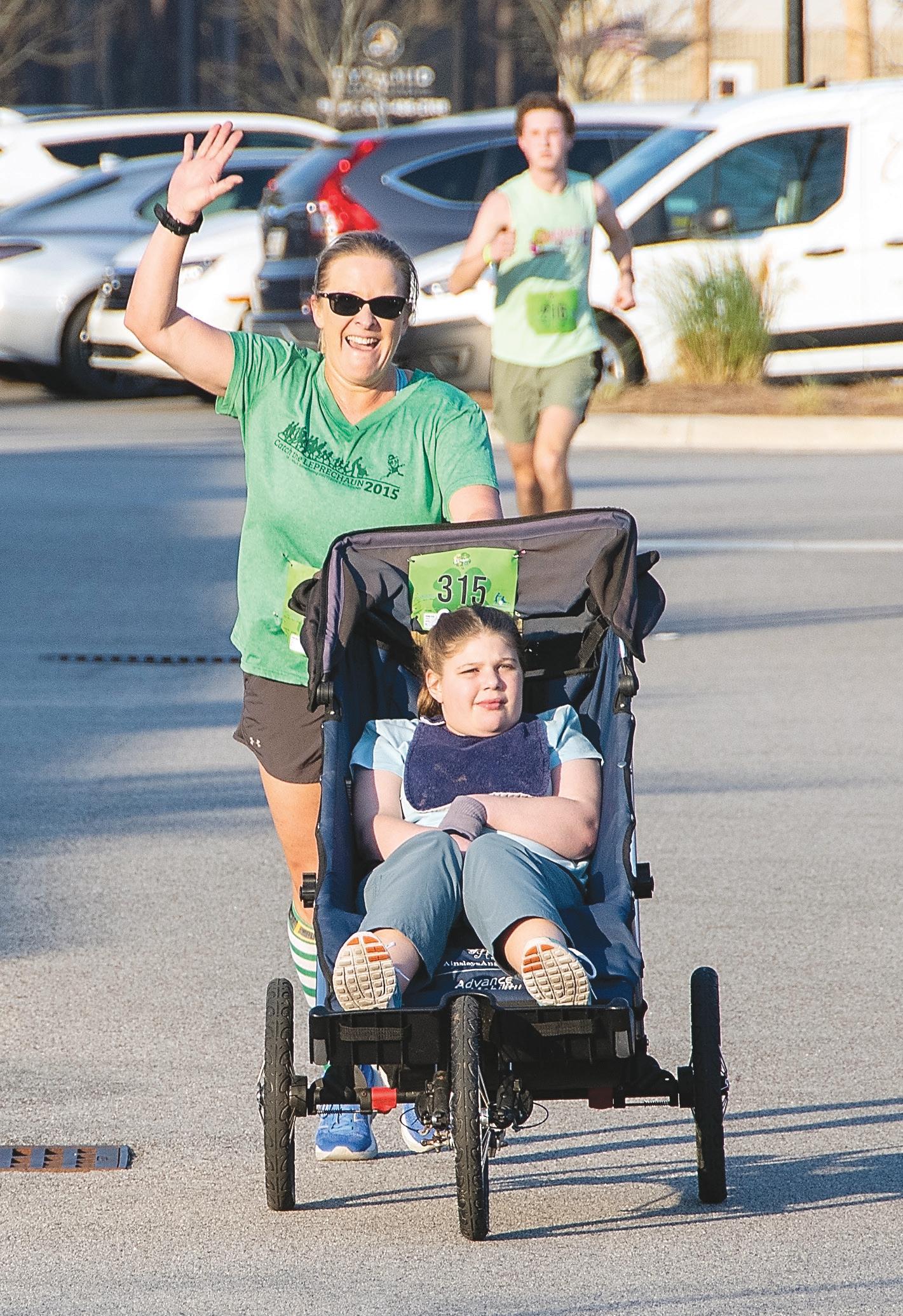 Rain or shine, the April 6 race will start in Mount Pleasant and send runners across the Arthur Ravenel Jr. Bridge. It’s a grueling 4.8% grade going up, but much easier going down, especially if you’re pushing a 120pound adult and a chair that weighs about 10 pounds, says Roper St. Francis nurse Michele Milner, who has pushed Katherine in recent races, including the March Catch the Leprechaun 5K that helps to raise money for Racers for Pacers.