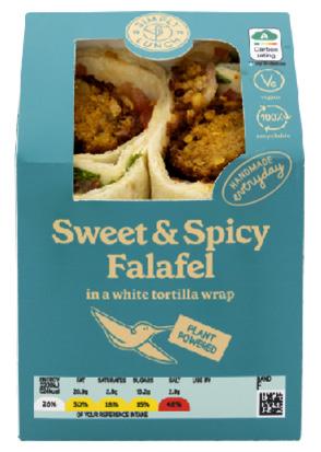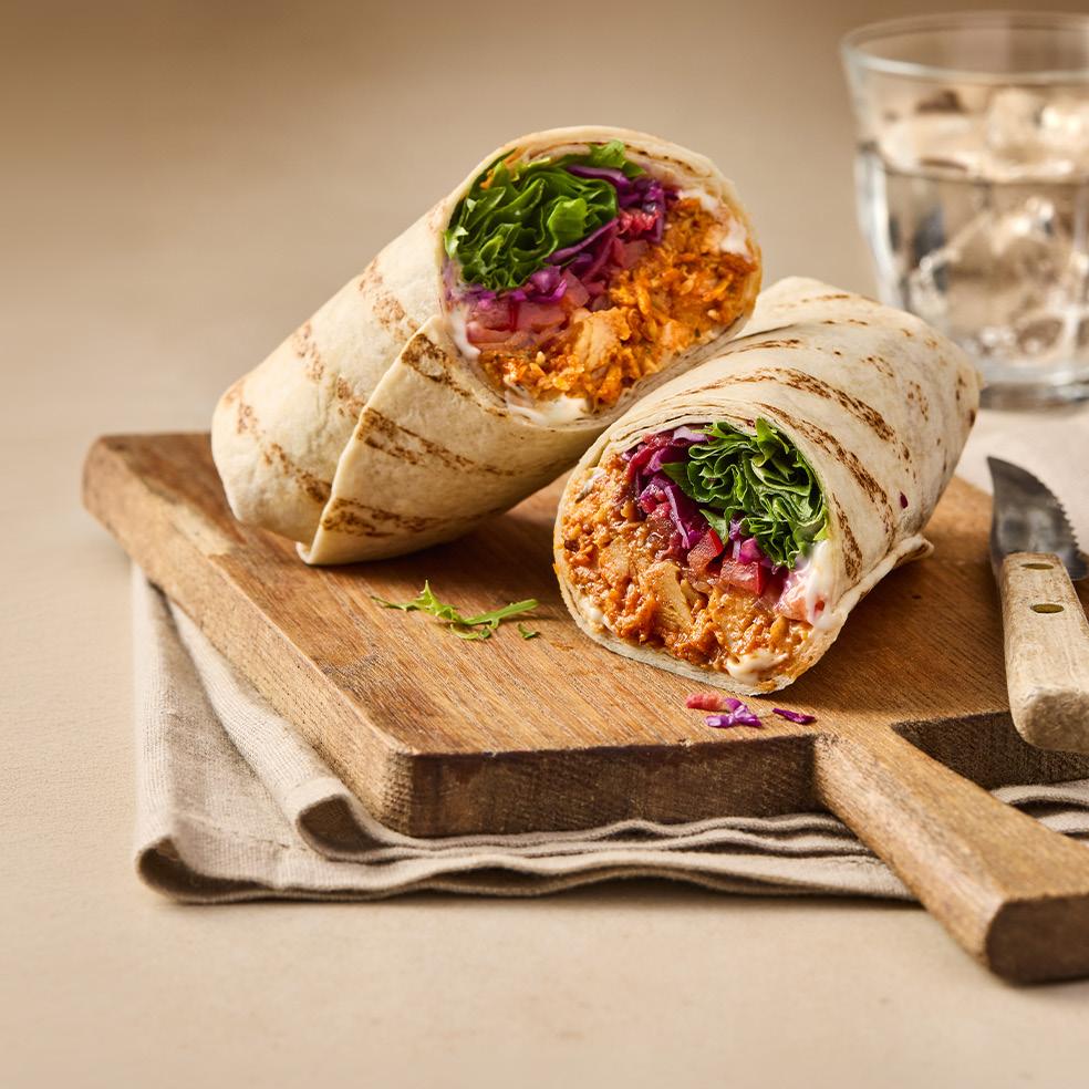 Chickpea & sweet potato falafel with seasonal leaves, tomatoes, spiced mango chutney & vegan mayonnaise on a white tortilla wrap.
