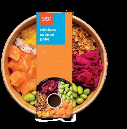 A poke bowl of salmon, pickled red cabbage, edamame beans, grilled yellow peppers & crispy onions. Served with rice & a soy sesame dressing.