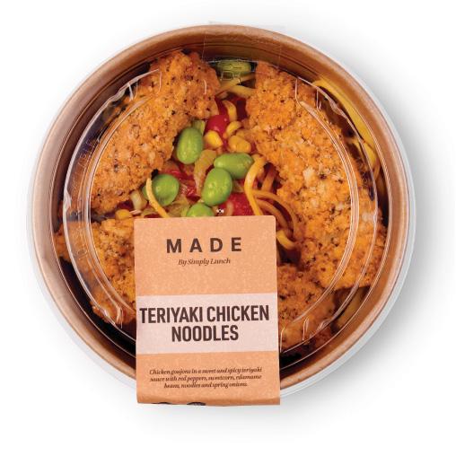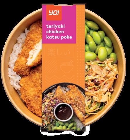 Chicken breast pieces in a Japanese style panko crumb, edamame beans, teriyaki mayonnaise coleslaw & white sesame seeds, with sushi rice & teriyaki miso sauce.