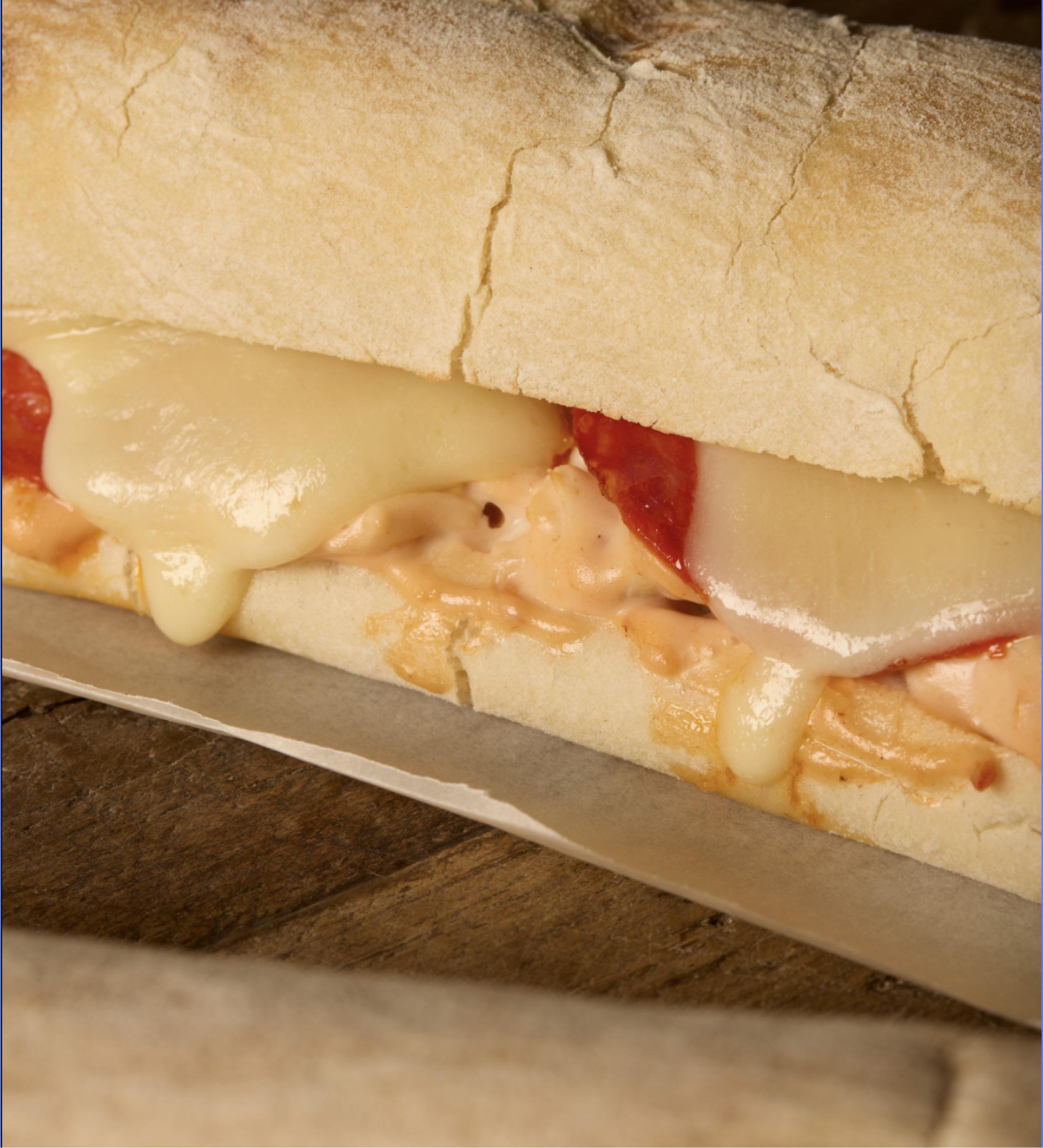 Red & white Cheddar cheese, mayonnaise, caramelised onion chutney & spring onions on a semolina topped sub.