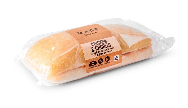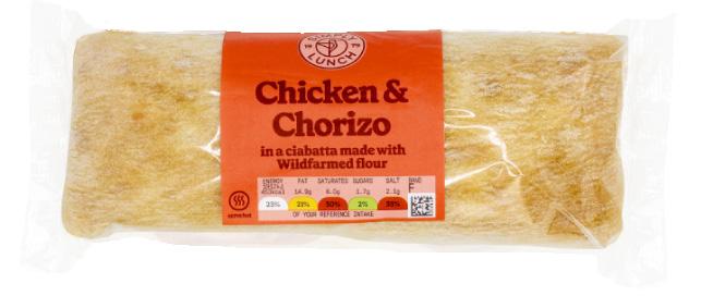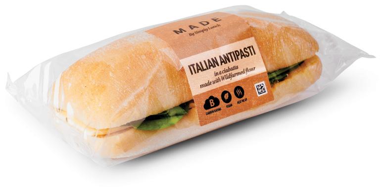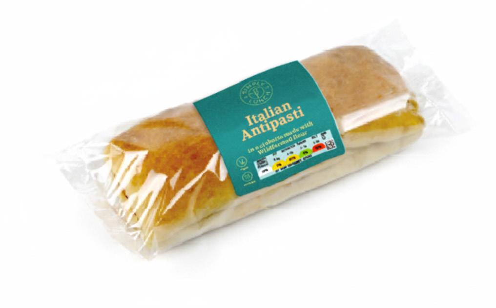 Mature Cheddar style cheese, grilled red & yellow peppers, artichokes, chickpeas, spinach and vegan basil mayonnaise in a ciabatta made with Wildfarmed flour.