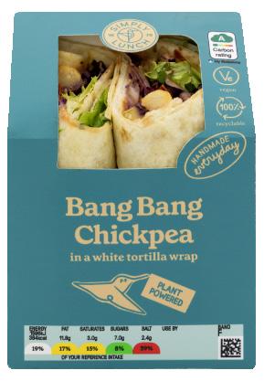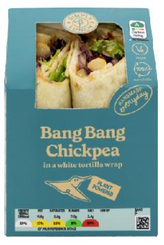 Chickpeas in a spicy sriracha vegan mayonnaise with mango chutney, mint, seasonal leaves and pickled slaw in a white tortilla wrap.