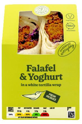Mediterranean falafel & mint yoghurt mix with pickled slaw in a white tortilla wrap.