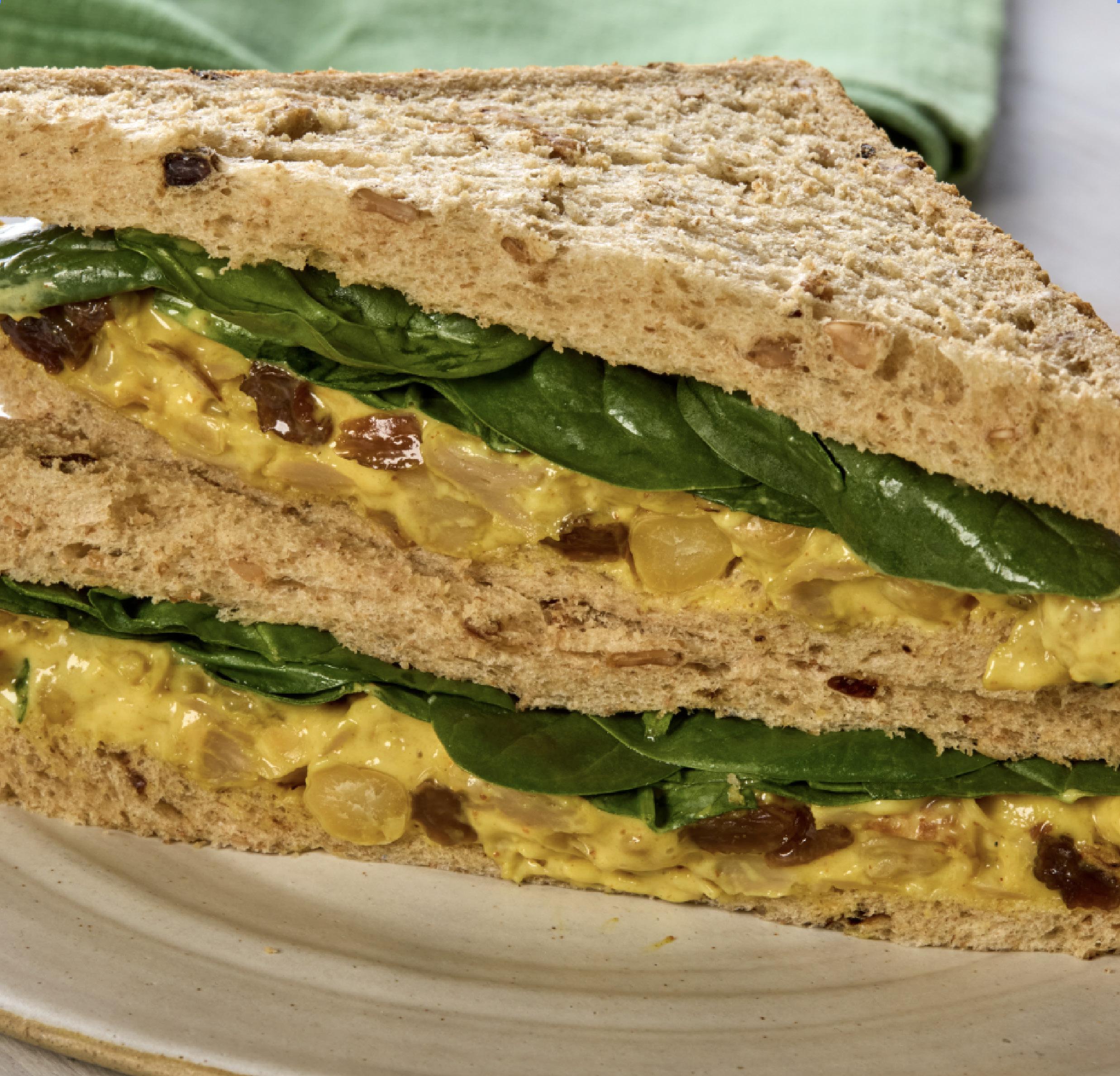 Chickpeas and soya strips in a coronation sauce with spinach on malted bread.