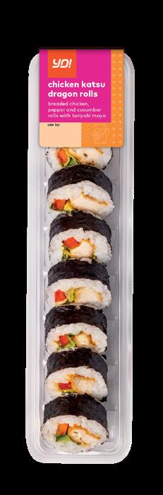 7 Tender panko coated chicken, red pepper & cucumber rolls, with a teriyaki mayonnaise sauce.