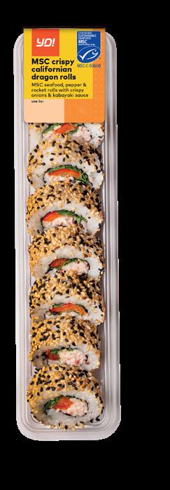 7 MSC seafood stick rolls with red pepper & rocket, coated in black & white sesame seeds, with kabayaki sauce & crispy onions.