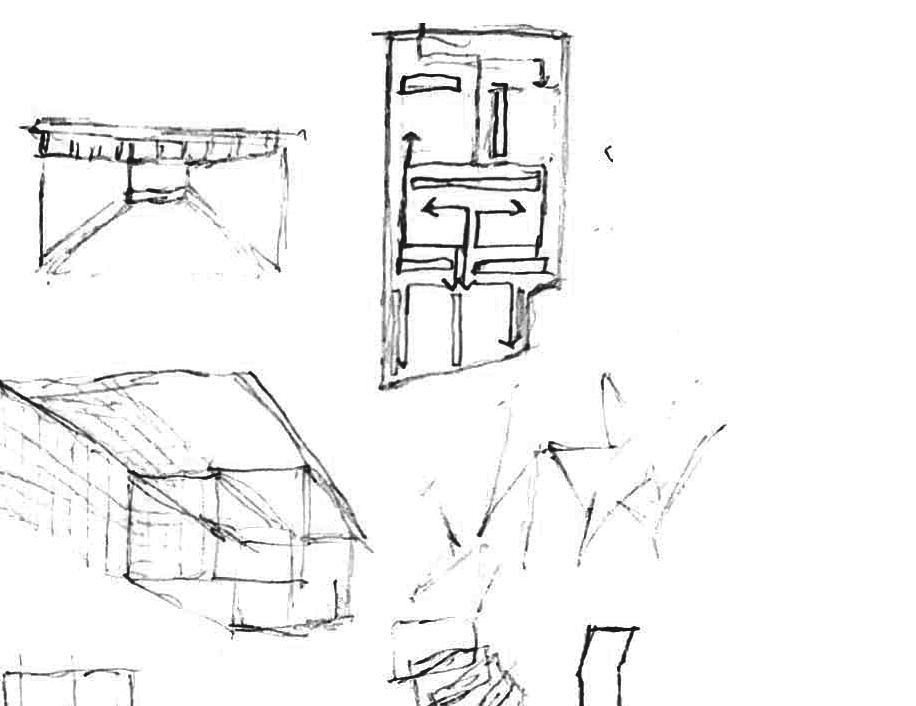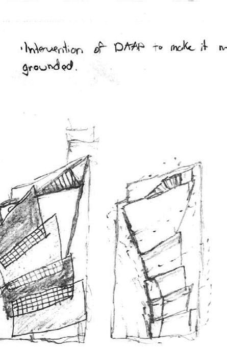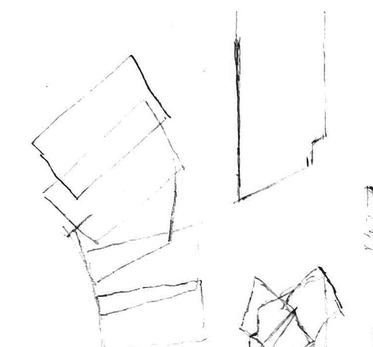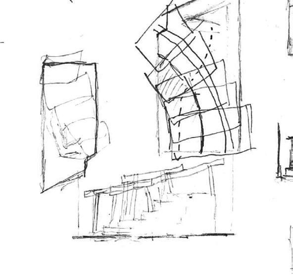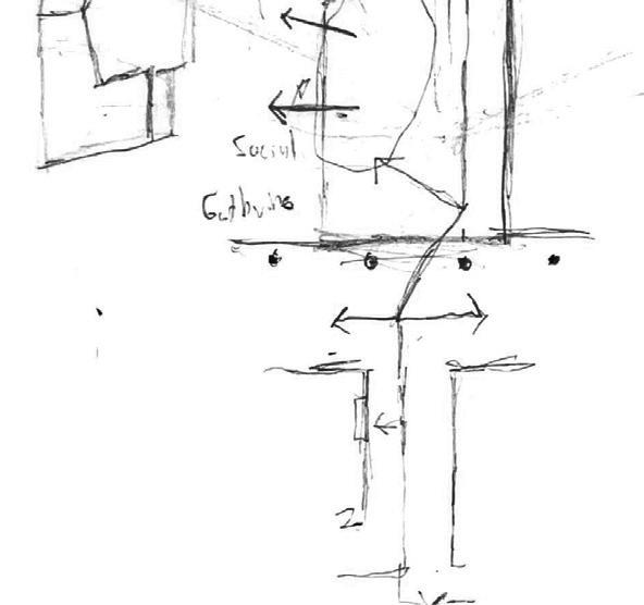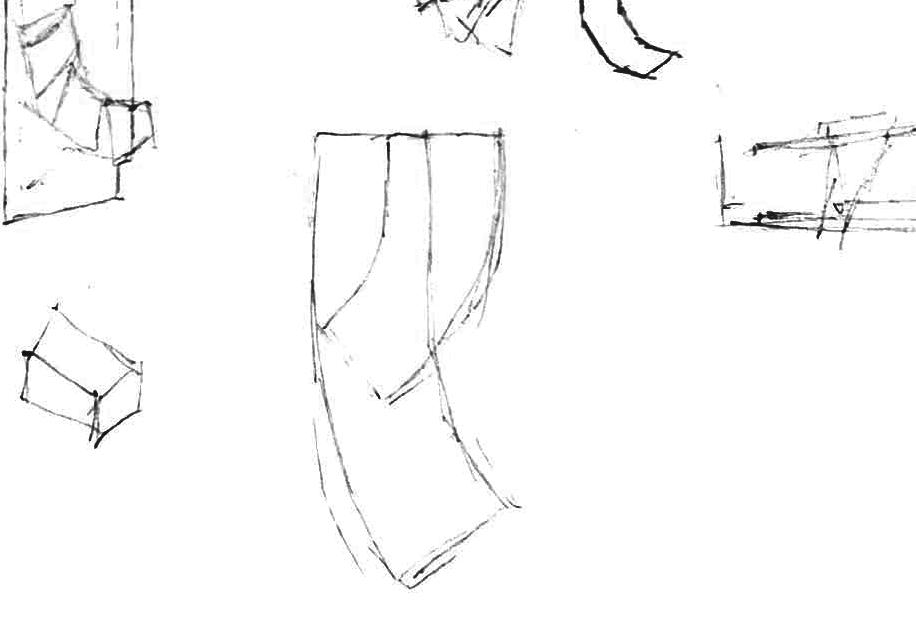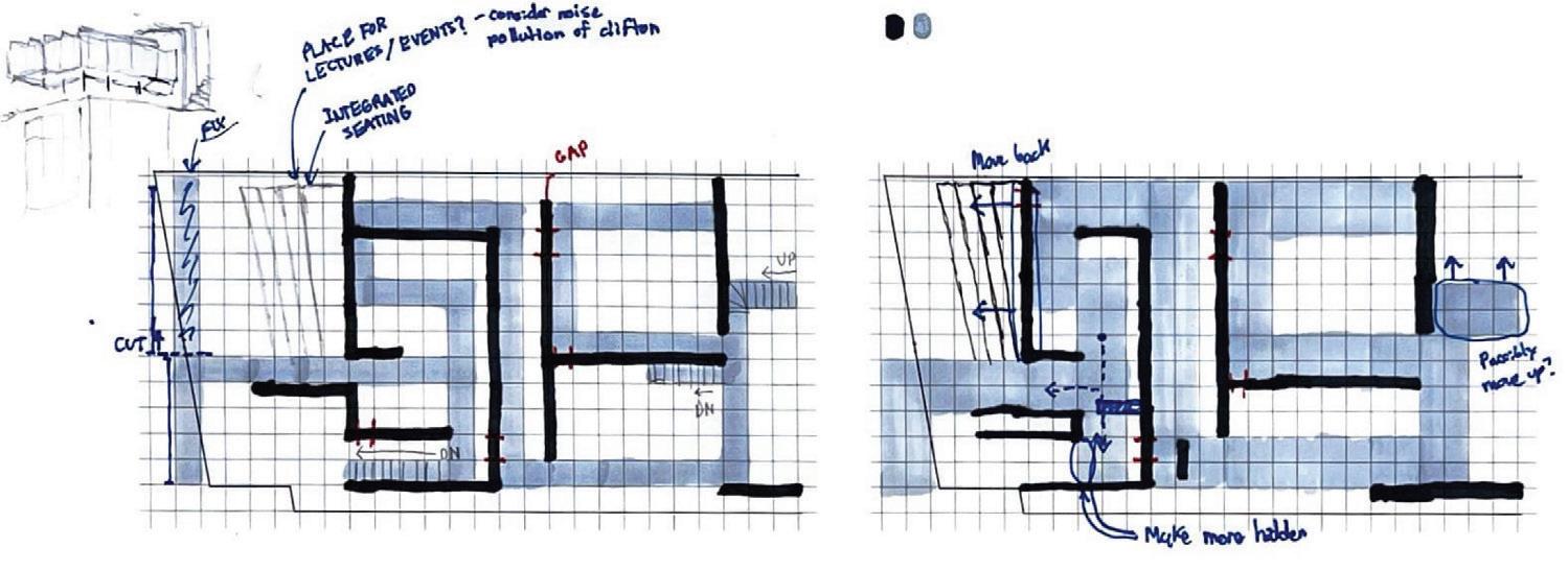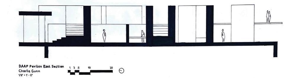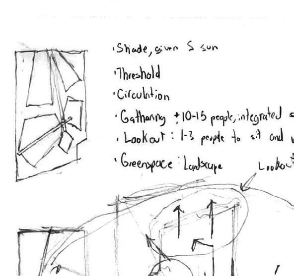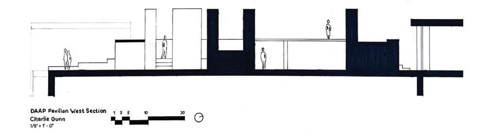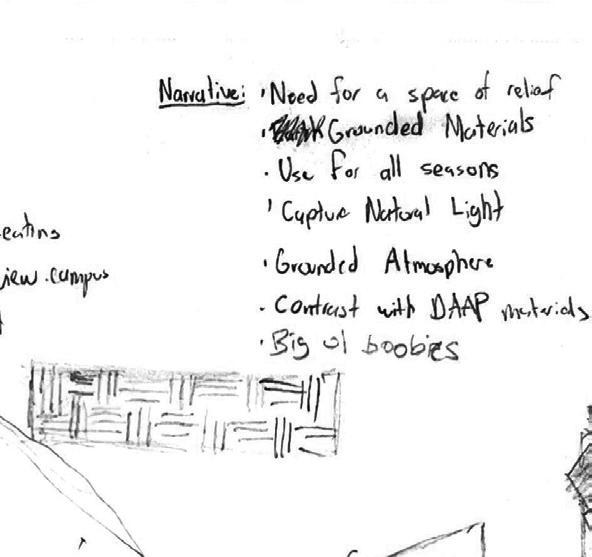 Pictured are initial sketches and exploration for the direction of my pavilion. I originally started with a continuation of the DAAP’s grand staircase, creating a grand escalating pathway that leads to a view of campus. Ultimately, this idea transformed into creating multiple pathways with deliberate cutouts to prompt user curiosity, leading them to a view of campus.