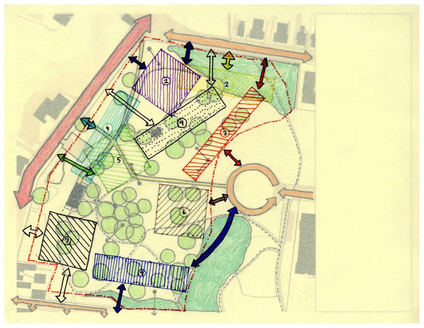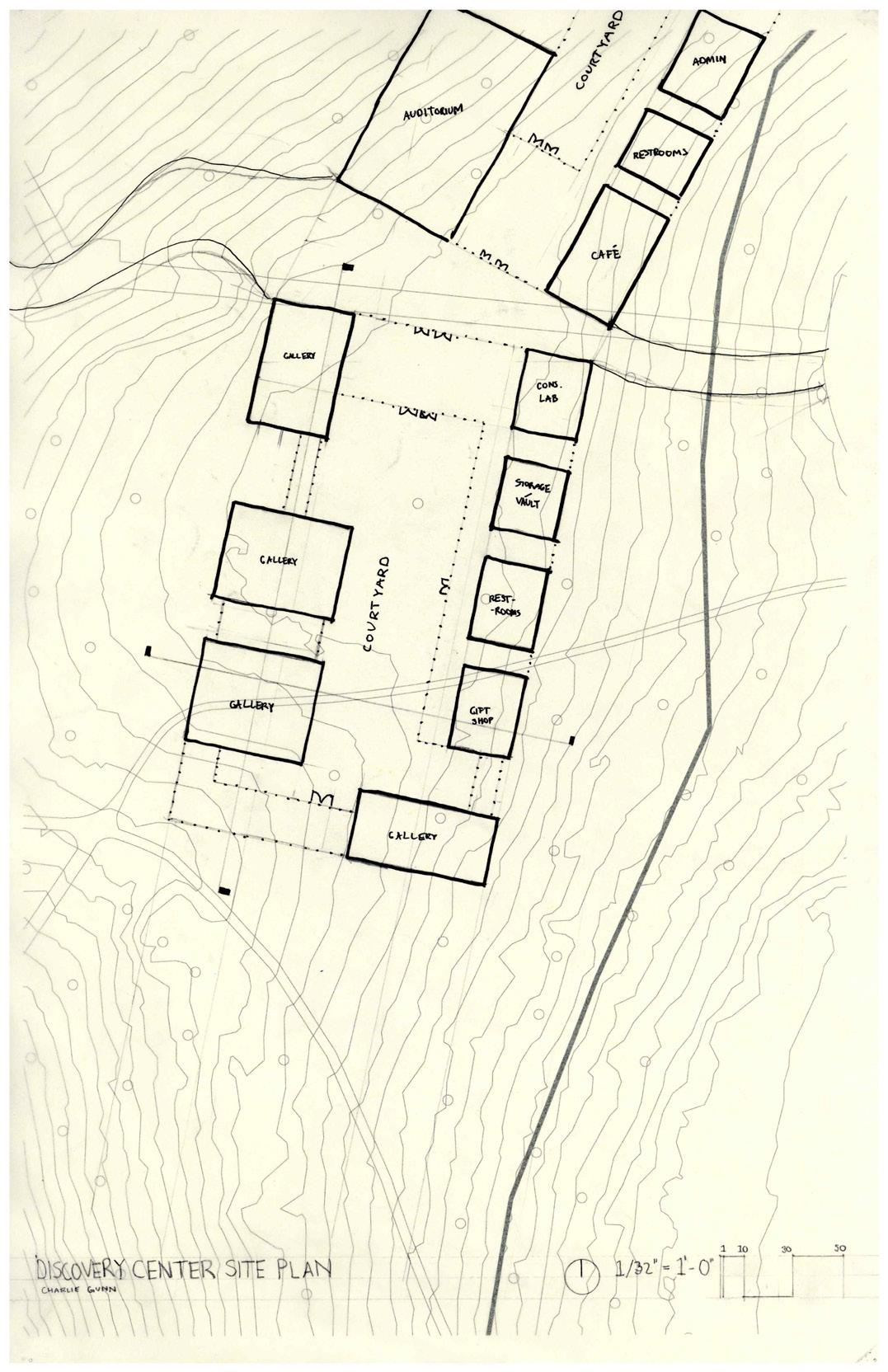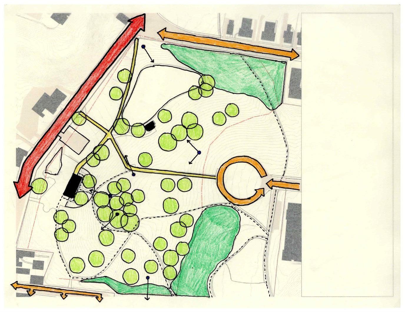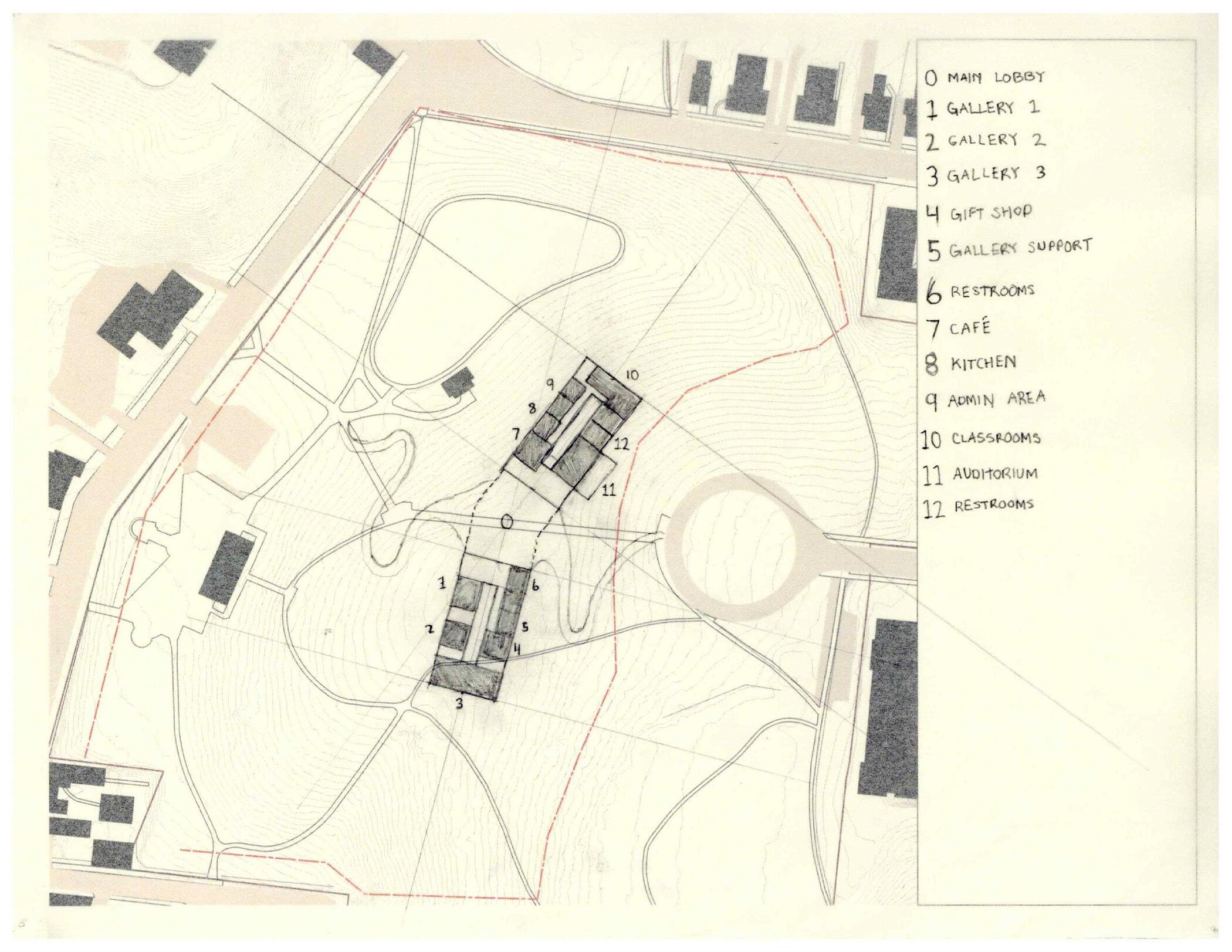 We were tasked with designing a museum to contain various eclectic artifacts of Cincinnati’s near 250 year long history. But first, we had to place our building on the site. Initial studies were created to determine the site forces like major roads, minor roads, major pedestrian circulation, minor pedestrian circulation, views in the park, overgrown areas, and trees with trunks larger than 2’ in diameter.