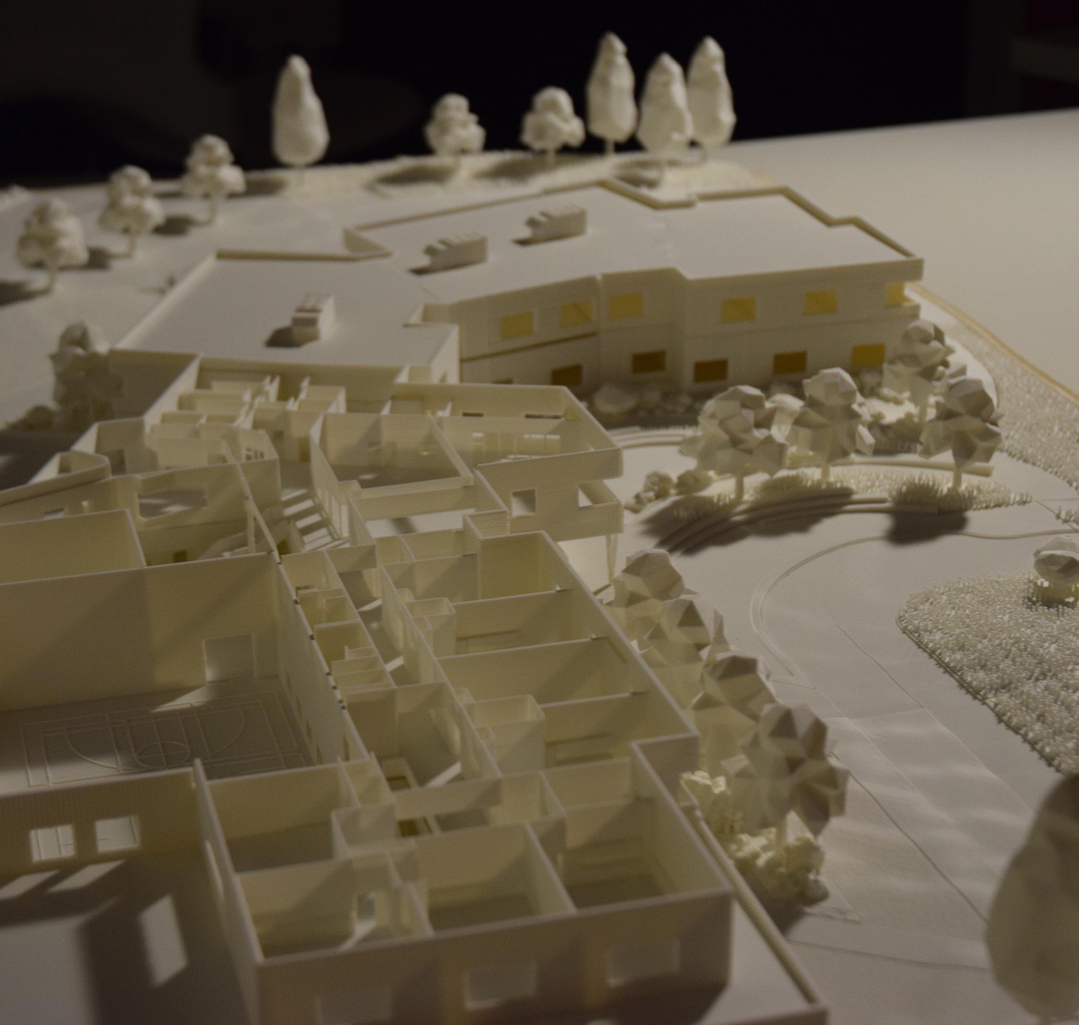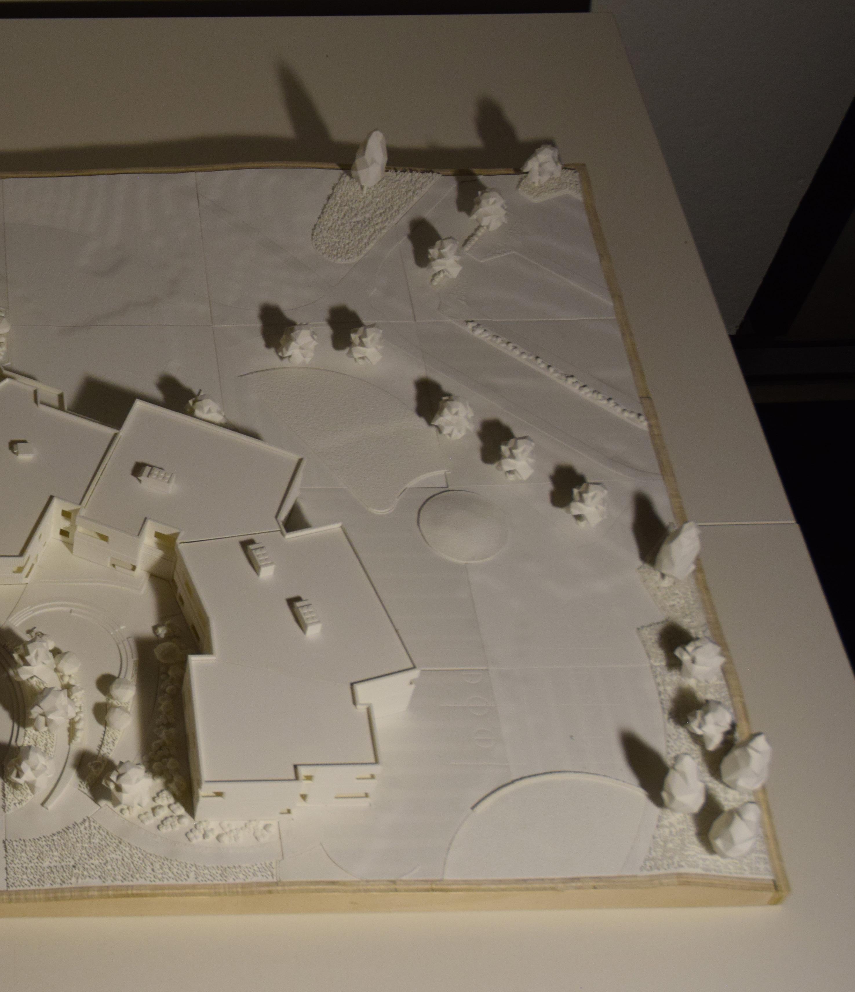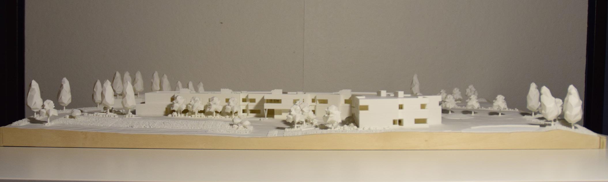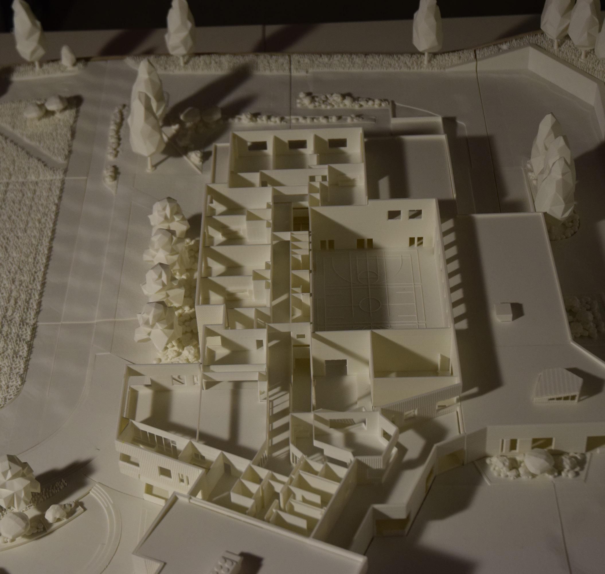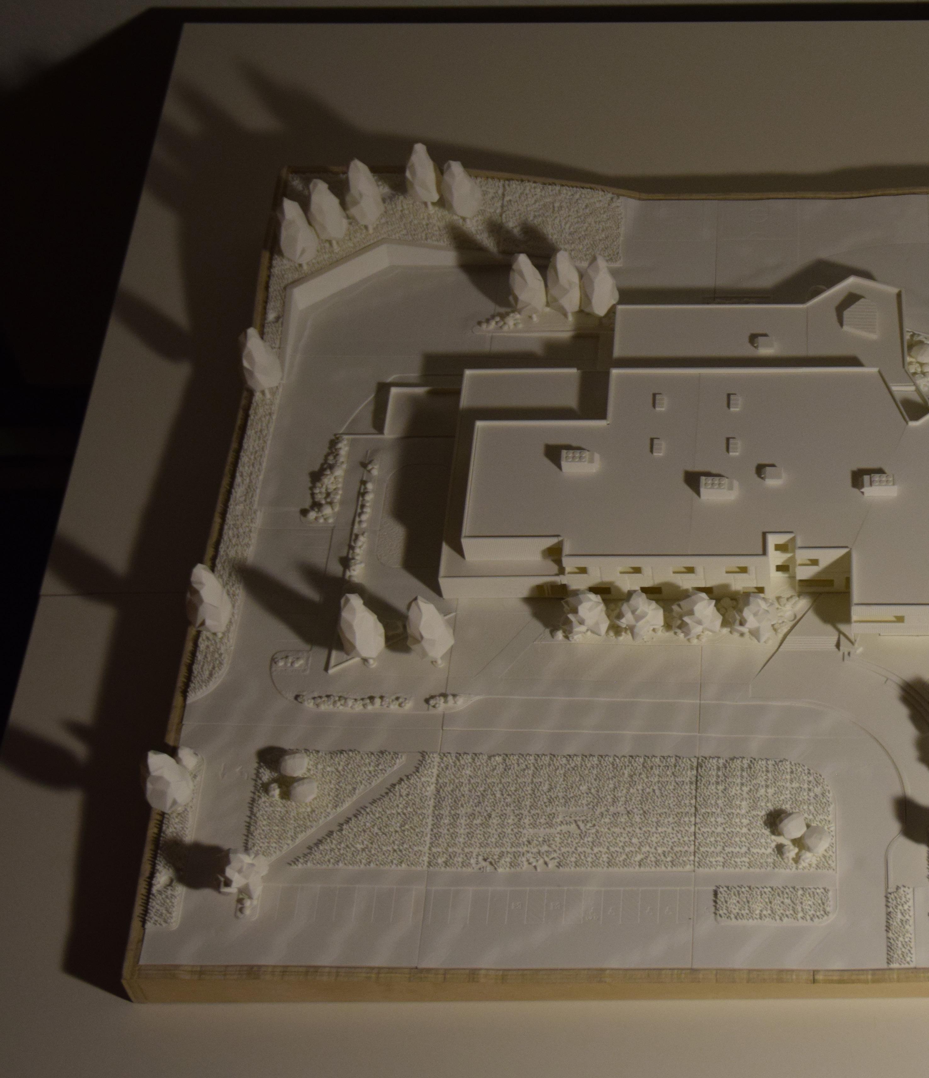 One of the physical models I worked on was a hyper-detailed model of a K-6 school in Aurora, Colorado. The final model is 4’ x 2’ and is made out of 3d printed material and plywood for the frame. The site included large topographical changes and I made the choice to print the landscape tiles vertically, in order to get a smooth finish instead of seeing the contoured layers inherit to 3d printing. Some pieces had to be printed vertically, so holes in the tiles were made for tiles to fit into.