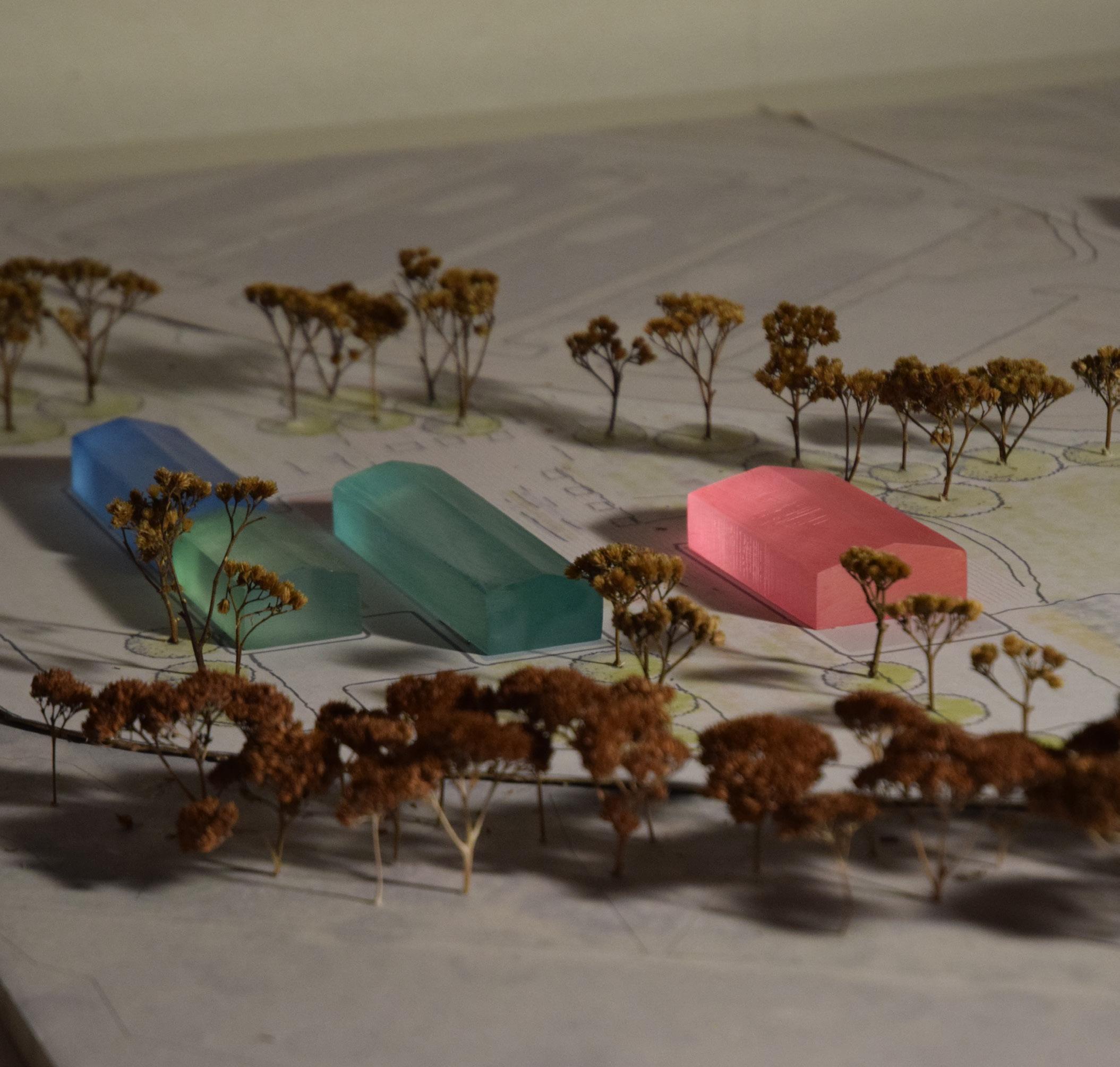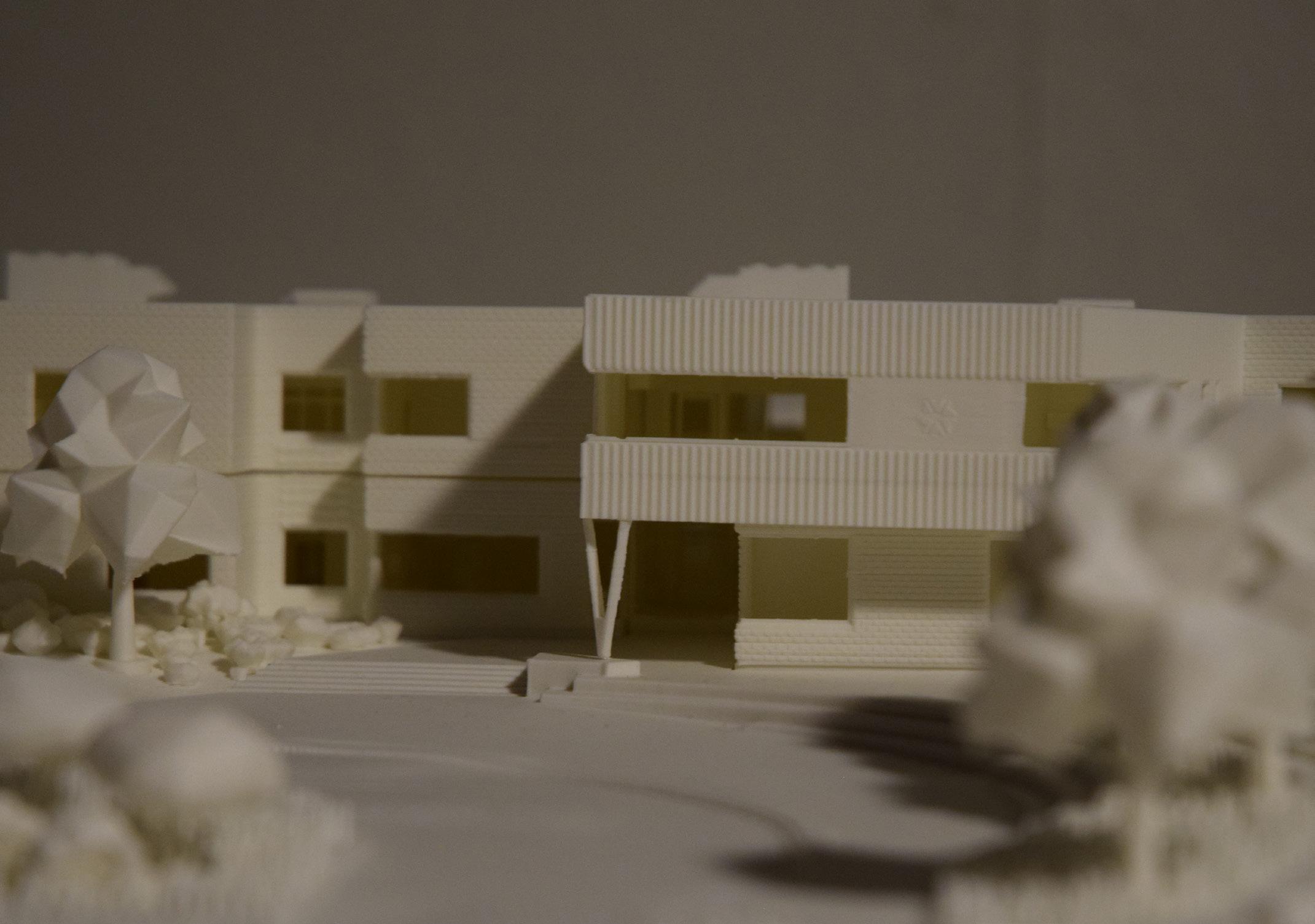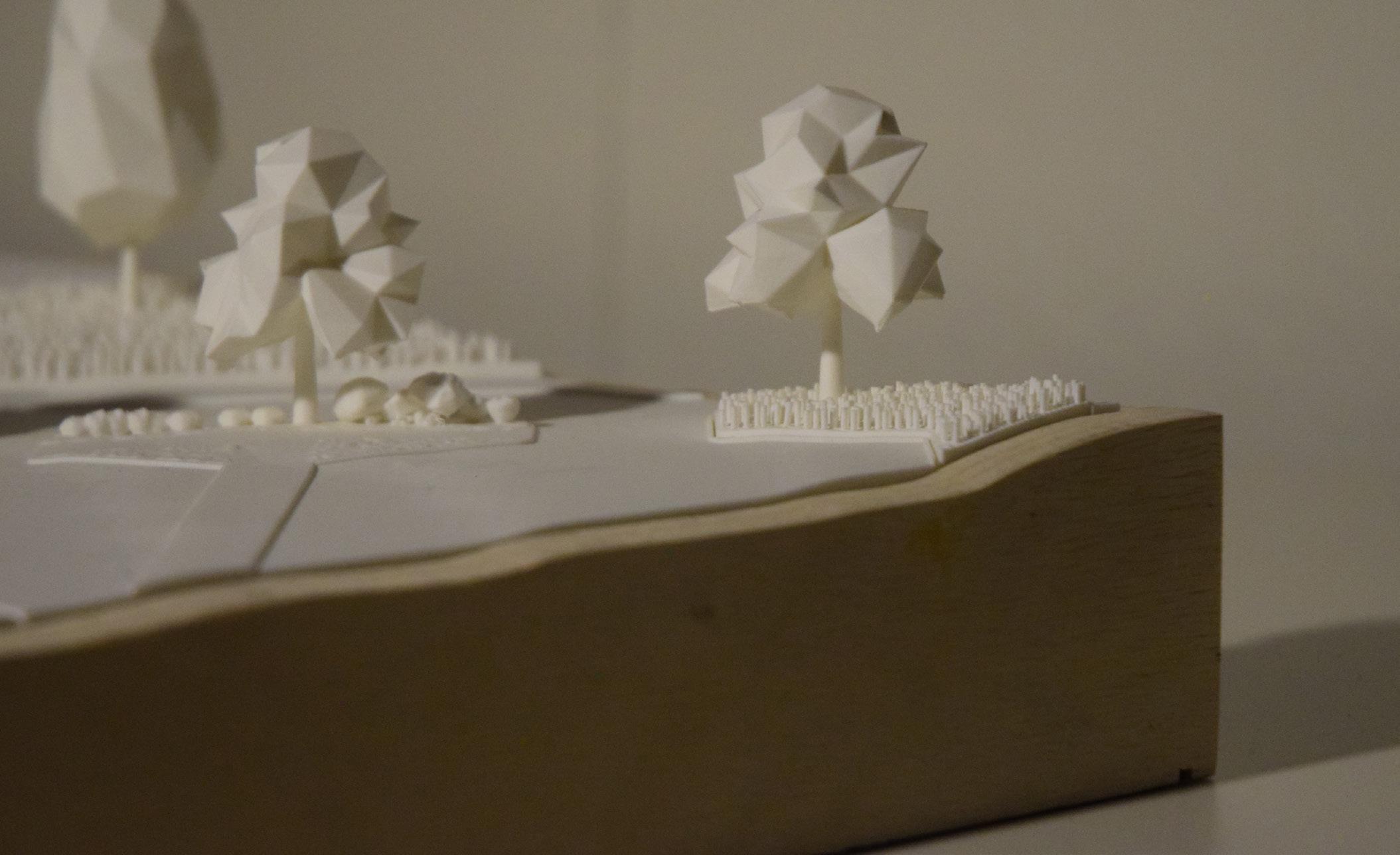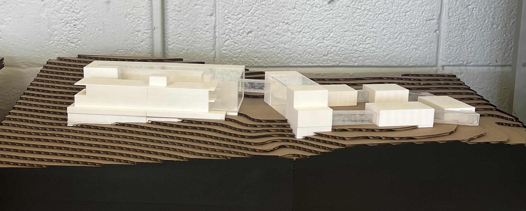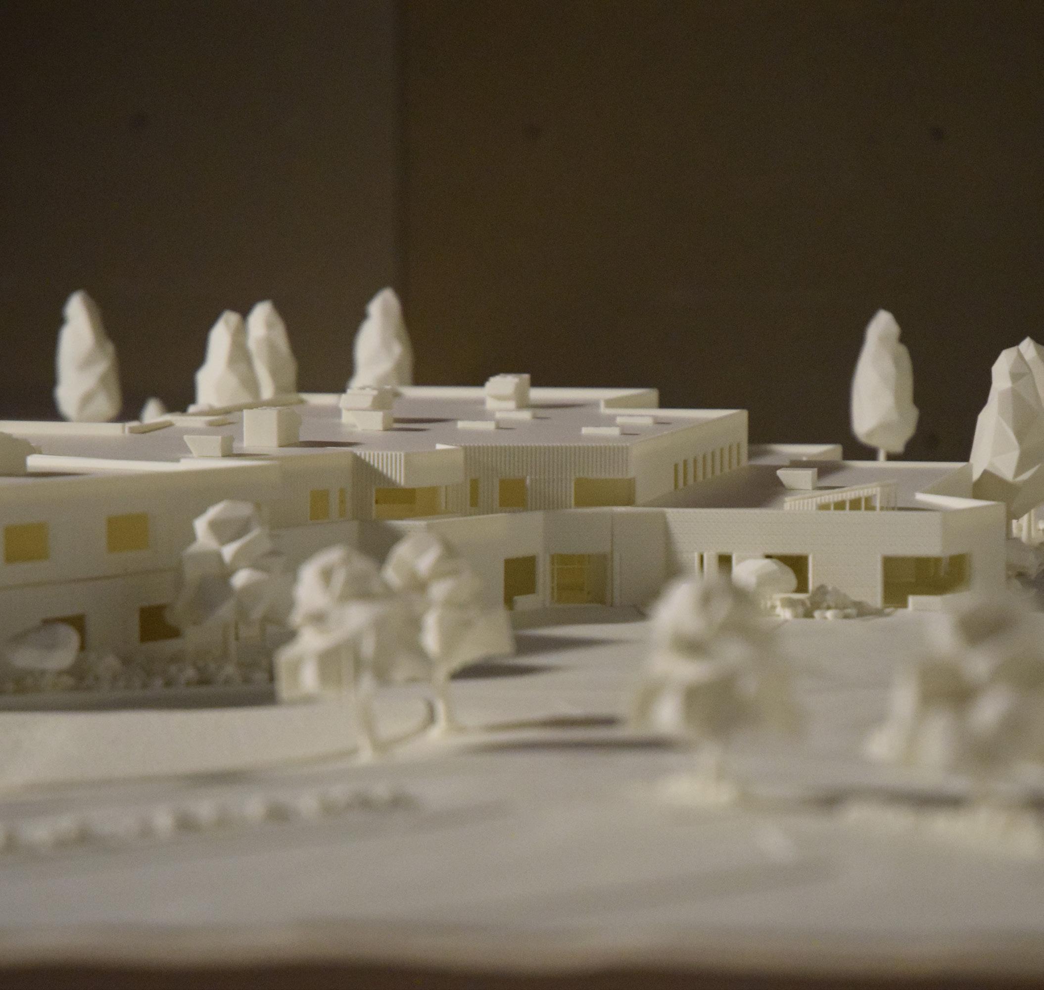 One of the physical models I worked on was a hyper-detailed model of a K-6 school in Aurora, Colorado. The final model is 4’ x 2’ and is made out of 3d printed material and plywood for the frame. The site included large topographical changes and I made the choice to print the landscape tiles vertically, in order to get a smooth finish instead of seeing the contoured layers inherit to 3d printing. Some pieces had to be printed vertically, so holes in the tiles were made for tiles to fit into.