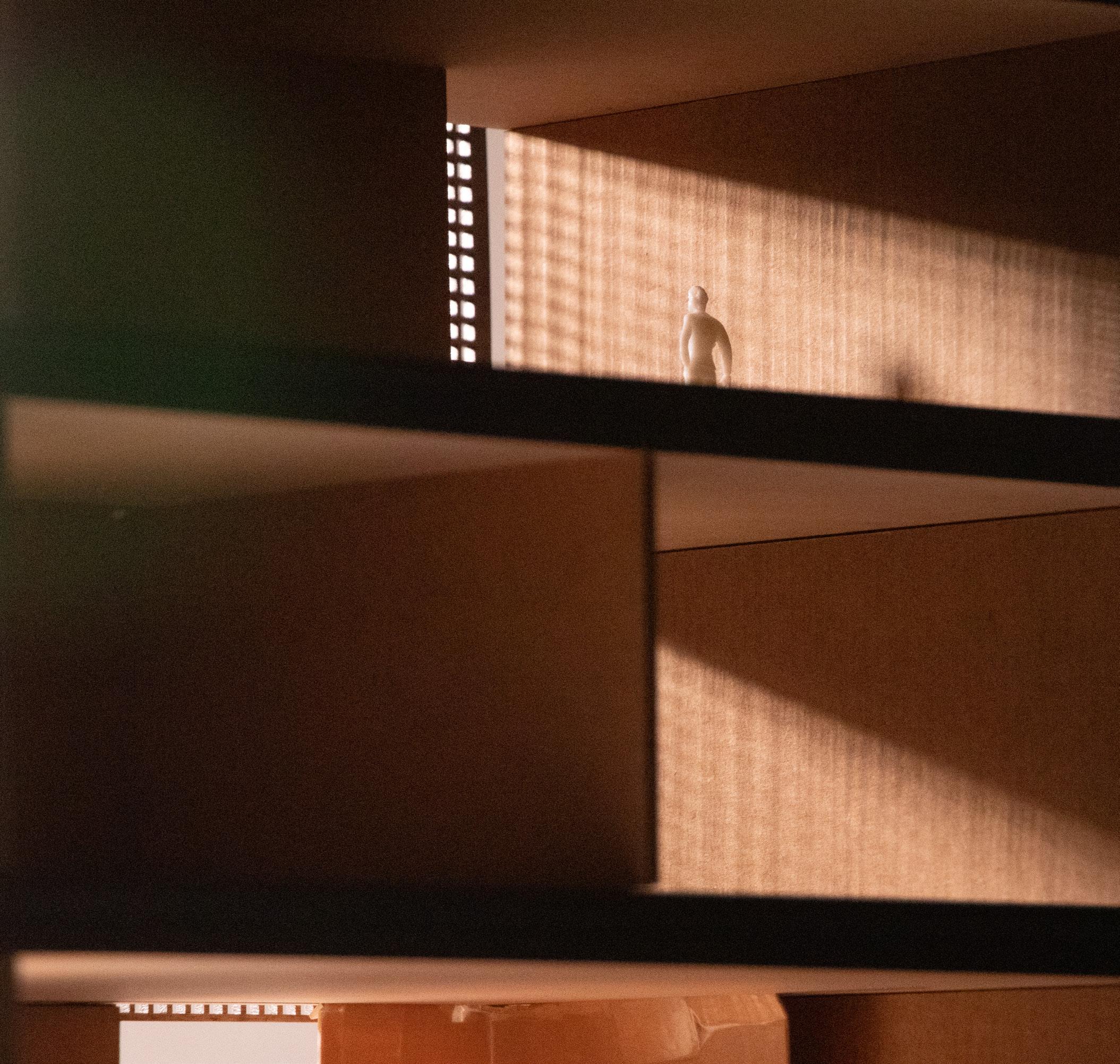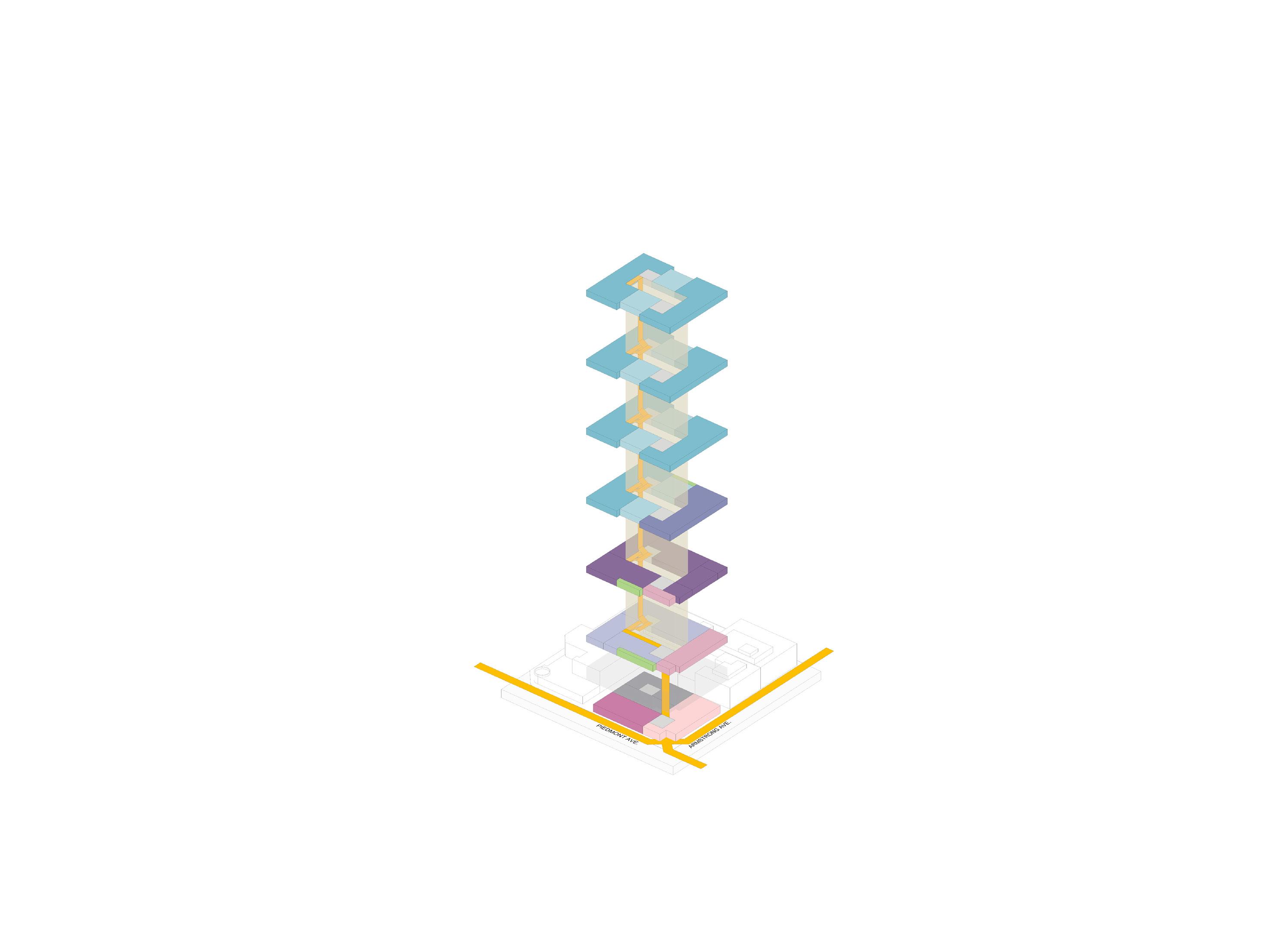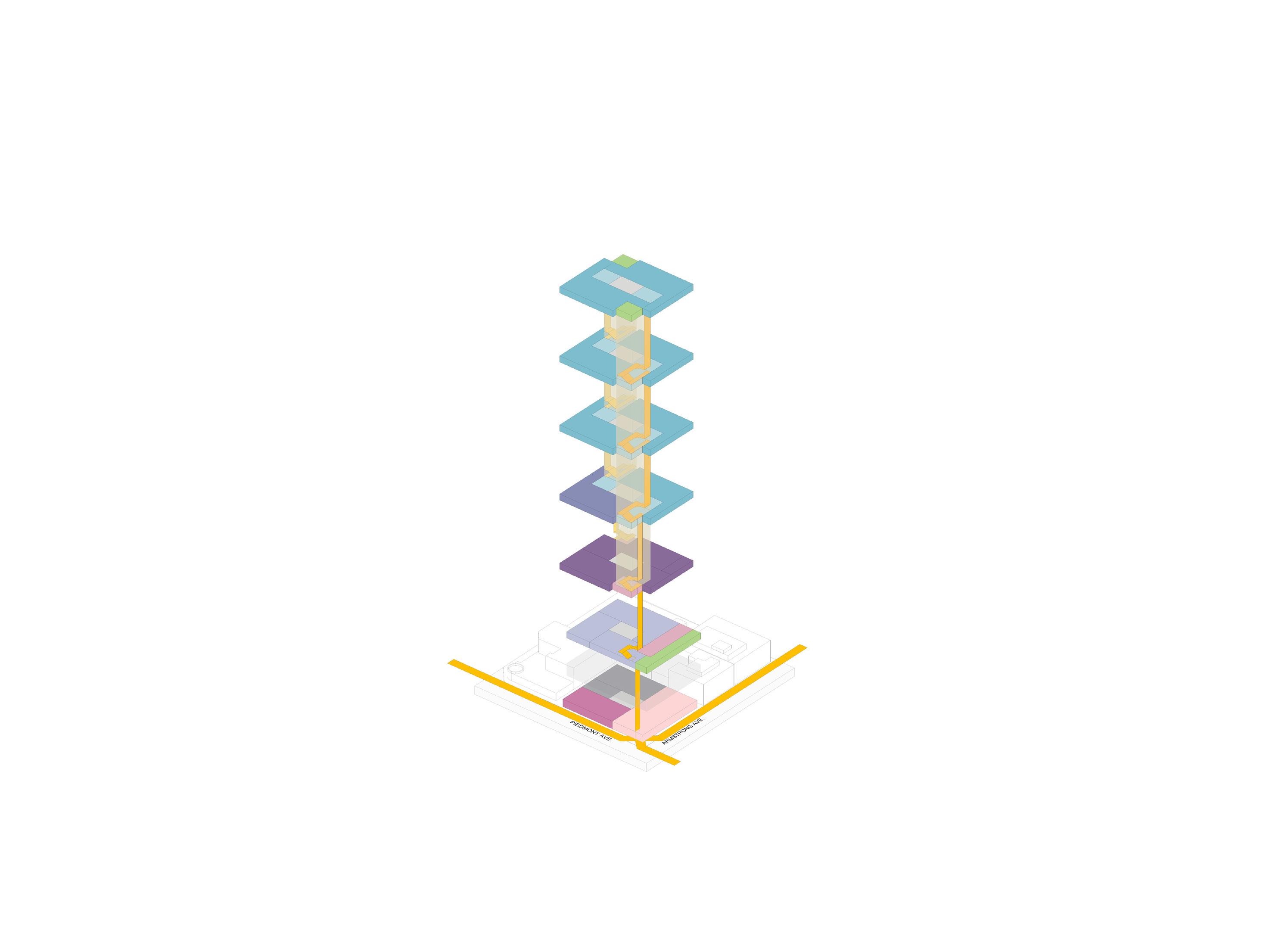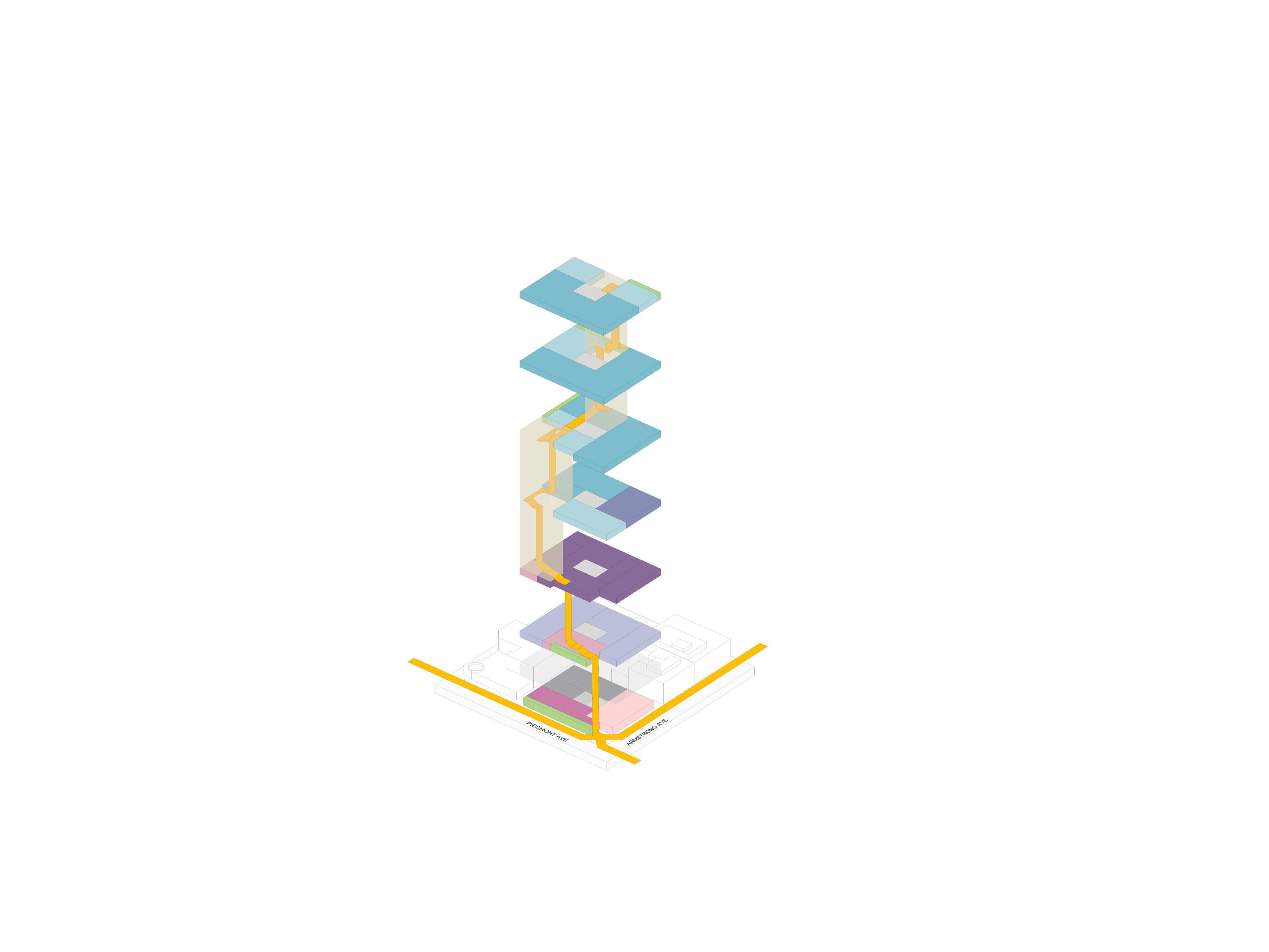 The spaces that should be open to the public 24/7, such as: the cafe, galleries, and performance space, are placed nearest the ground floor, minimizing the time it takes for individuals to traverse the public spaces. The more private spaces such as the art studio, dance studio, theatre studio, workspaces, and music studio are placed above the public realm but are still connected, via the grand central stair.