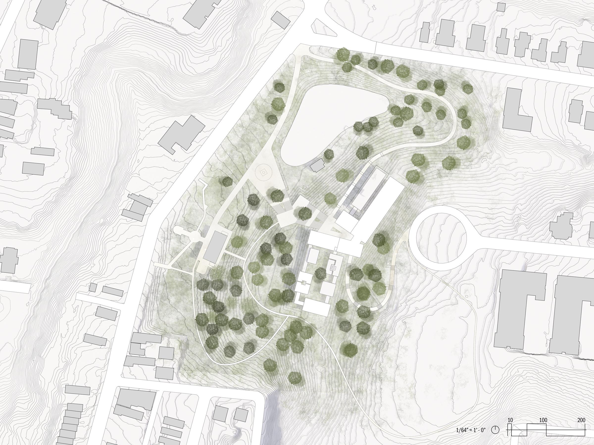 I had my goal of respecting the site, but had to grapple with the fact that our building required a large footprint. After lots of iteration and thinking, I established the bedrock of my parti to be that one should not feel as if they are ever leaving the park. This was then achieved by incorporating a language of solid and void, where solid would be the galleries and the void would be fully glazed corridors that showcase panoramic views of the park, while still in the building.