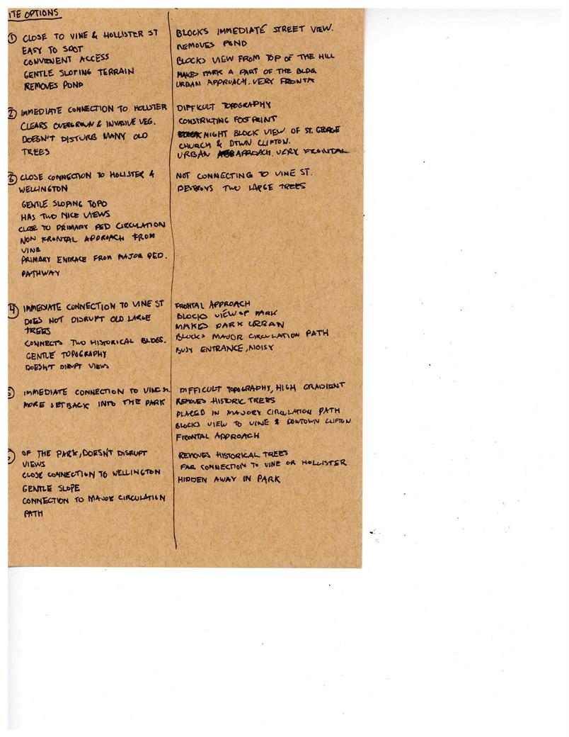 Based off many site visits, annotating how people used the park, how often people would use it and at what times, I became quite fond of it. The park offers some respite in the densely packed urban core of Clifton. It is with this observation that I would anchor my thinking and design process about my building. Too often, architects create buildings that don’t relate to the site and most importantly don’t respect it. That was my goal with this project, to respect the site.
