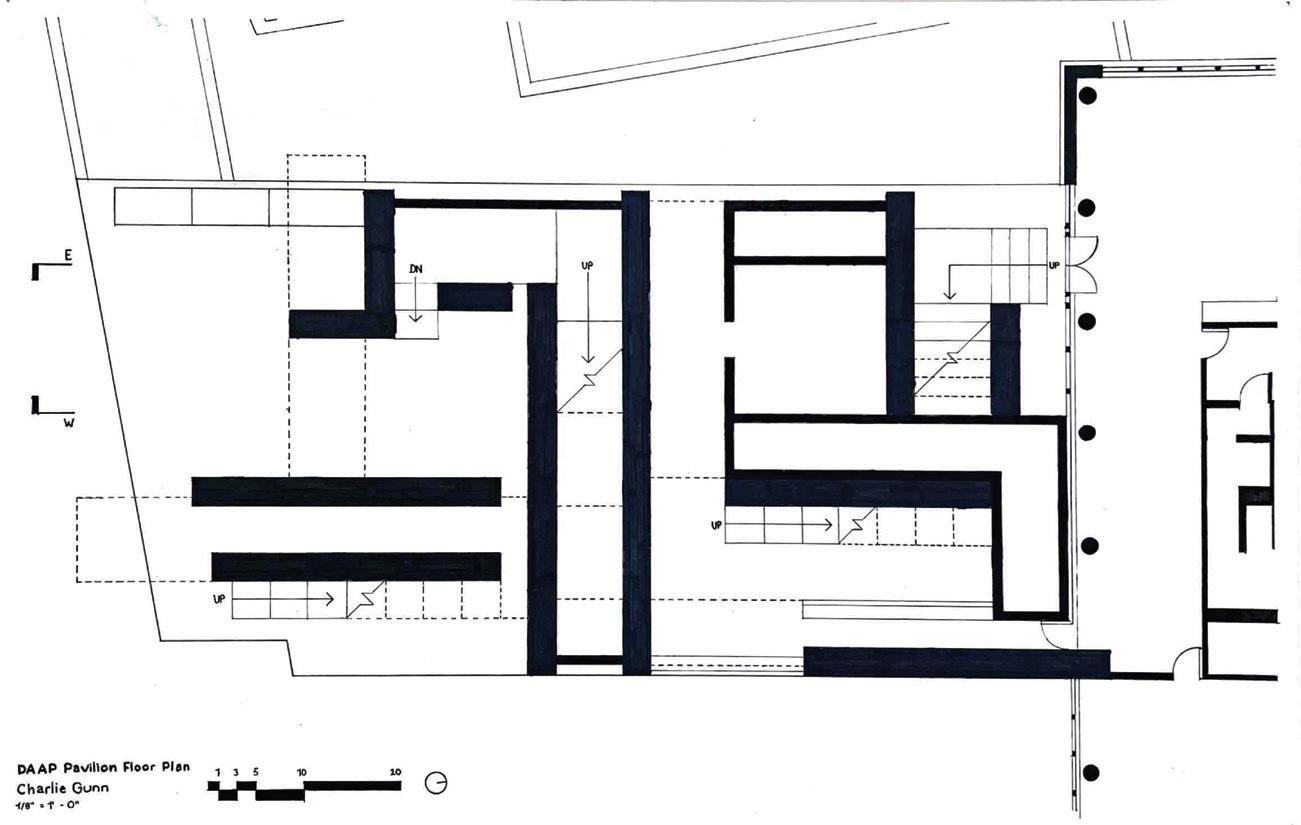 The final project of my first semester was to design a pavilion for the rooftop of the DAAP. The brief required that we focus on threshold, circulation, a gathering space, a lookout, and a green space. We needed a design for an all season pavilion and event space to be used by students and faculty. A question I constantly asked during the project was, “How does one move to, through and around the spaces I design?”