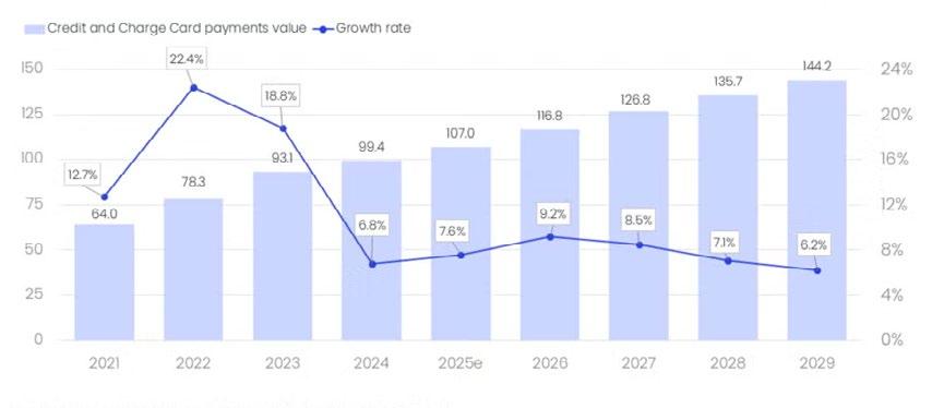 The credit and charge card payments market is projected to grow 9.2% to $116.8b in 2026, driven by wider card acceptance and increased use of contactless payments, according to a report by GlobalData.