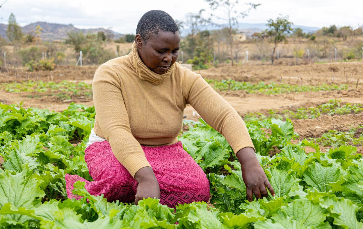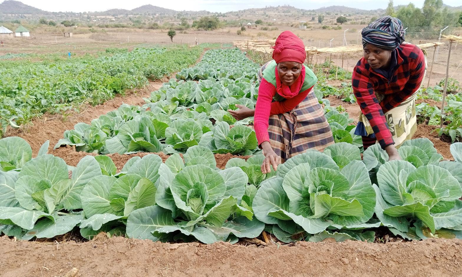 July 11, 2023: Annah Gundete and Georgina Mbera tend to their vegetable garden in Ward 28, Zaka. The Fabiola cabbage planted in a row at the solar-powered garden, has a very early maturity rate of 65 days. The size of the cabbage head has benefited from the double-dug concept synonymously known for preserving moisture in the soil, and t’s fertility. © Fortune Tafirenyika/ CARE