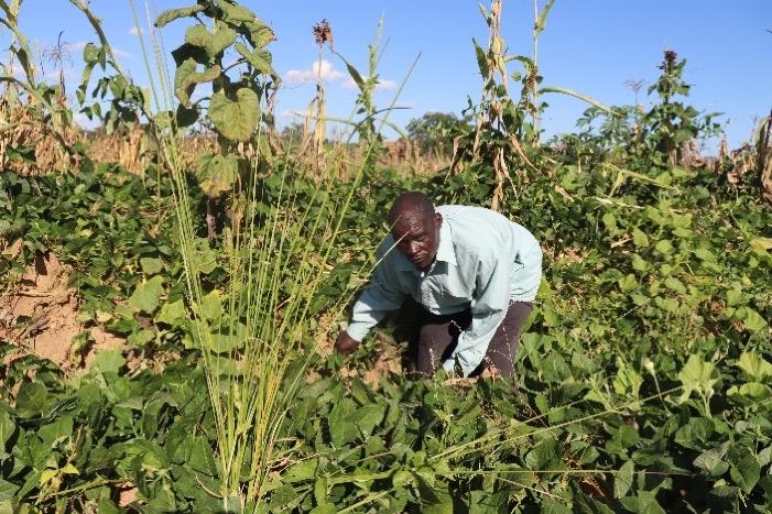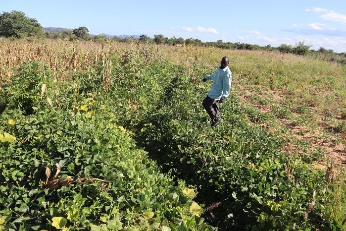 NOMORE GWENDA (Host Farmer) harvesting cow Pease which he planted in the contour ridge. © Kaizer Makope / CARE