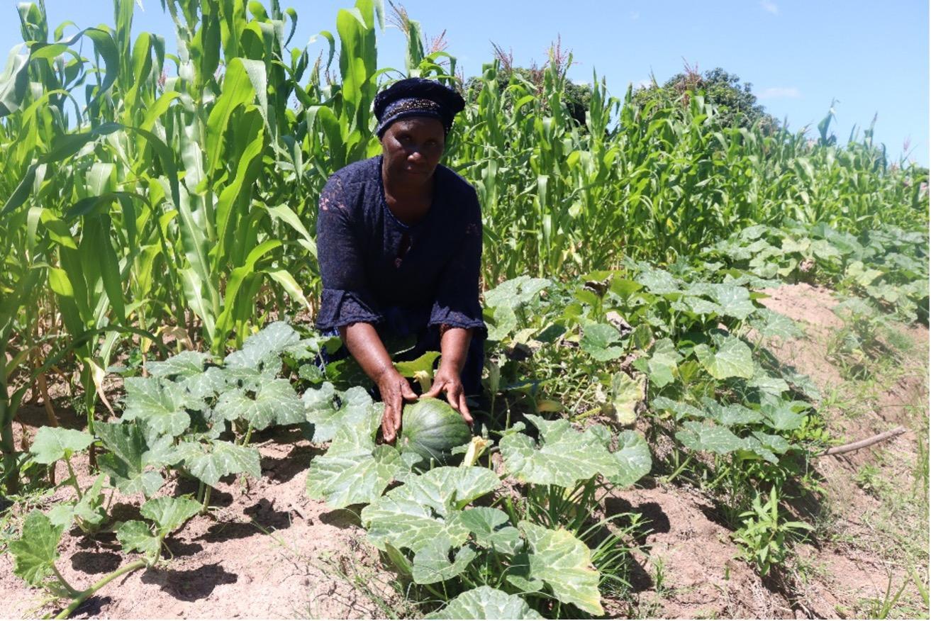 JANUARY 09, 2023: Ward 28, cluster 2 FFBS Host farmer Mrs. Mutaki holding a thriving pumpkin on top of her bioswale, “As farmers in our village, we are seeing great change in the way we used to plant our crops. This is because of the training conducted by Takunda here. We are also comparing the crop cover and quality of crops on top of contours, taking lessons and helping each other. This will help us to improve in the future.” © Godfrey Muvhuti / TAKUNDA RFSA