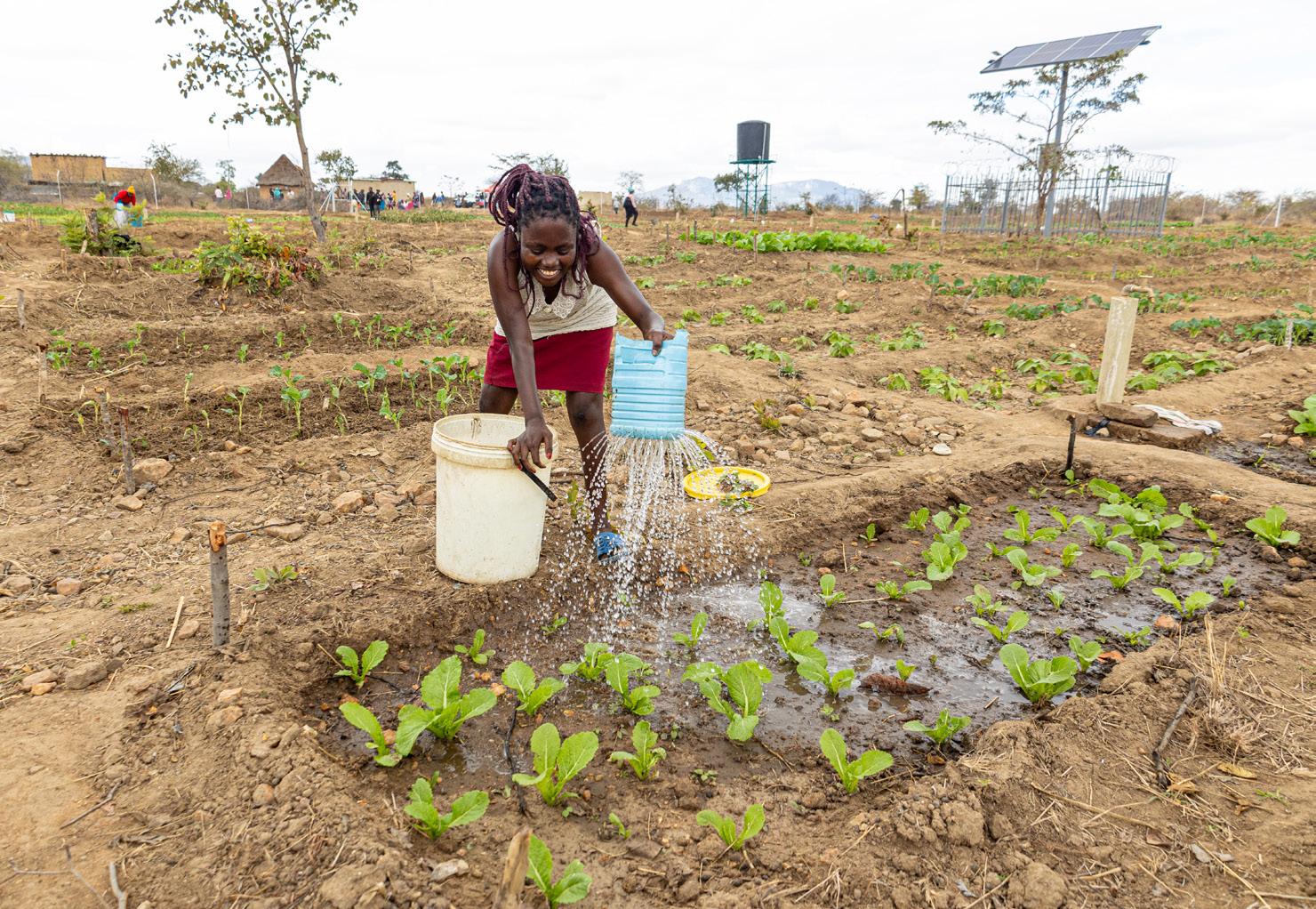 July 26, 2023: MARVELLOUS MWAZIKANA (25) uses a home made spray tin to irrigate one of her garden bed. “When we started digging, we had to pour water on the ground first to make digging easier. It was difficult for me to dig so my mother and siblings had to help me.” Marvellous was part of USAID Takunda’s first cohort of students at Marange Vocational