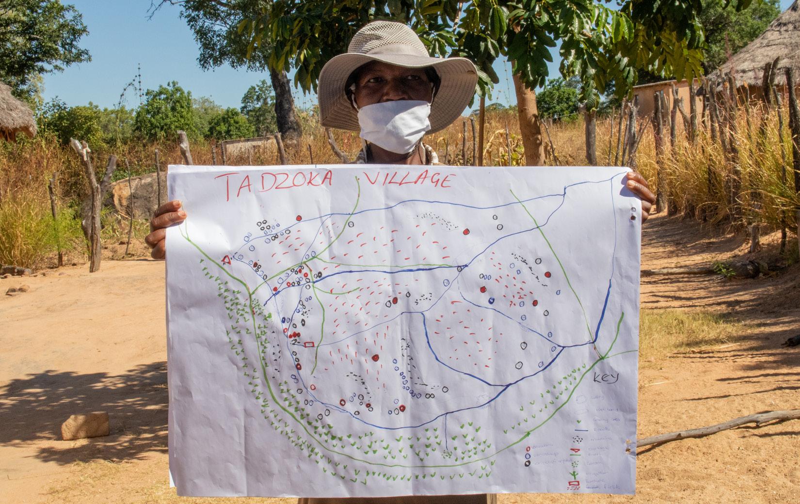 APRIL 11, 2021: Memory Jameson, a resident of Tadzoka village, poses for a picture with the result of her cartographic skills which identify natural resources, roads, dip tanks, gardens, and irrigation systems in her village. As part of the community visioning process in Ward 12 (Chivi District), the legend on Memory’s map identifies well-to-do households (red circles), middle-income households (black circles), and in blue circles, vulnerable