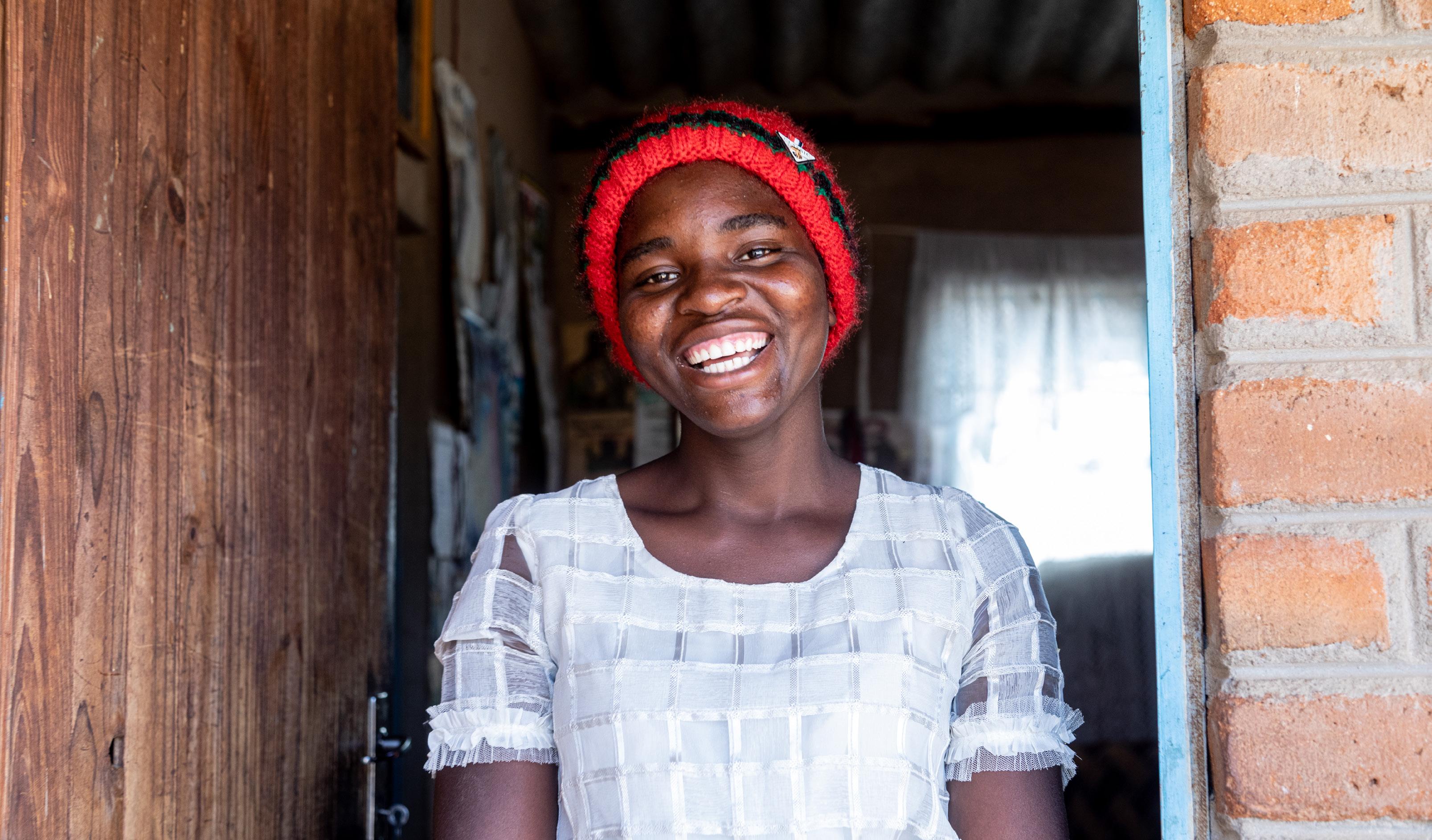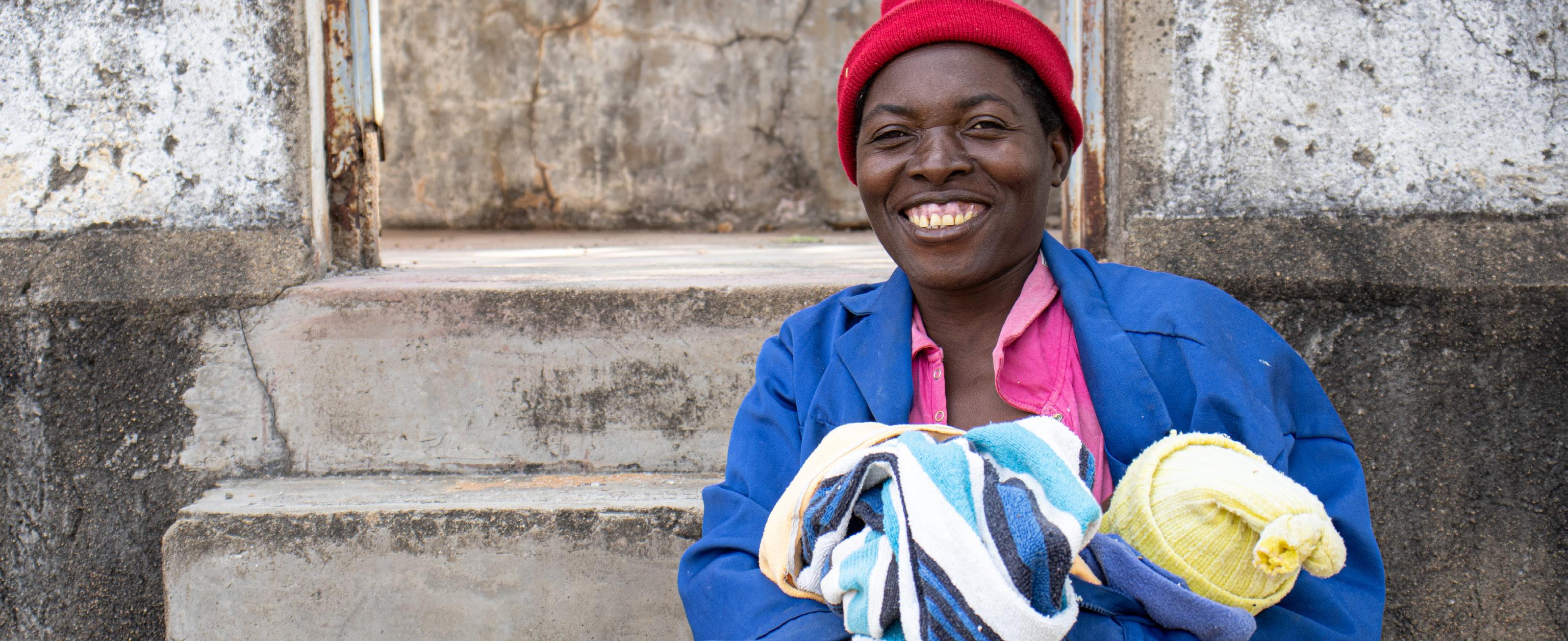 Today, Everjoy lives a different life from the one she grew up in. “My mother-in-law has been teaching me how to saw. When she purchases clothing material, she makes sure she gets some for me.” Using the floor as her cutting table and an old dishwashing sponge as a pincushion, Everjoy neatly cuts out a pattern for a face mask. “I can make face masks and underwear, and my mother-in-law sells what I make.”