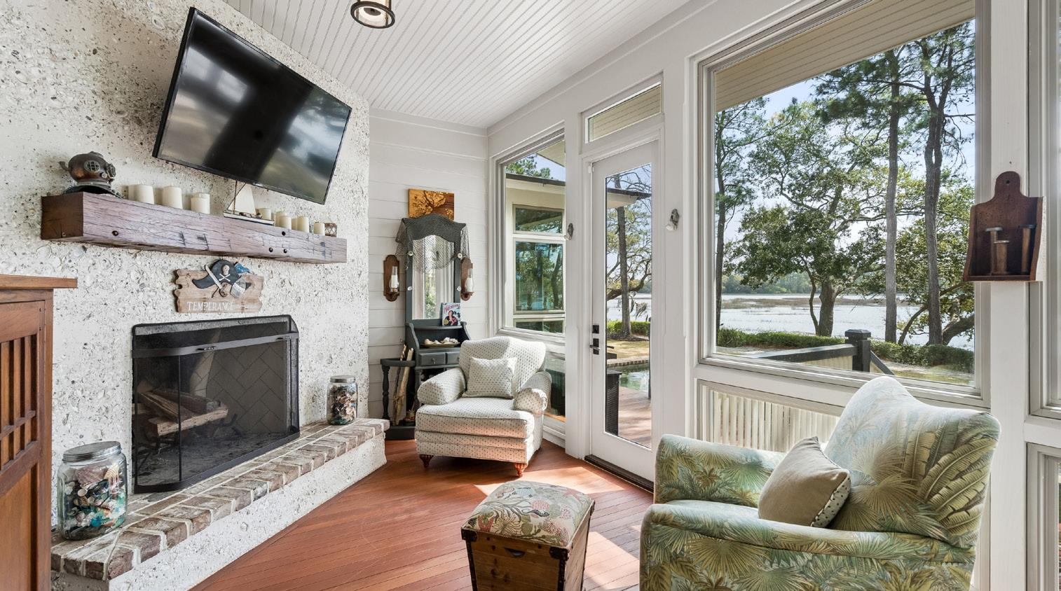 Inside, reclaimed hardwood floors, extensive millwork, and custom built-ins reflect exceptional craftsmanship at every turn. The main living space centers around a fireplace and flows seamlessly into the dining area with a custom built-in, then opens to an enclosed porch with panoramic river views.