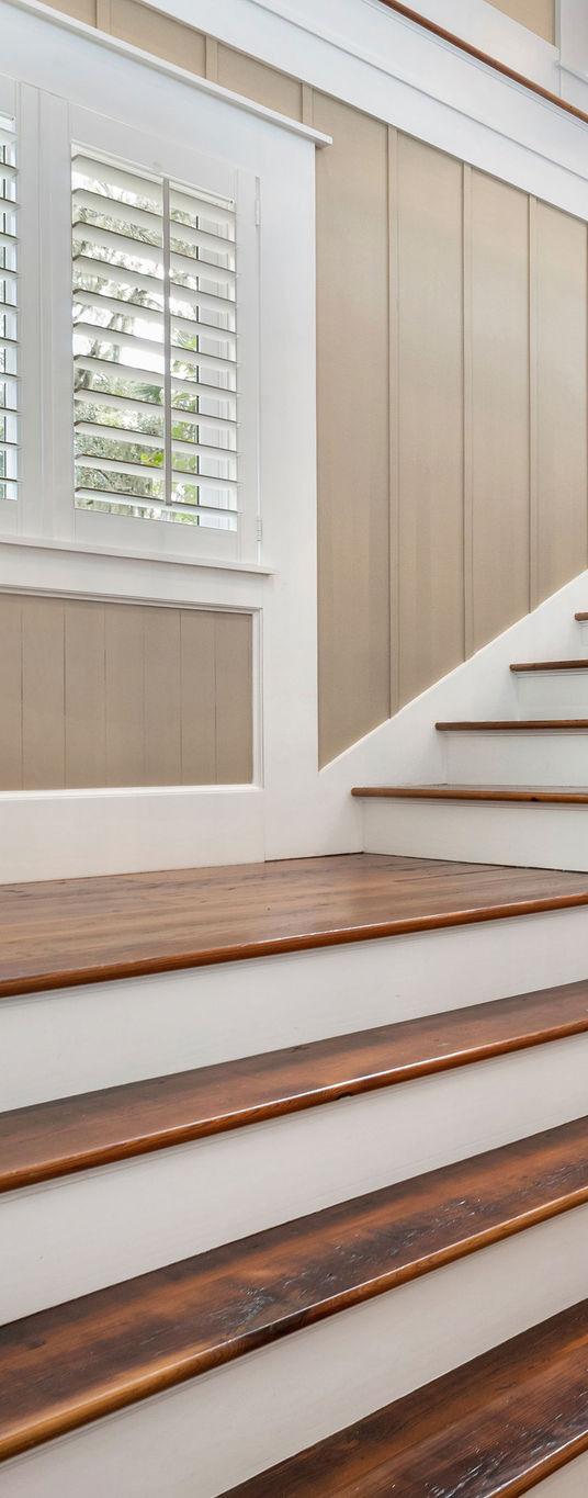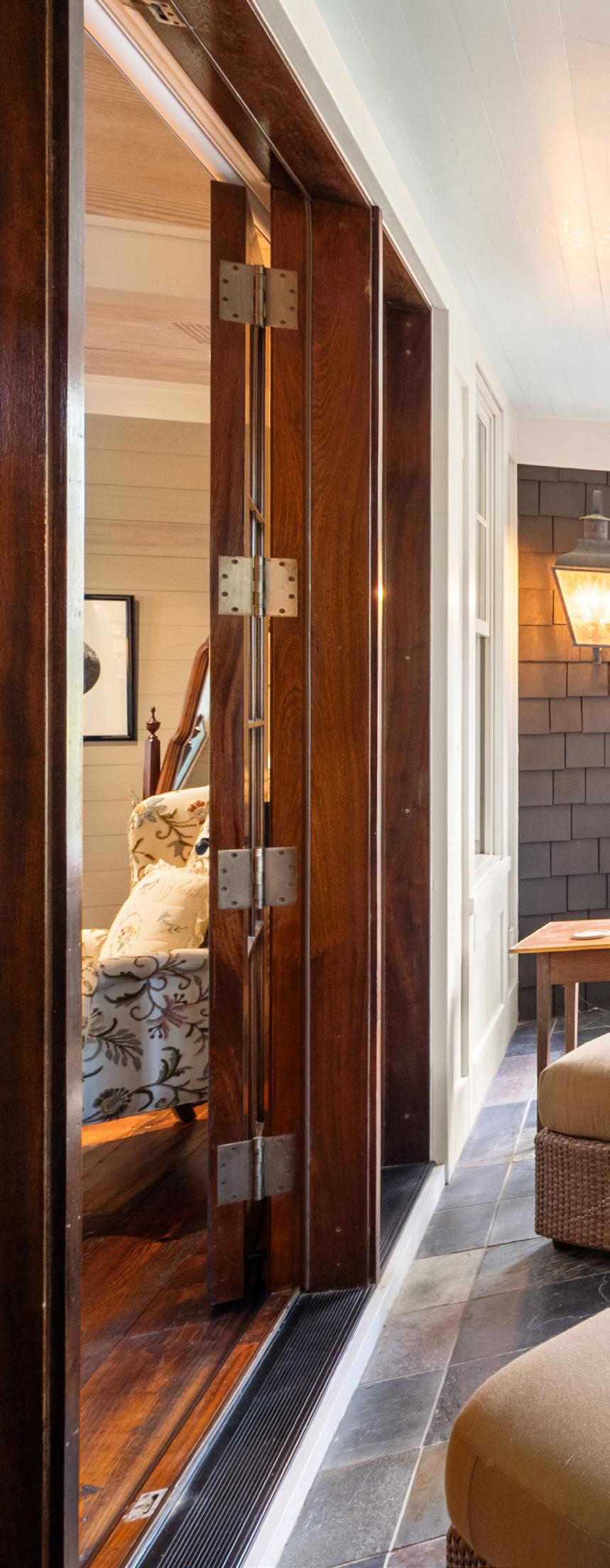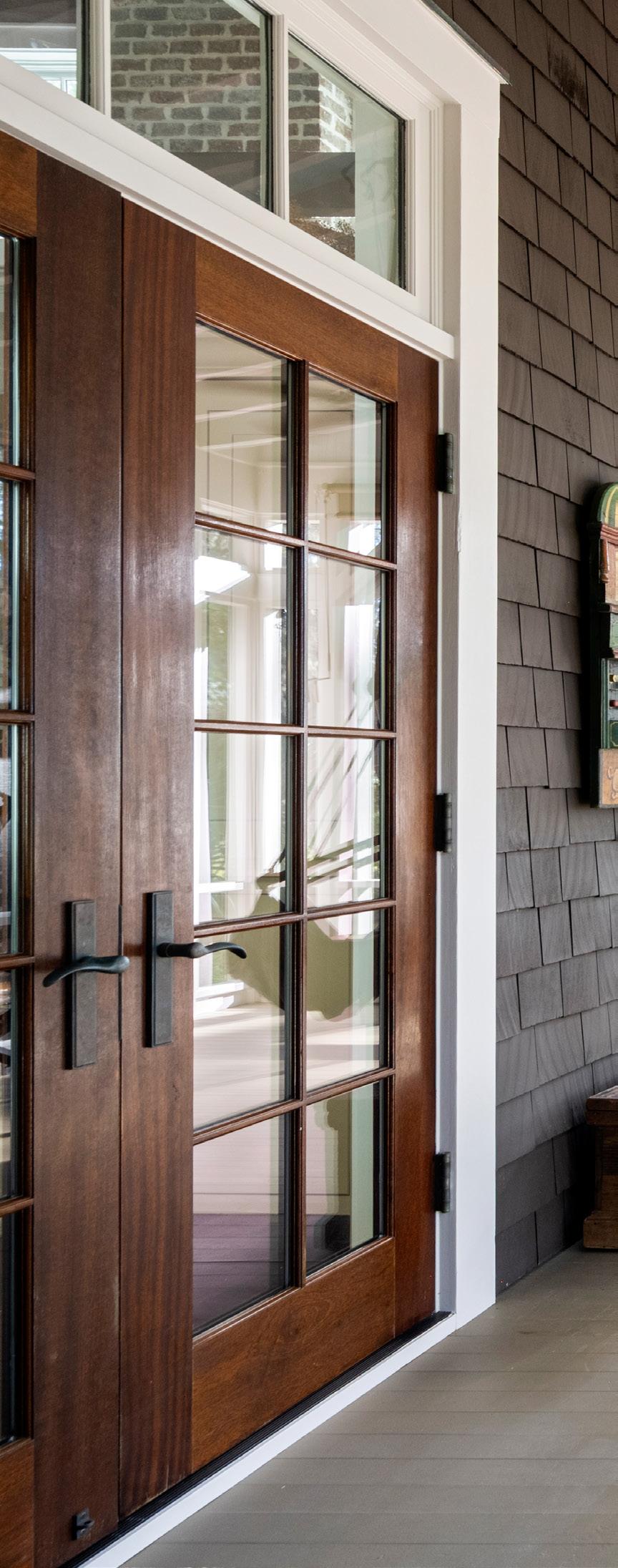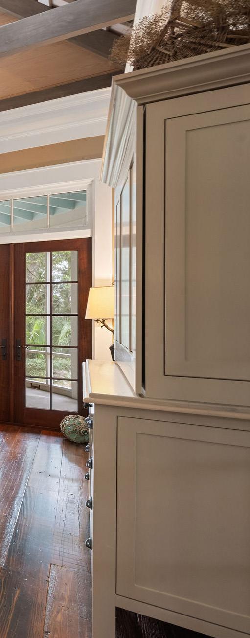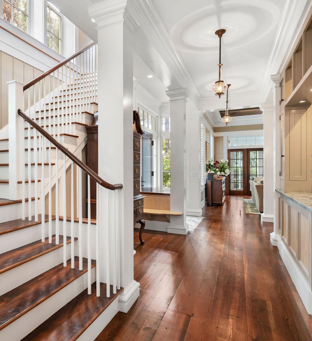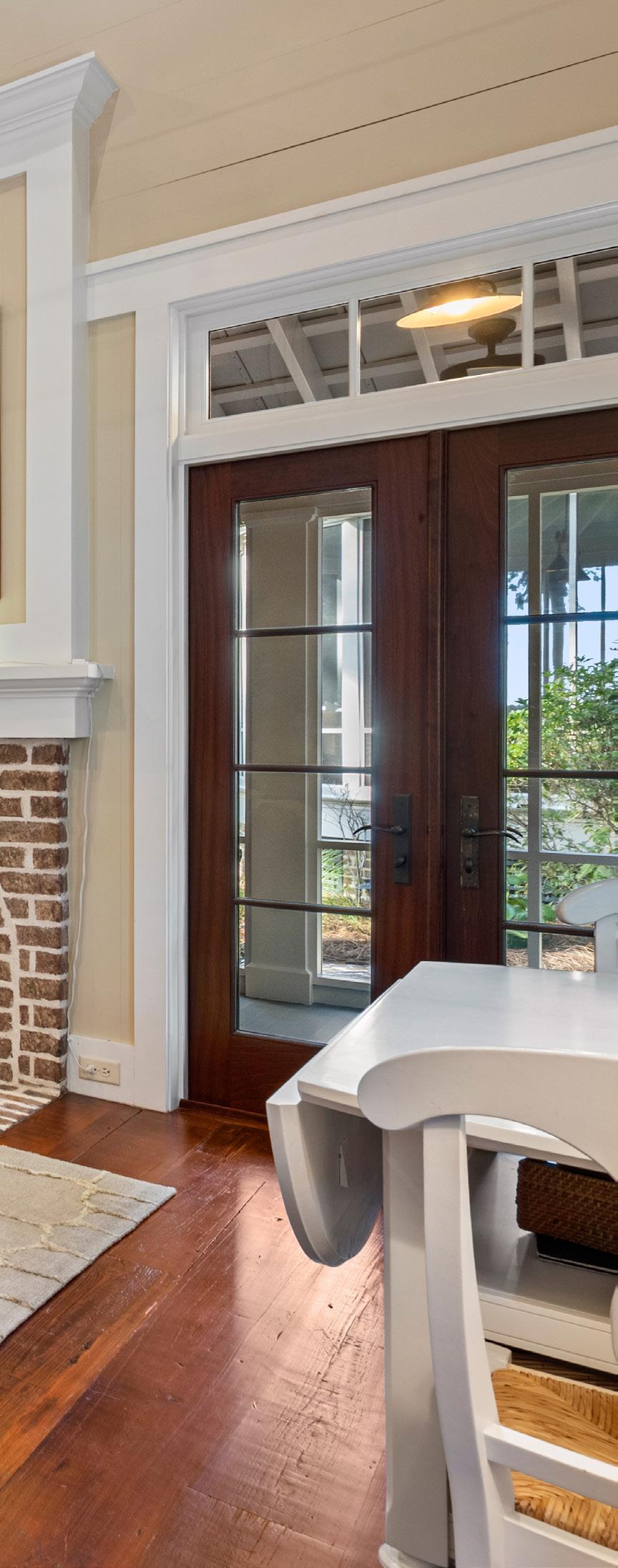 Sunlight pours through a wall of French doors, illuminating rich hardwood floors and warm neutral tones that create an atmosphere of understated sophistication. Every architectural detail — from the transom windows to the tailored trim — reflects exceptional craftsmanship. The result is a space that perfectly captures the spirit of refined coastal living: relaxed, graceful, and effortlessly inviting.