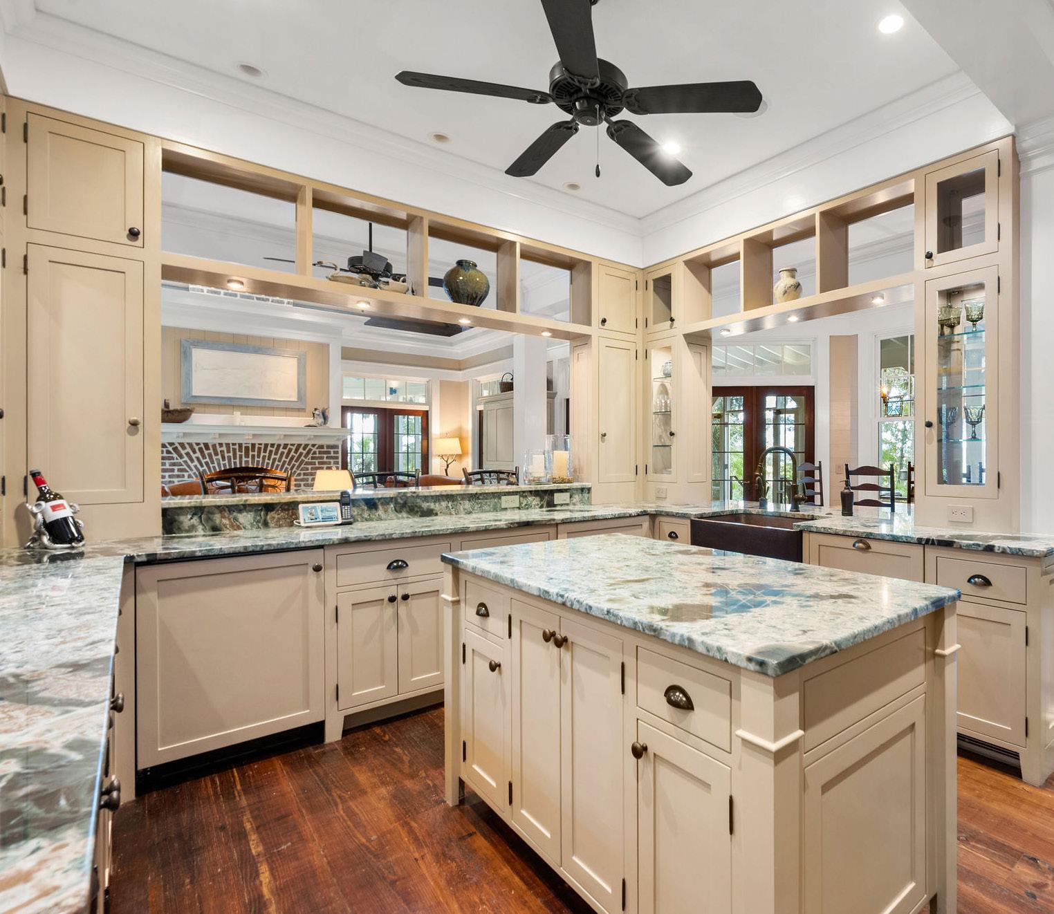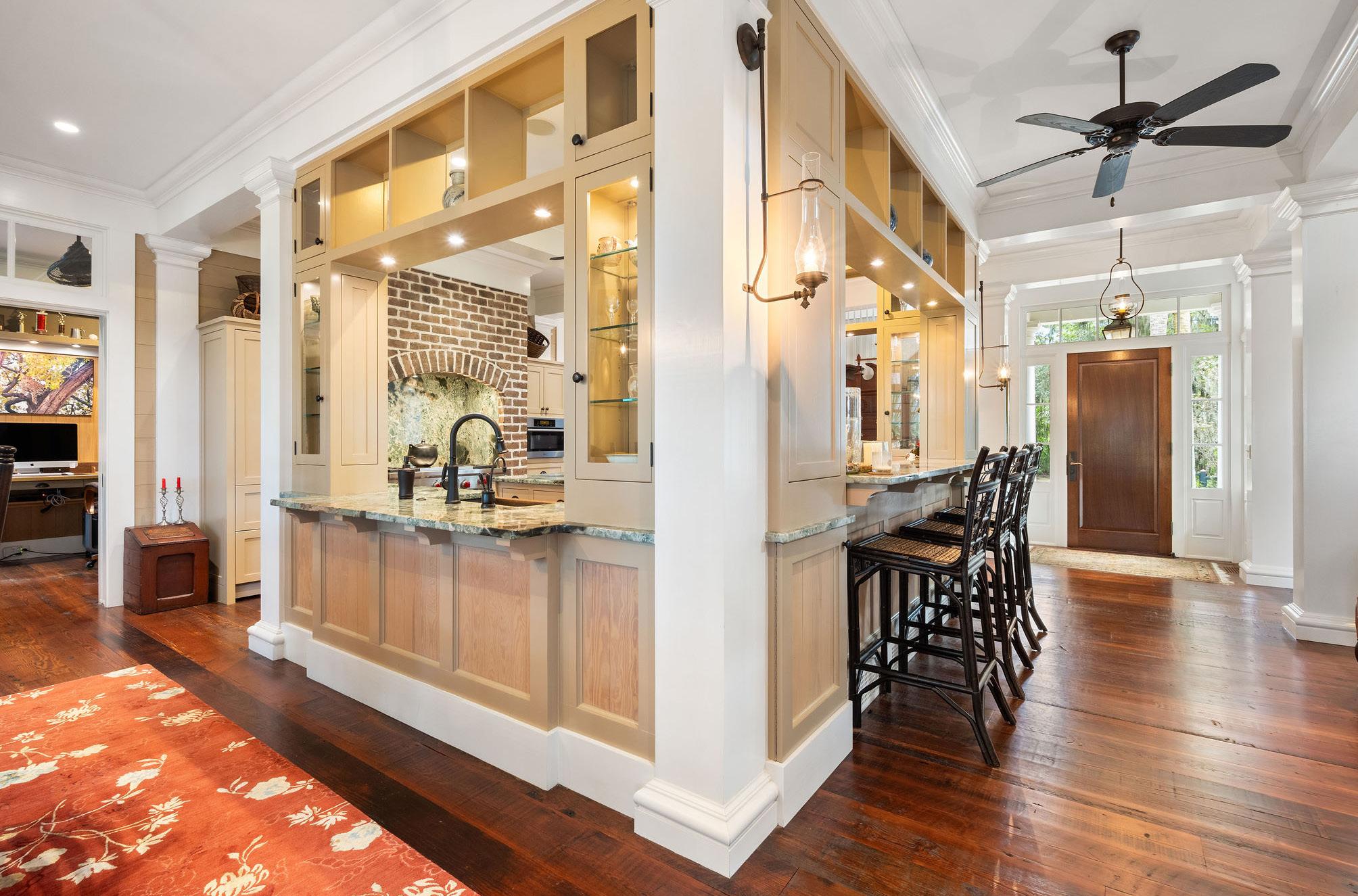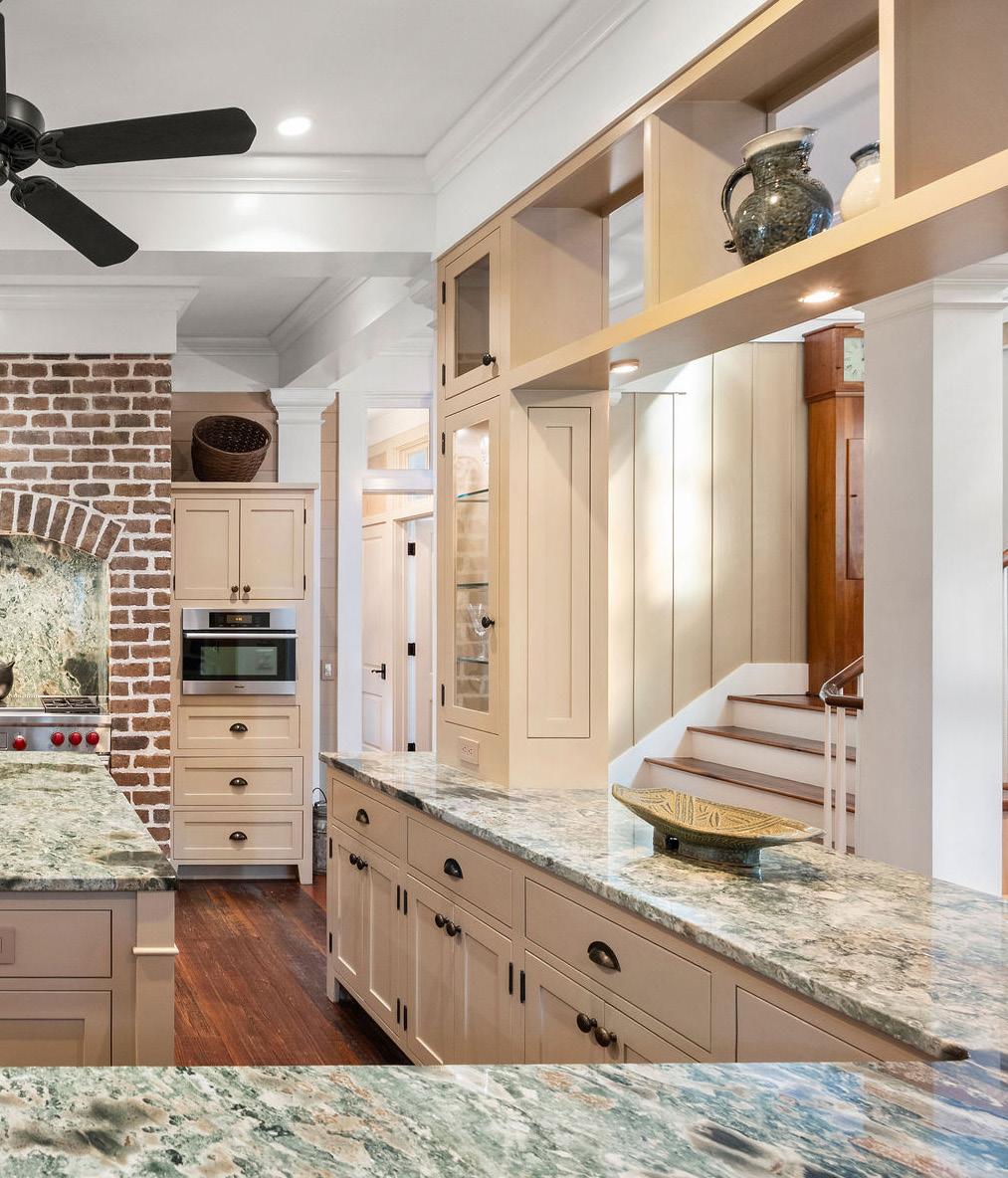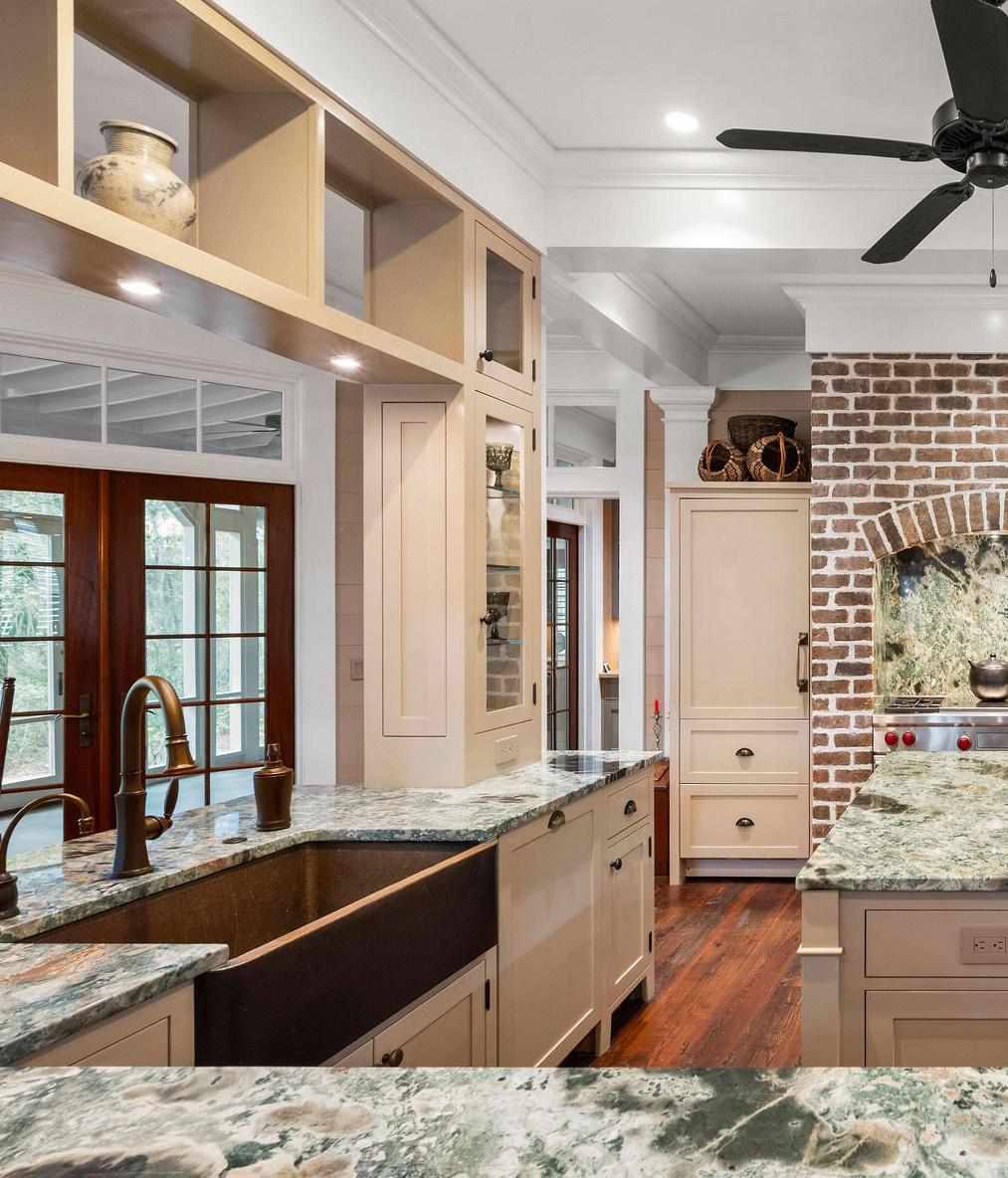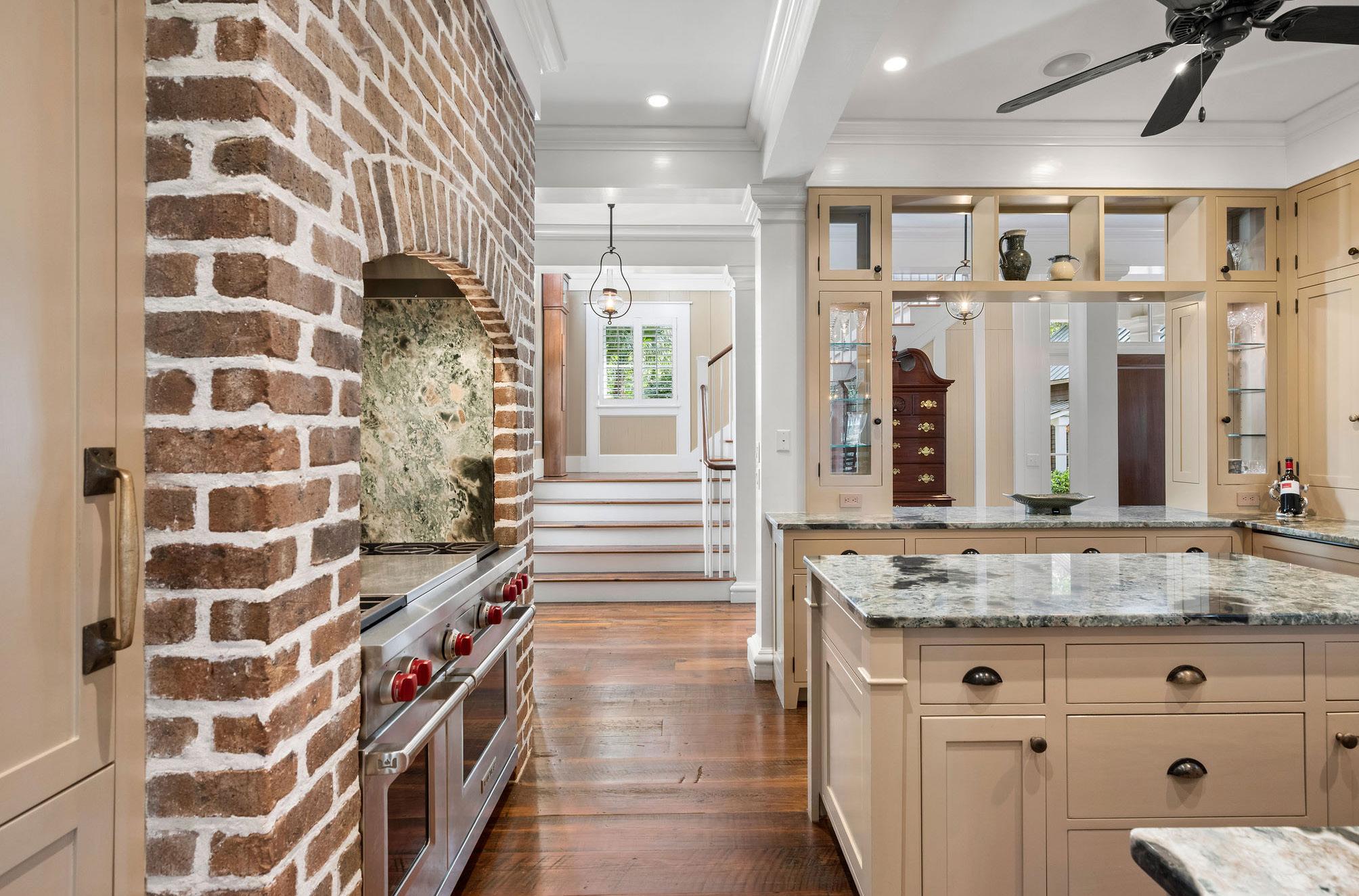 This striking Lowcountry kitchen balances craftsmanship and character in perfect harmony. Custom cabinetry in a soft neutral hue pairs effortlessly with richly veined stone countertops that echo the organic patterns and hues of the surrounding marsh, creating a timeless and inviting palette. A graceful brick archway frames the professional-grade Wolf range, adding warmth, texture, and architectural presence to the heart of the home.