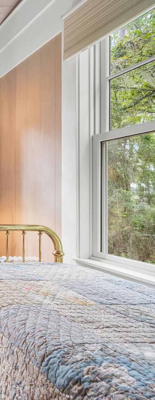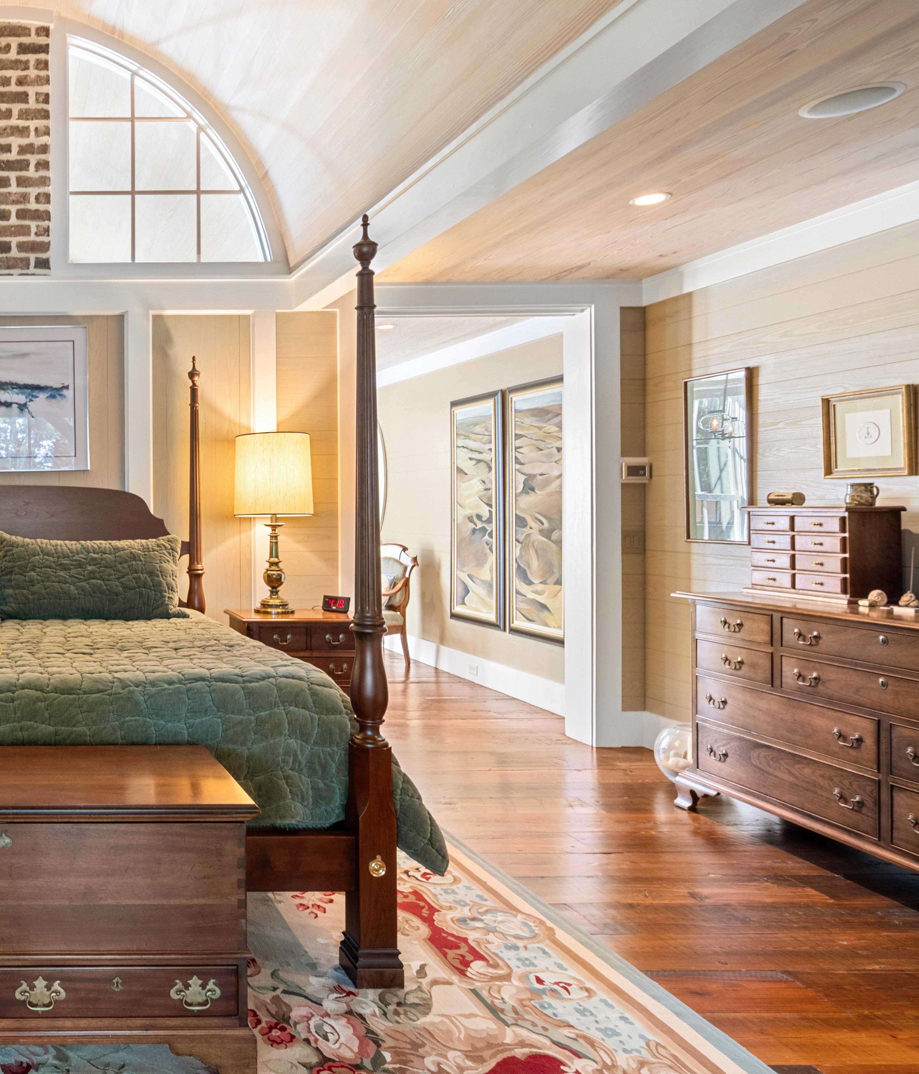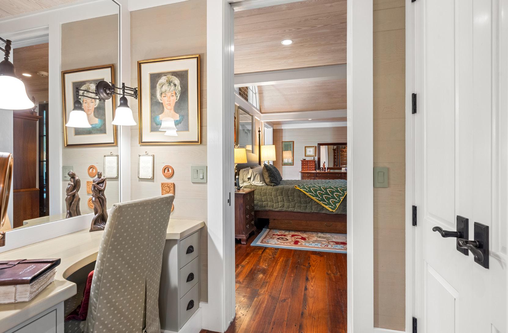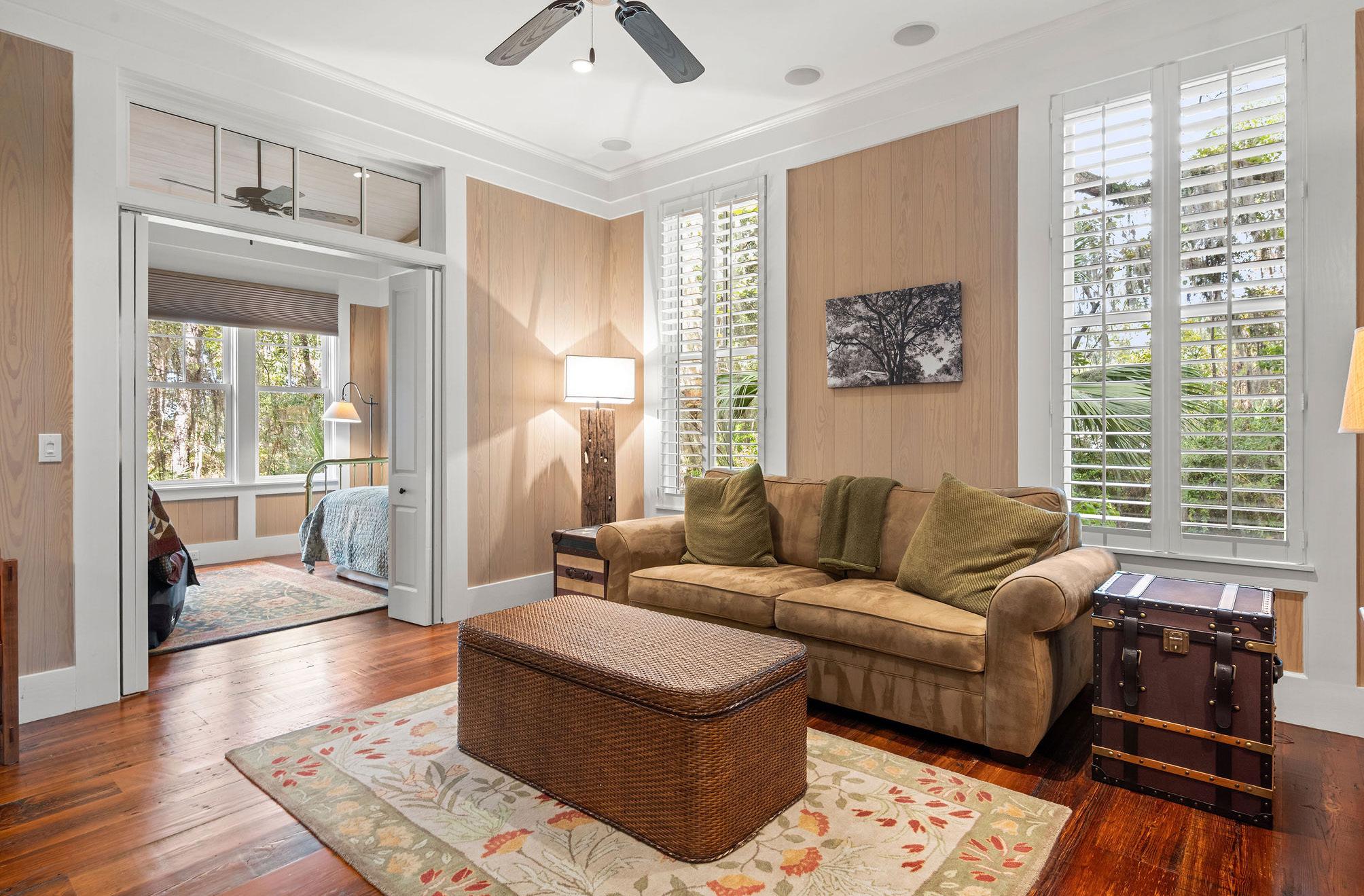 This inviting guest suite offers comfort, privacy, and a touch of Lowcountry charm. Warm wood paneling, plantation shutters, and rich hardwood floors set a tone of understated elegance and relaxation. A cozy sitting area provides the perfect retreat for reading or quiet reflection, while the adjoining bedroom enjoys tranquil wooded views framed by expansive picture windows.