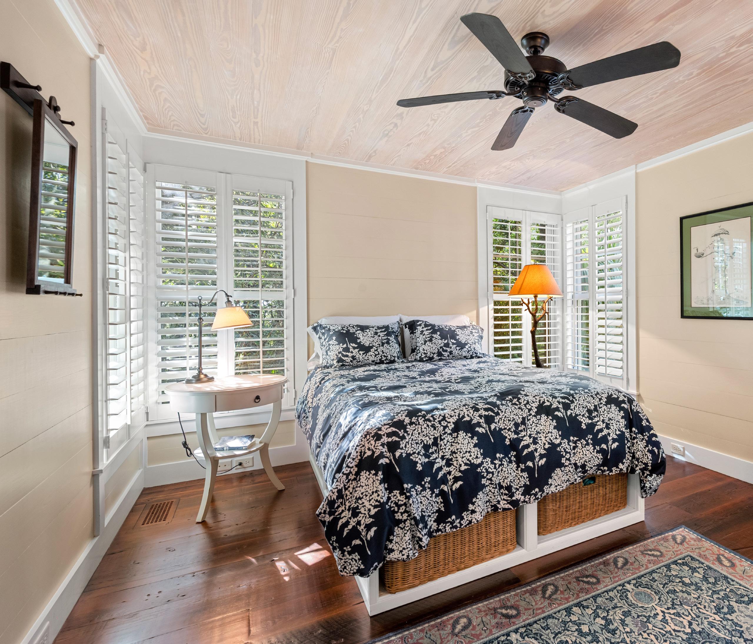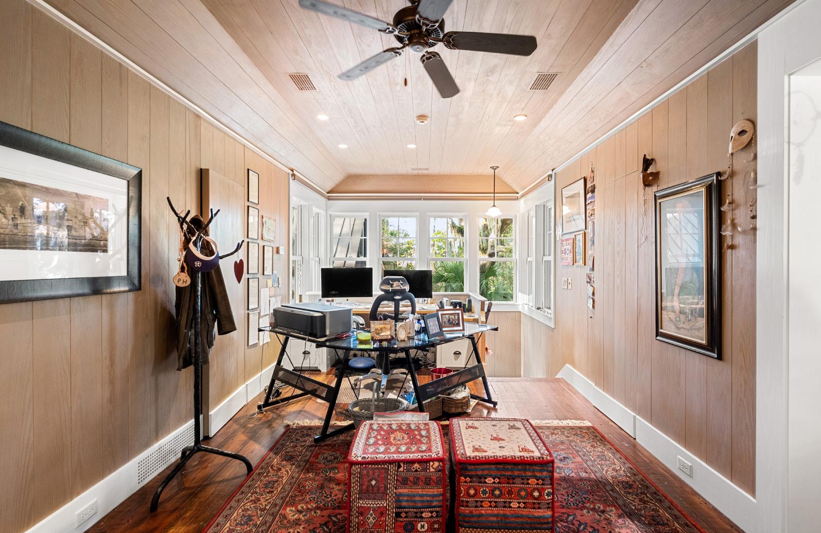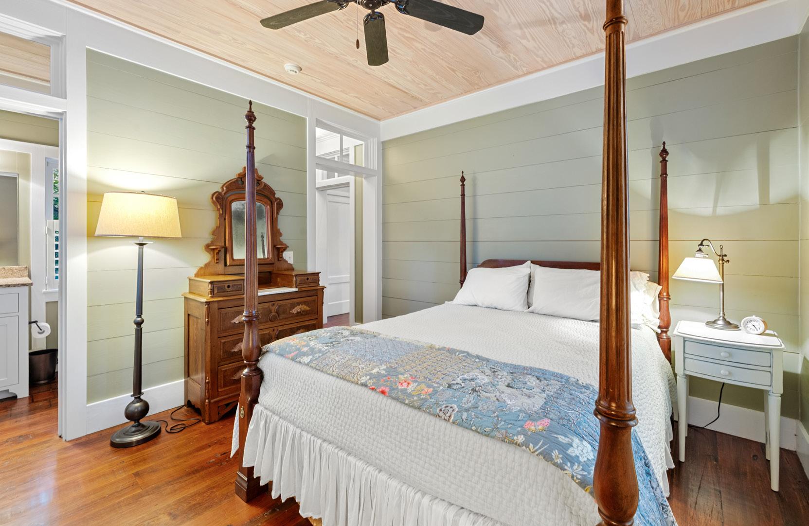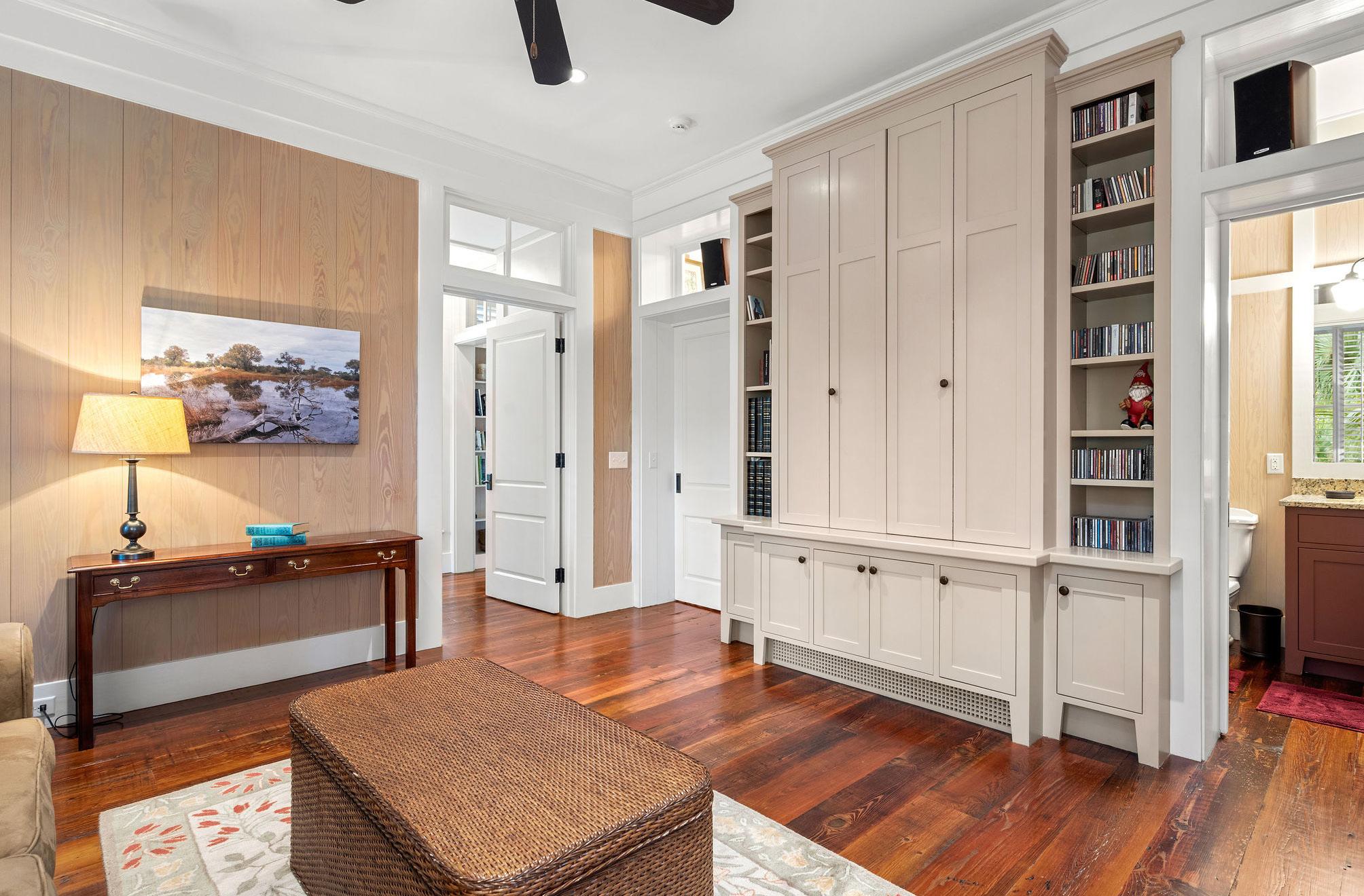 This inviting guest suite offers comfort, privacy, and a touch of Lowcountry charm. Warm wood paneling, plantation shutters, and rich hardwood floors set a tone of understated elegance and relaxation. A cozy sitting area provides the perfect retreat for reading or quiet reflection, while the adjoining bedroom enjoys tranquil wooded views framed by expansive picture windows.