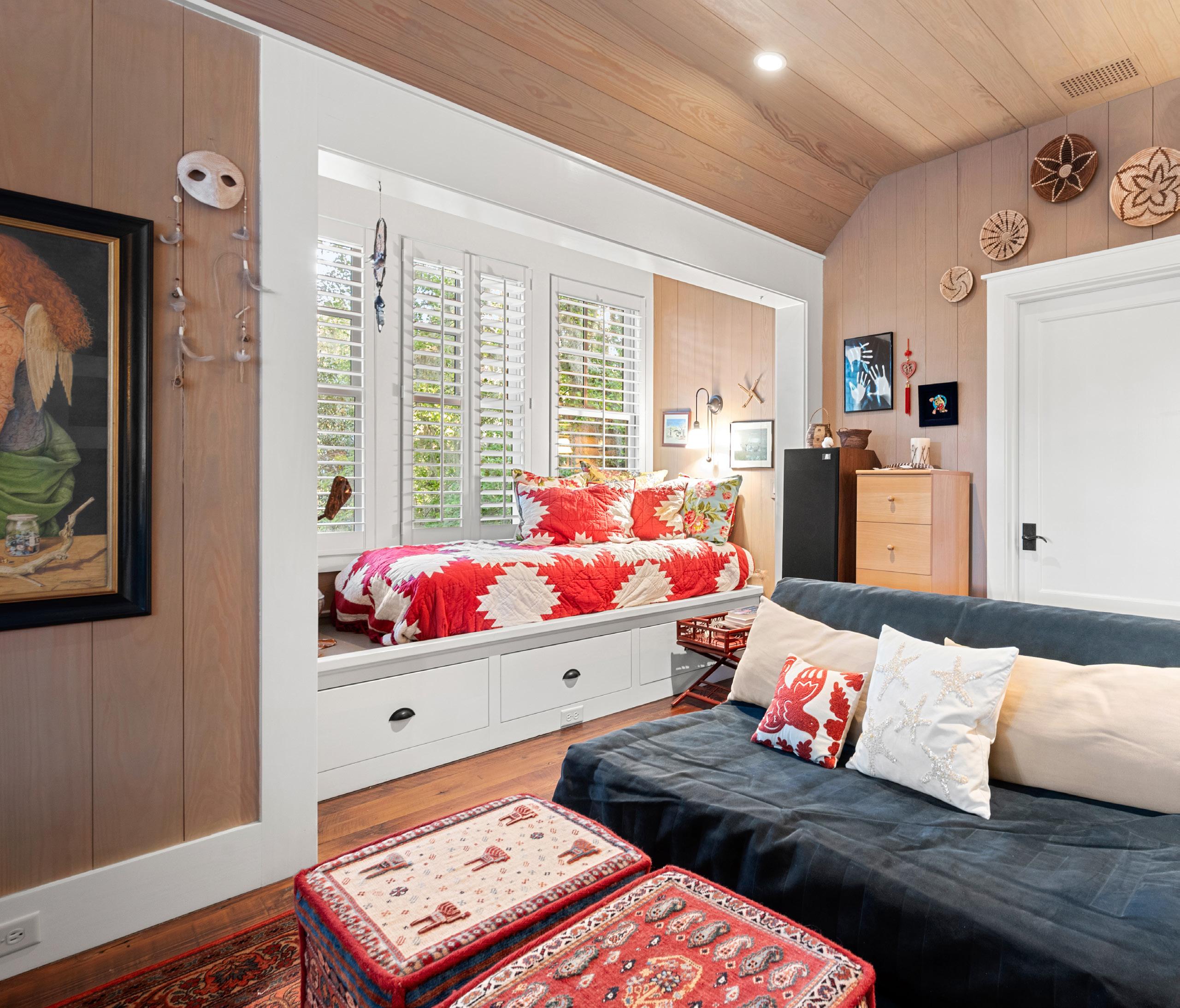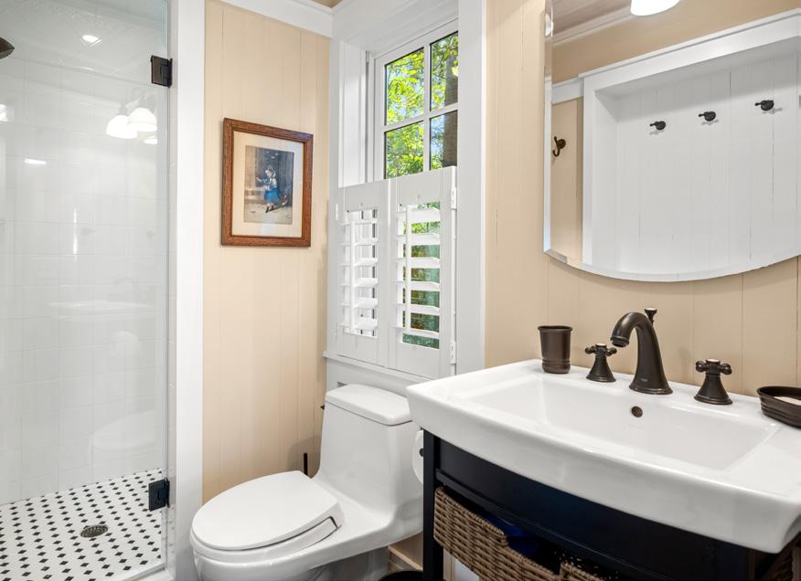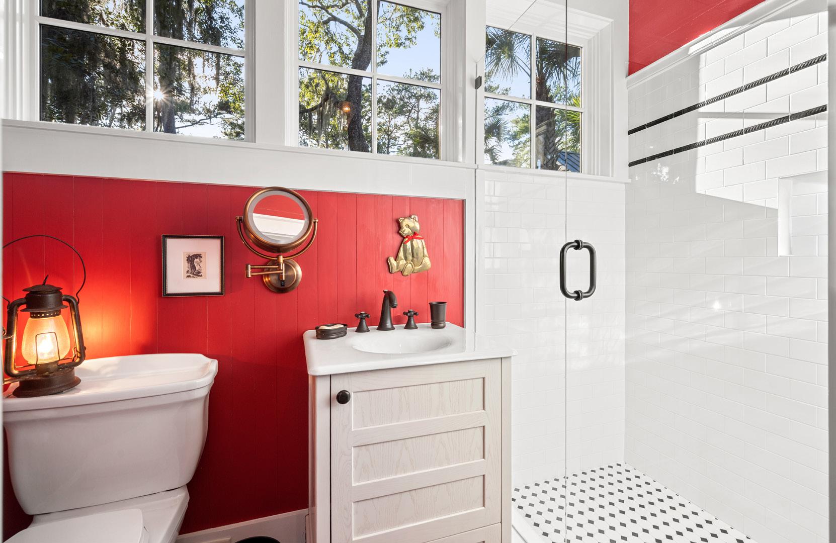Inside, warm wood paneling and spaces flooded with natural light create a versatile retreat, perfectly suited to serve as a guest suite, home office, or artist’s studio. Thoughtful details—including a built-in daybed, a striking red-and-white bathroom, and a dedicated darkroom—enhance both function and personality. More than a functional space, this carriage house is a private sanctuary, thoughtfully designed to celebrate artistry, comfort, and the refined charm of Southern living.
