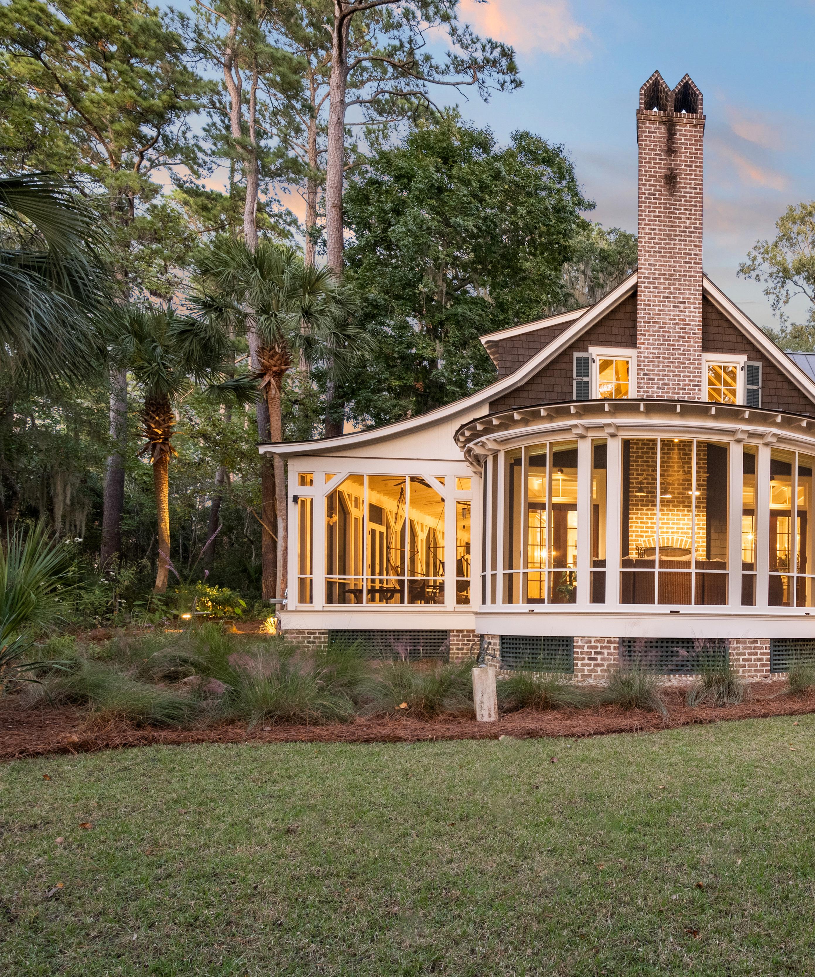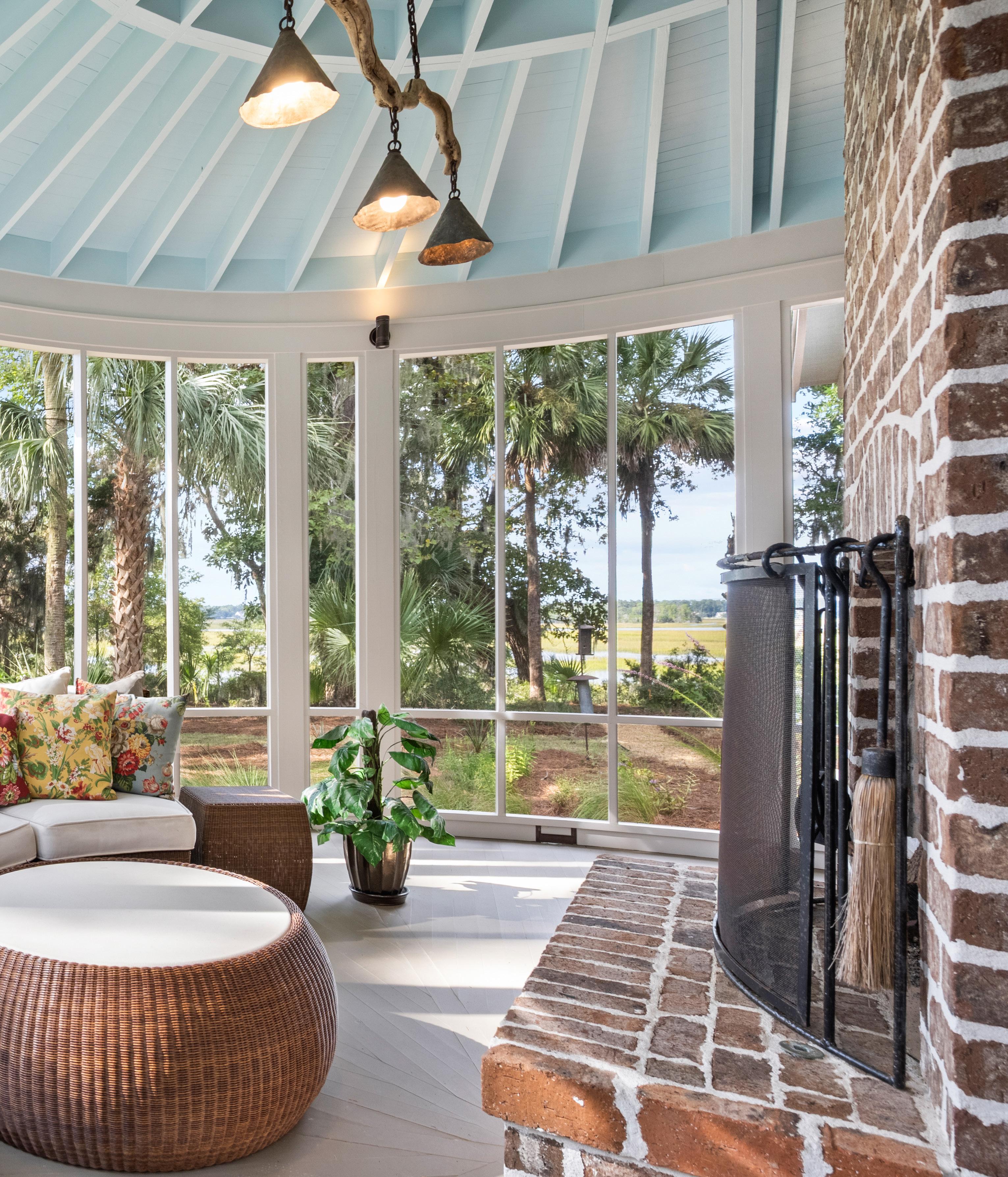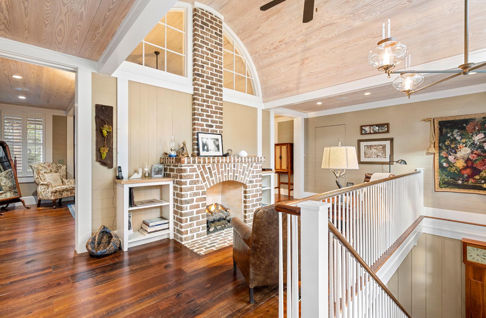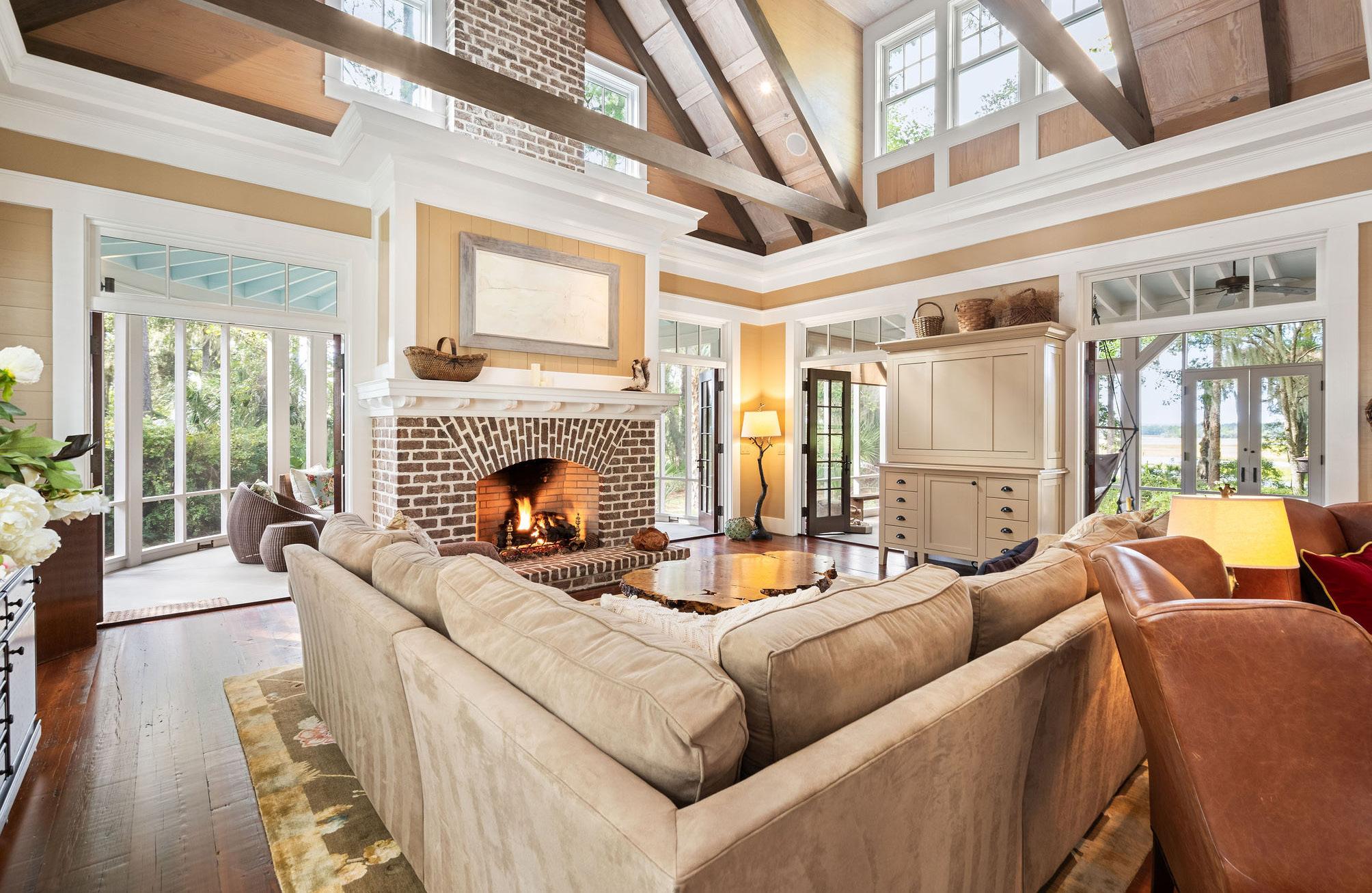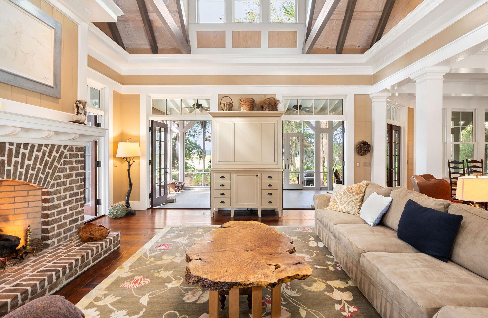The east wing of the home features an apsidal screened porch anchored by a Savannah brick fireplace, creating a warm and inviting space for Lowcountry outdoor living. Vaulted ceilings, rich wood accents, and expansive openings bring in natural light and gentle coastal breezes, making this porch perfect for intimate gatherings, quiet reflection, or cozy evenings by the fire. Every detail emphasizes comfort, craftsmanship, and a seamless connection to the surrounding landscape.