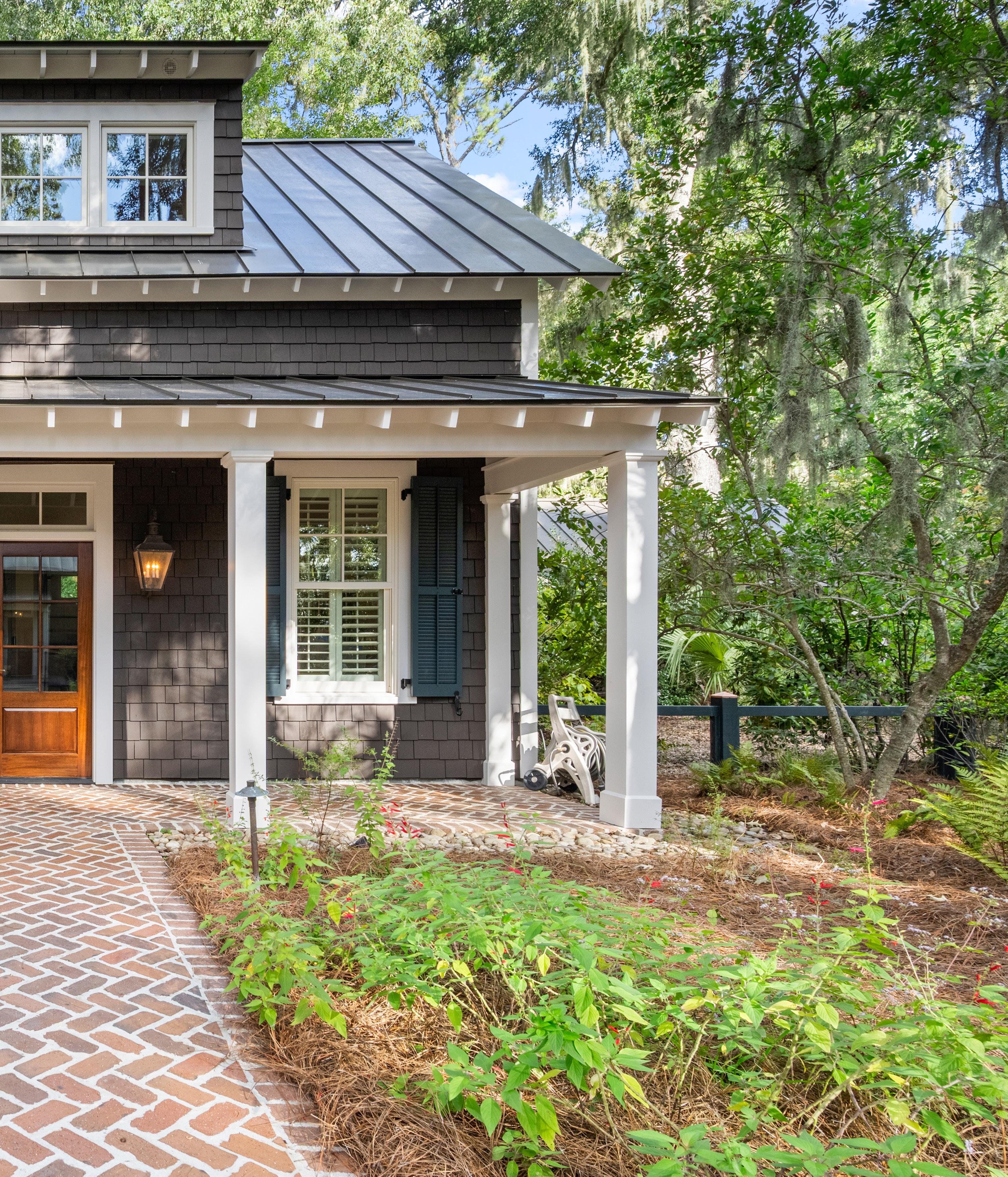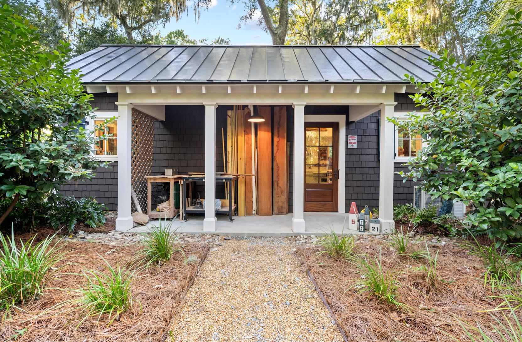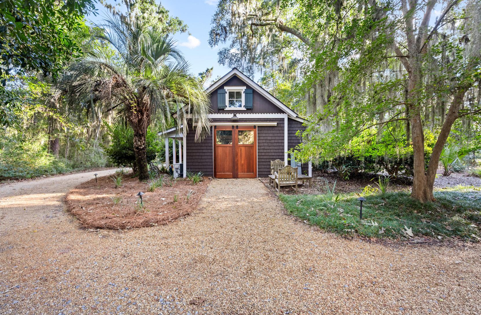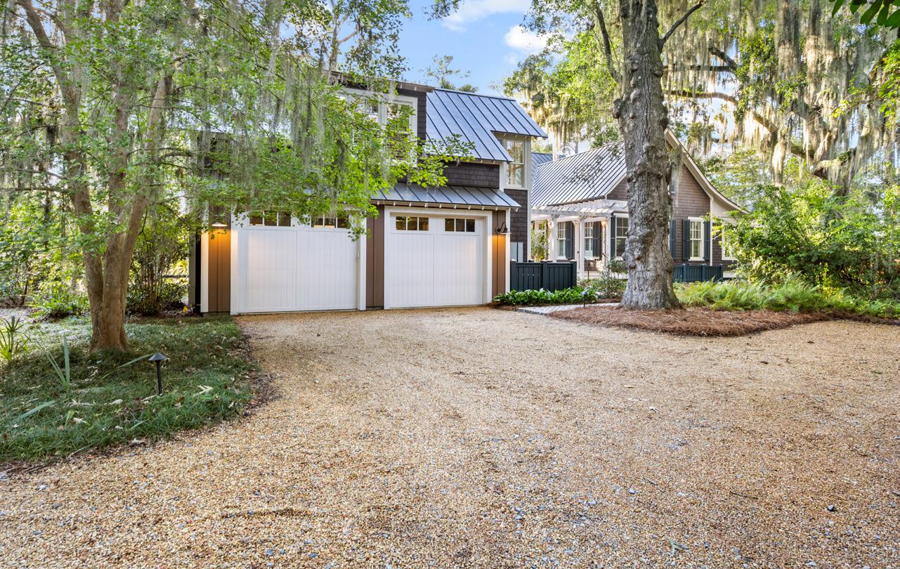 Tucked beneath the shade of ancient oaks draped in Spanish moss, this elegant carriage house is a hidden gem, showcasing expert craftsmanship and inspired design. The exterior exudes timeless Lowcountry appeal, with board-and-batten siding, crisp white garage doors, and a gleaming metal roof that shimmers in the southern sun, flowing effortlessly into a bright and inviting interior.