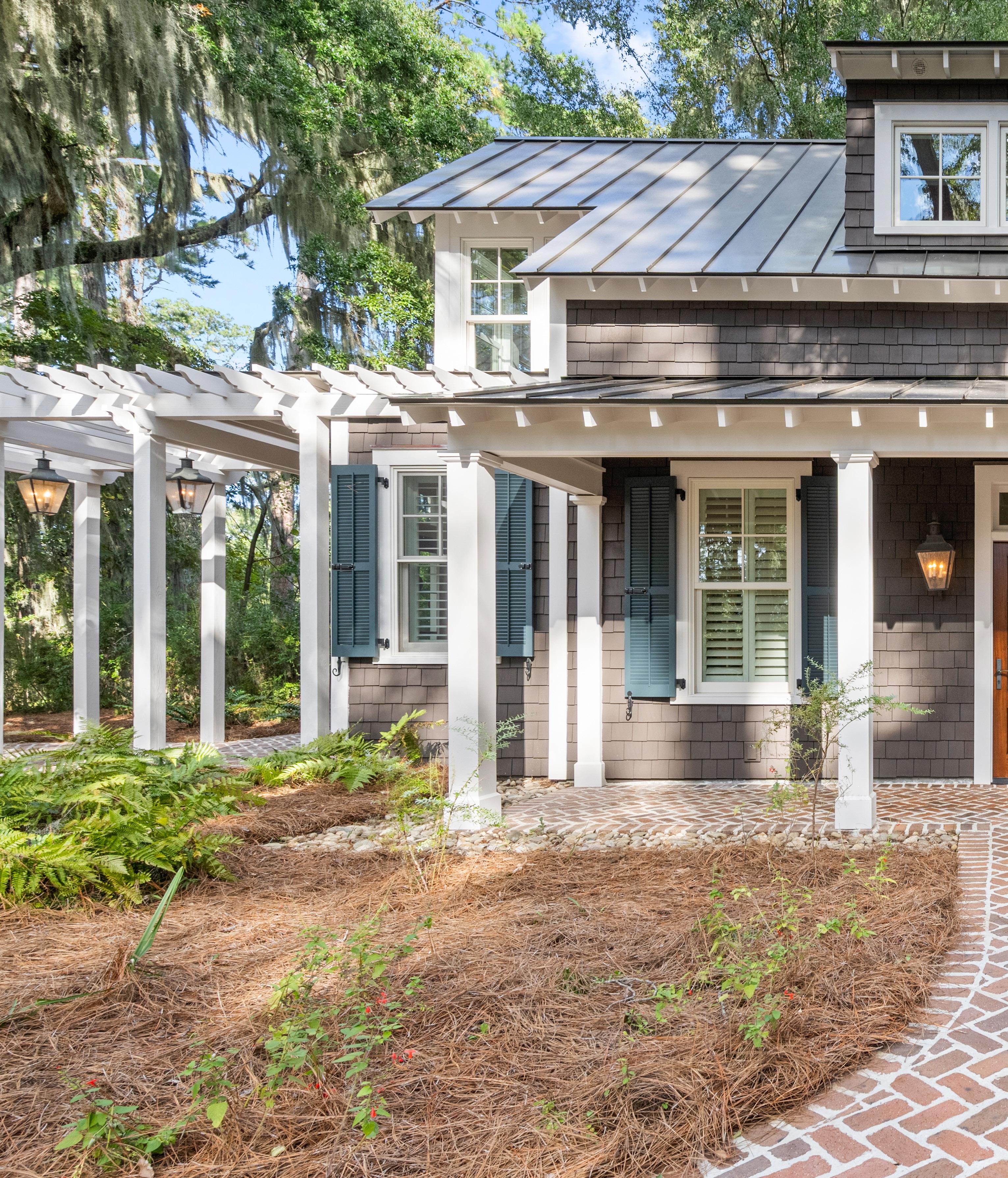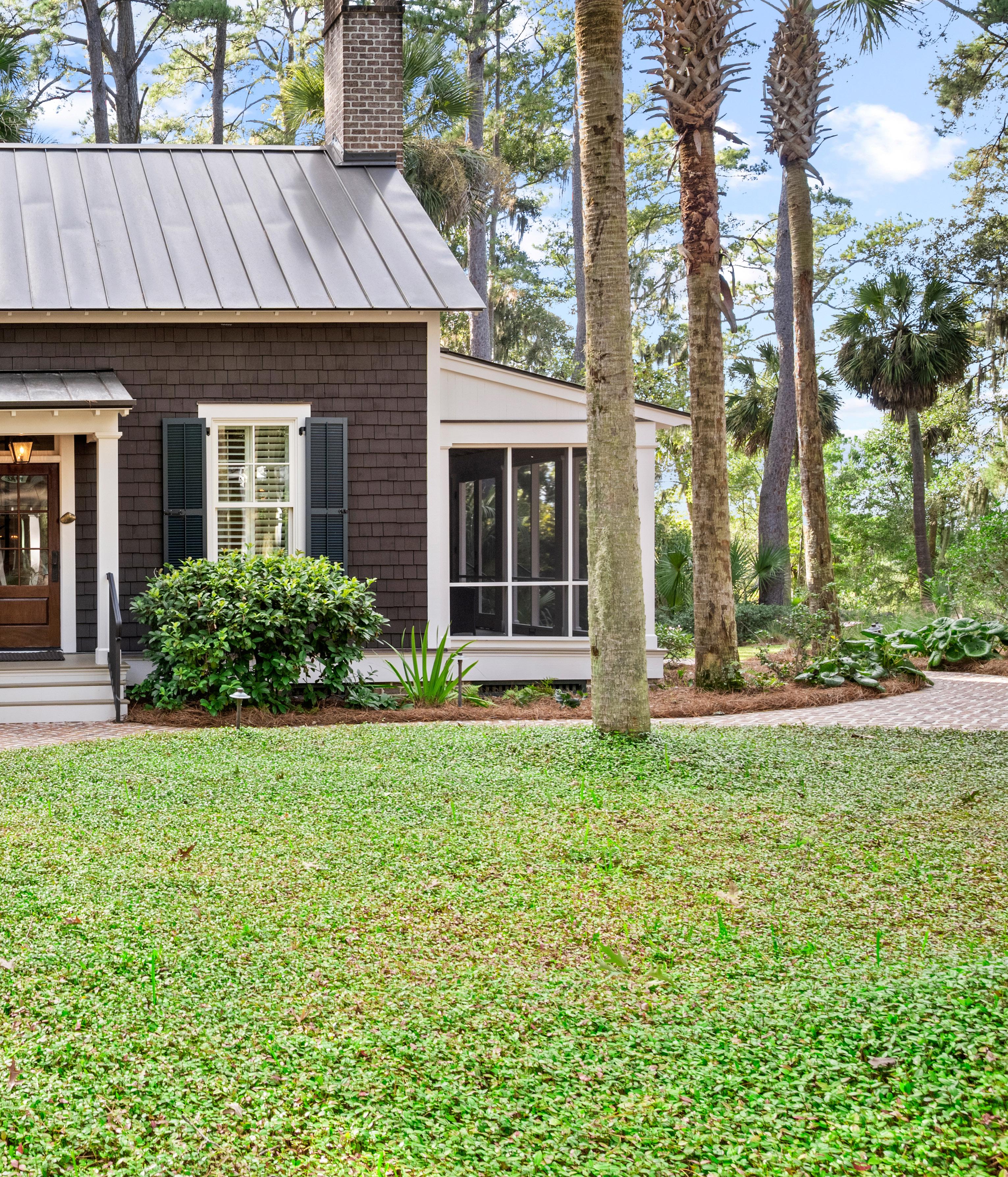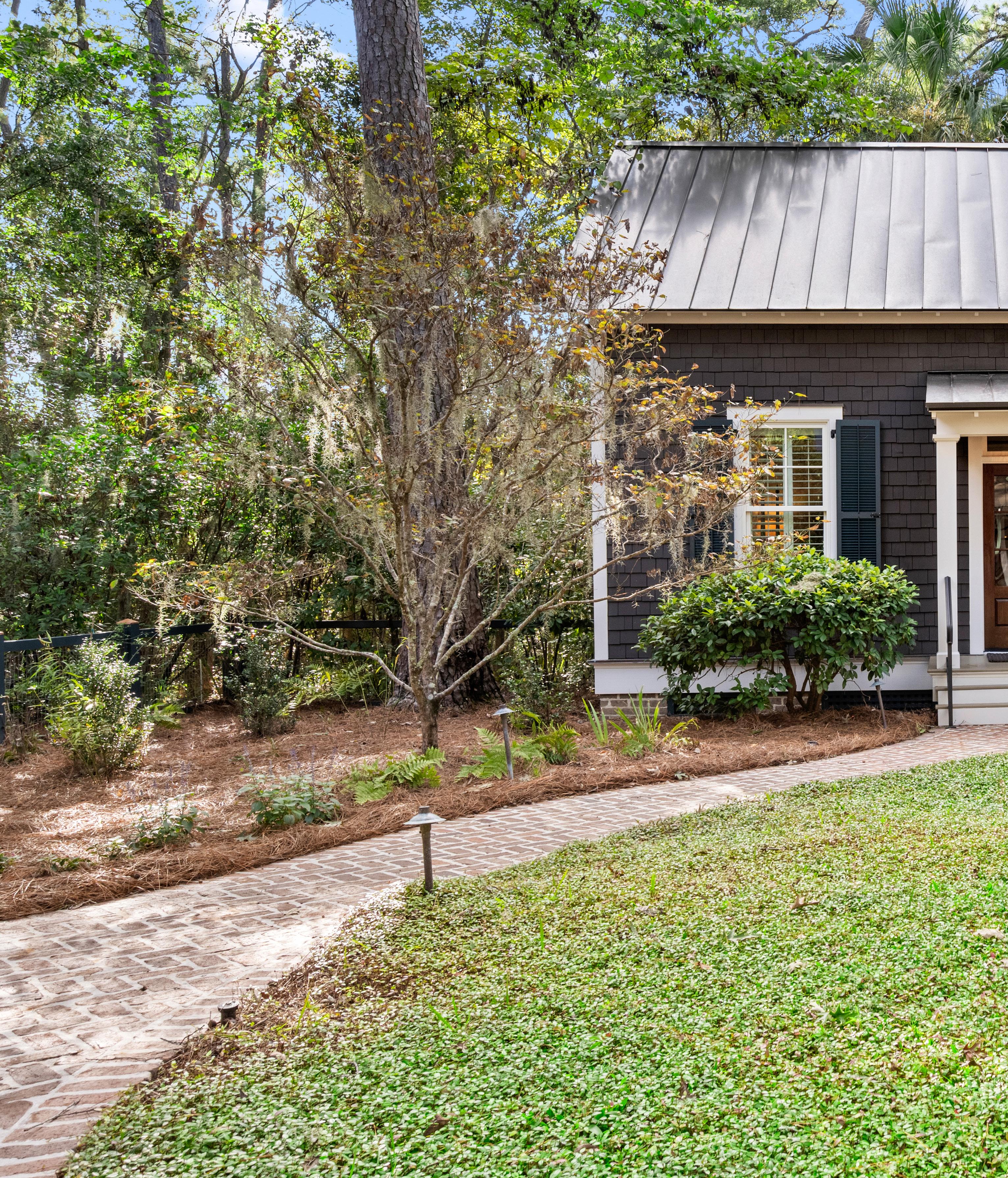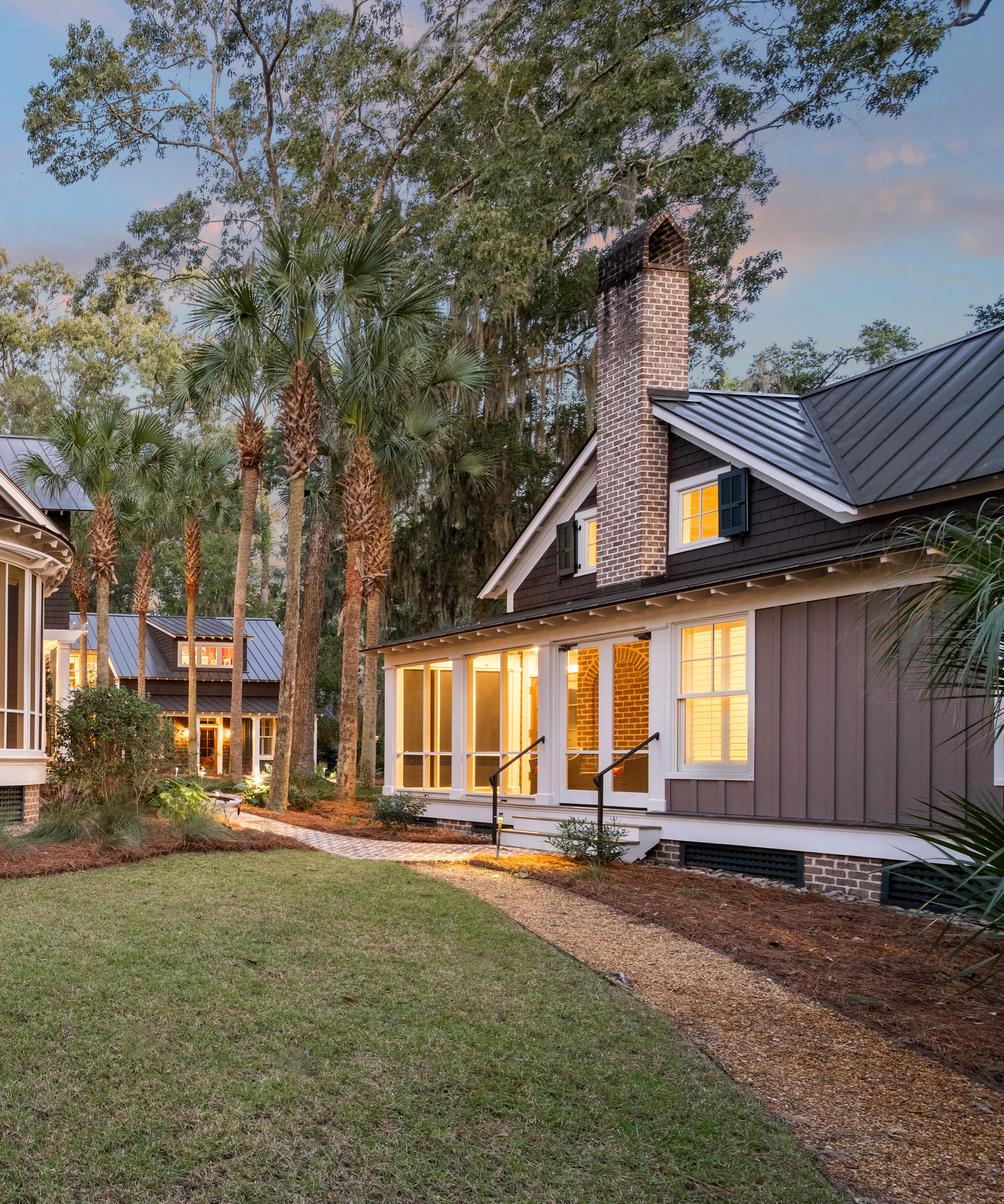 Tucked beneath the shade of ancient oaks draped in Spanish moss, this elegant carriage house is a hidden gem, showcasing expert craftsmanship and inspired design. The exterior exudes timeless Lowcountry appeal, with board-and-batten siding, crisp white garage doors, and a gleaming metal roof that shimmers in the southern sun, flowing effortlessly into a bright and inviting interior.