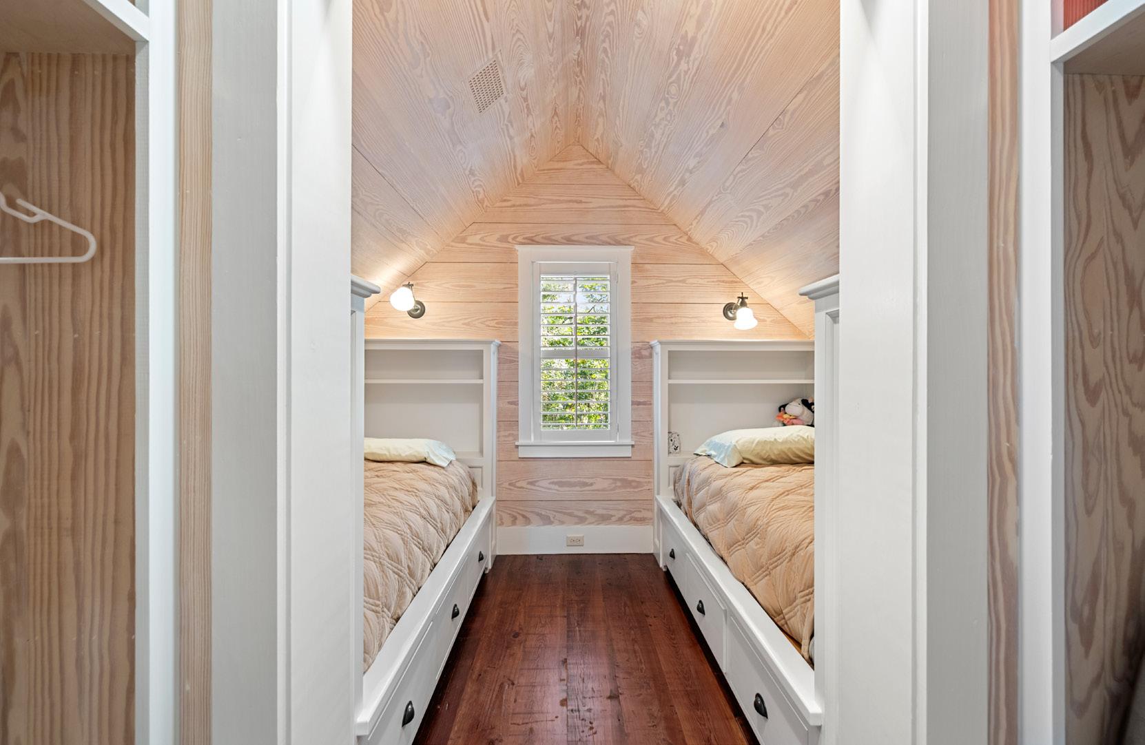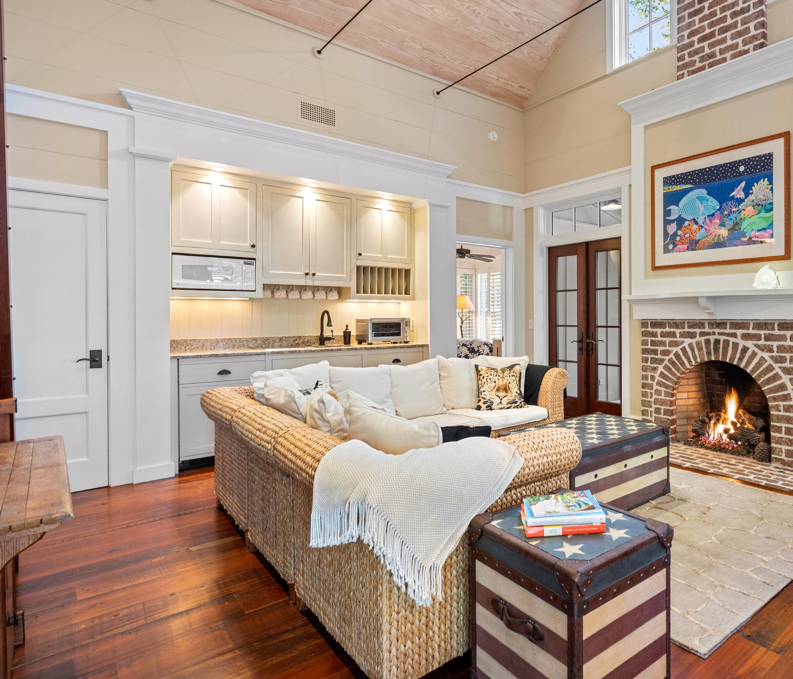 This charming guest house epitomizes refined Lowcountry living, blending timeless architecture with warmth, character, and thoughtful design. Anchored by a brick fireplace, the open Great Room soars with vaulted ceilings and is bathed in natural light, creating an airy, inviting space. The full kitchenette features premium appliances, elegant cabinetry, and granite countertops, perfectly balancing beauty and function. Thoughtful details— including reclaimed wood floors, plantation shutters, and an elevated sleeping loft with custom built-in beds—add charm, versatility, and character.