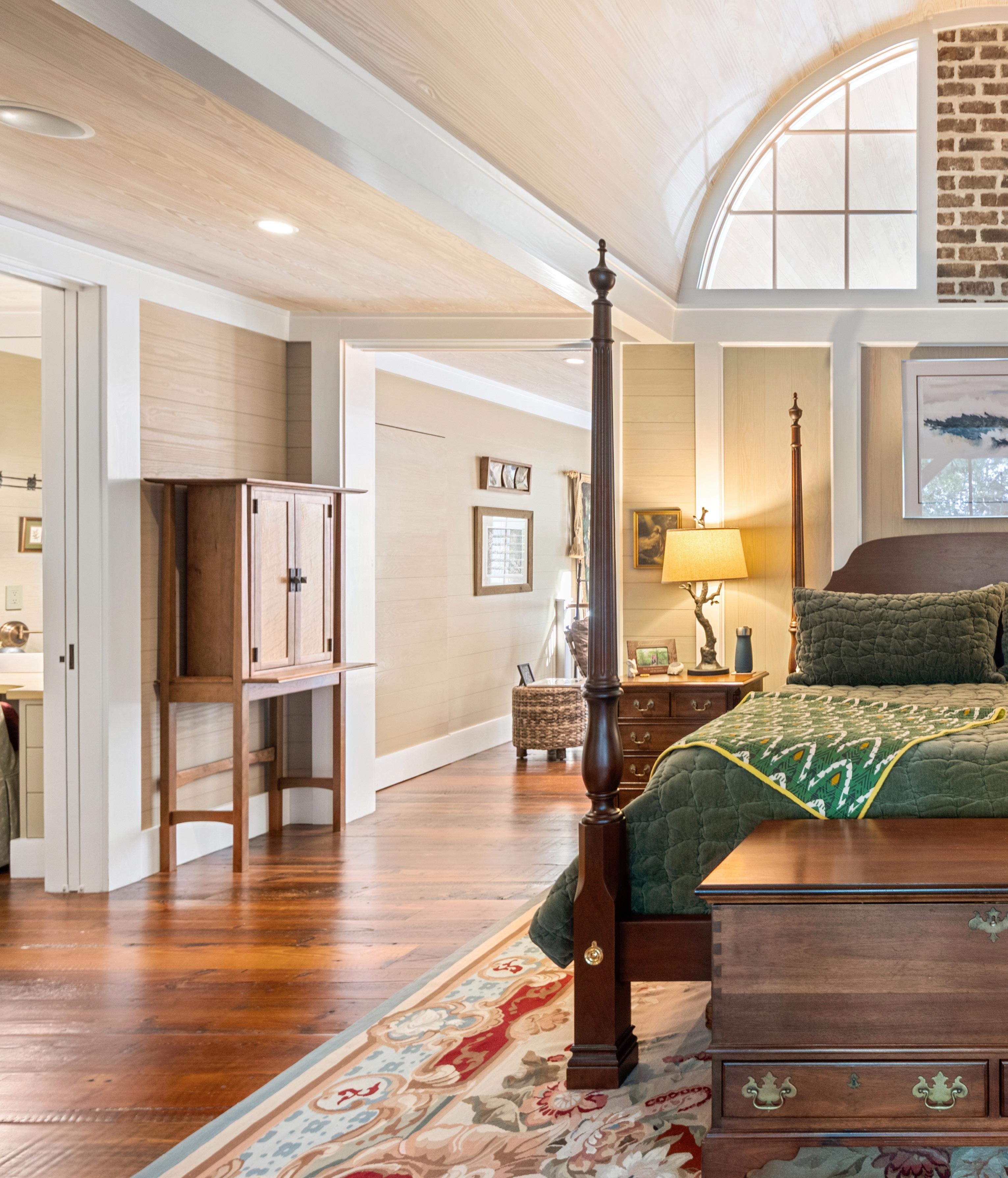 This exquisite primary suite is a private sanctuary that embodies timeless Southern grace. Vaulted ceilings with natural wood tones and arched transom windows fill the space with soft, natural light, creating a serene and airy retreat. A stately brick fireplace adds warmth and character, complementing the rich hardwood floors that flow seamlessly throughout.