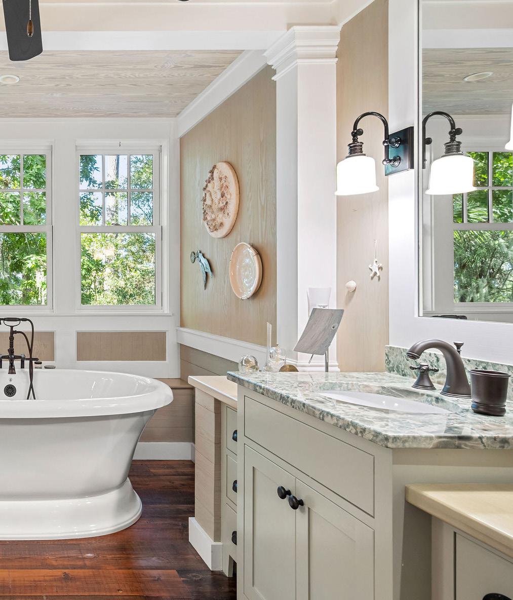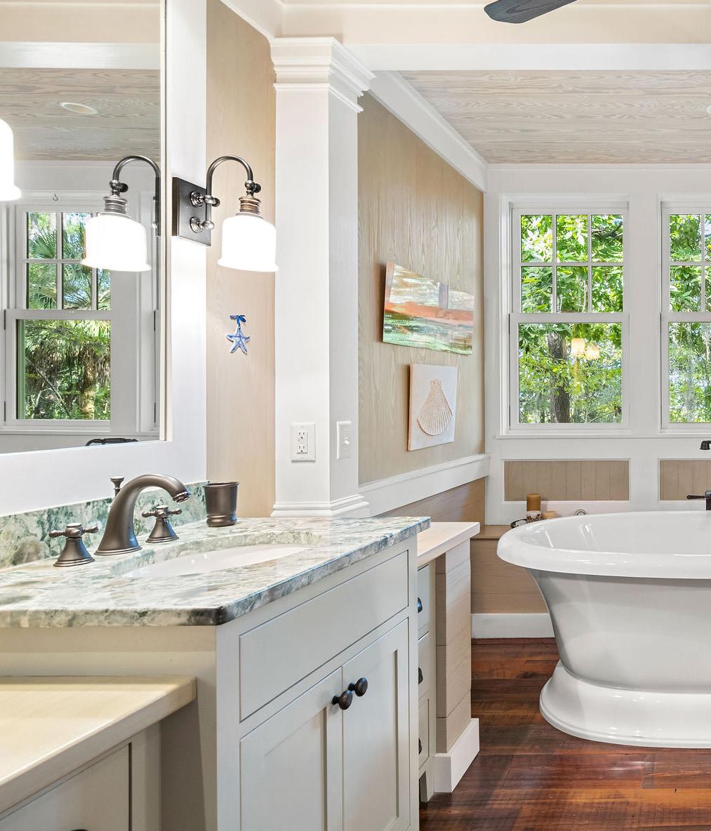 French doors open to a charming screened porch, inviting gentle Lowcountry breezes and views of the lush landscape beyond. The spa-inspired bathroom is a study in sophistication, featuring dual vanities with the same richly veined stone used in the kitchen—its organic patterns mirroring the surrounding marsh— with a stunning freestanding soaking tub framed by picture windows. A spacious, custom-designed walk-in closet completes the suite—a harmonious blend of function, elegance, and everyday luxury.